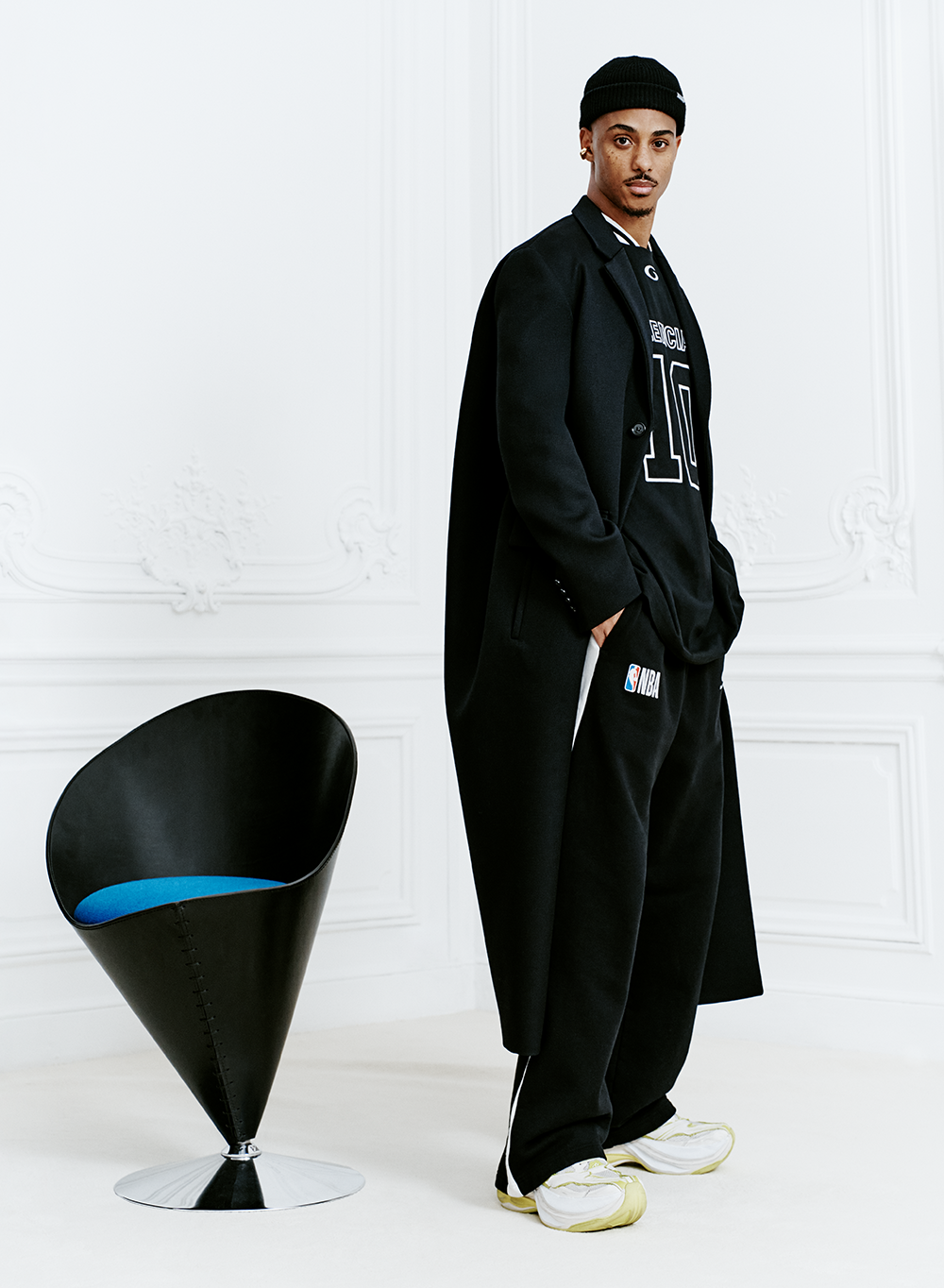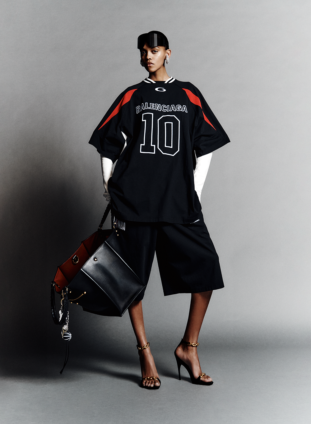 BALENCIAGA I NBA 联名系列推出一系列以篮球运动为灵感的单品,并将品牌基因贯穿其中。本系列包含长短袖 T恤、运动套装、棒球衫与教练夹克,采用皮革、尼龙缎布、再生棉府绸及日本丹宁等传统面料打造。所有单品均饰有数字「10」—— 即「le dix」,源自品牌传奇诞生地巴黎乔治五世大道 10 号。