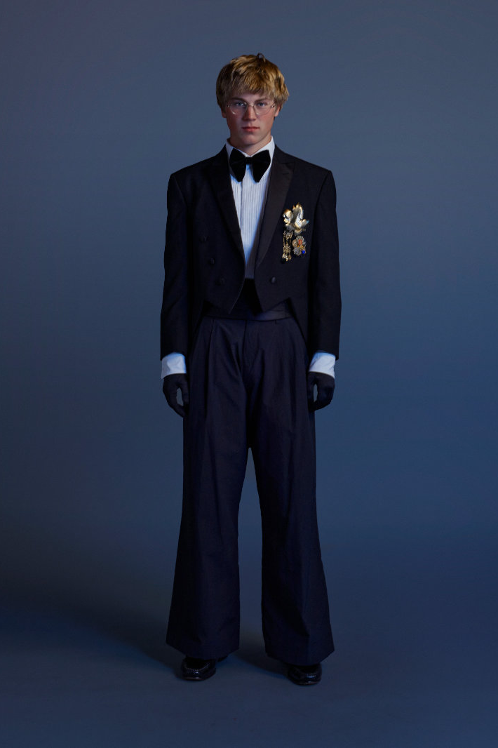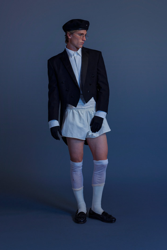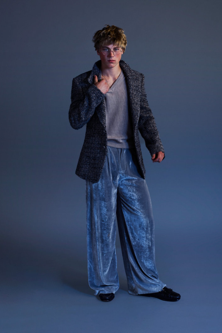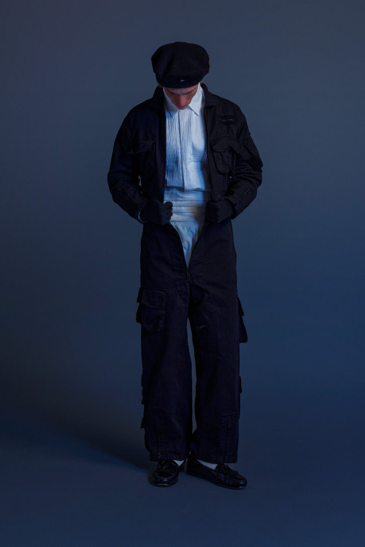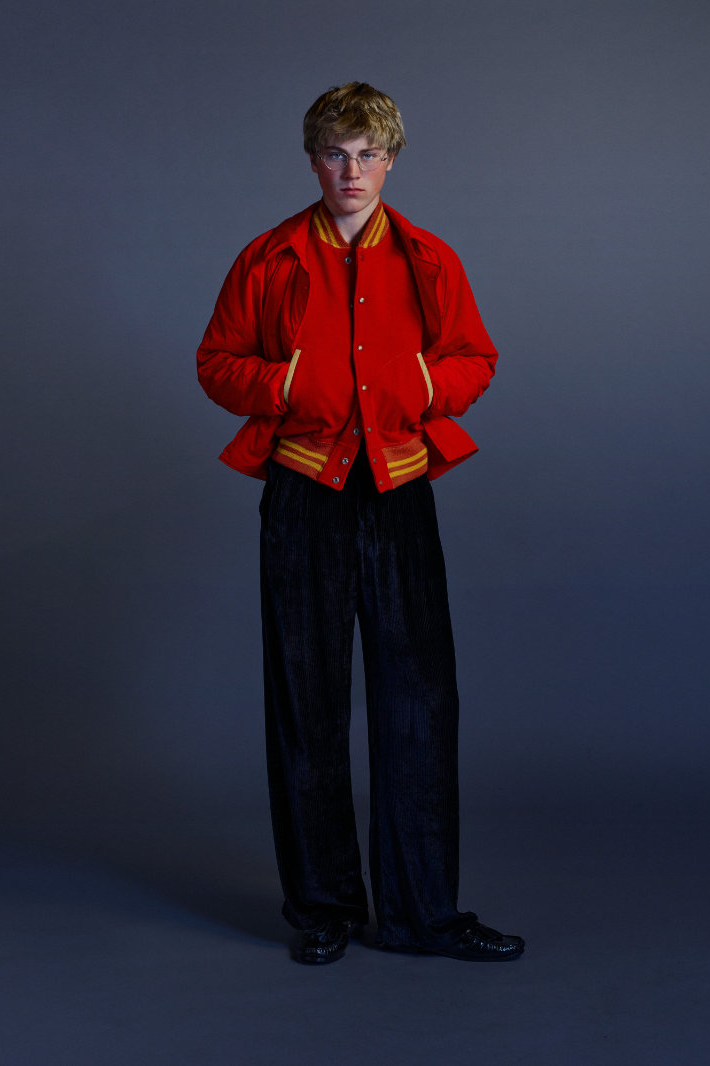 与此同时,Eli Russell Linnetz 依然钟情于矛盾。尼龙面料渗透到剪裁考究的服装中,工装夹克与冲浪文化交相辉映,权威的象征与机车夹克和红色皮质棒球衫碰撞出火花。晚装也同样被颠覆:飞行服取代了燕尾服,天鹅绒长裤与运动感十足的服饰并肩而立。整个系列探讨了角色互换、服饰借用和等级制度的变迁。Eli Russell Linnetz 将对制度的反思转化为视觉语言,并隐约以一种对抗性的方式呈现。