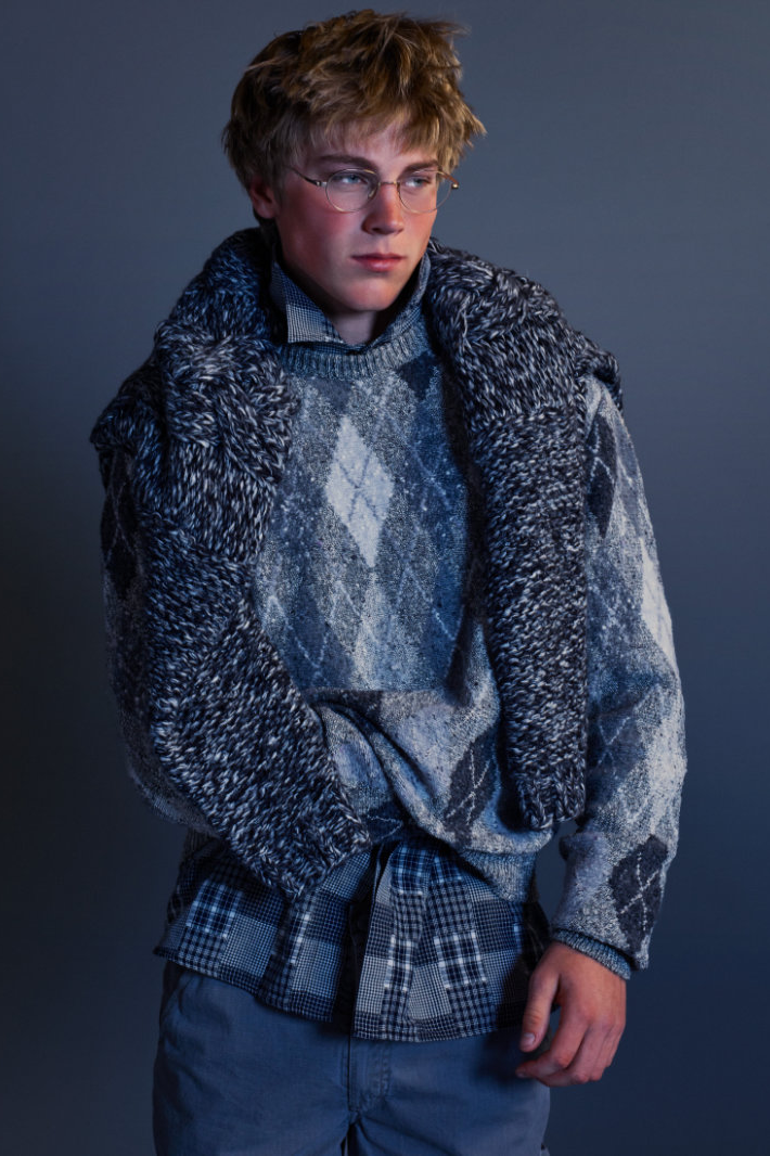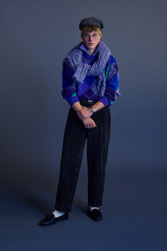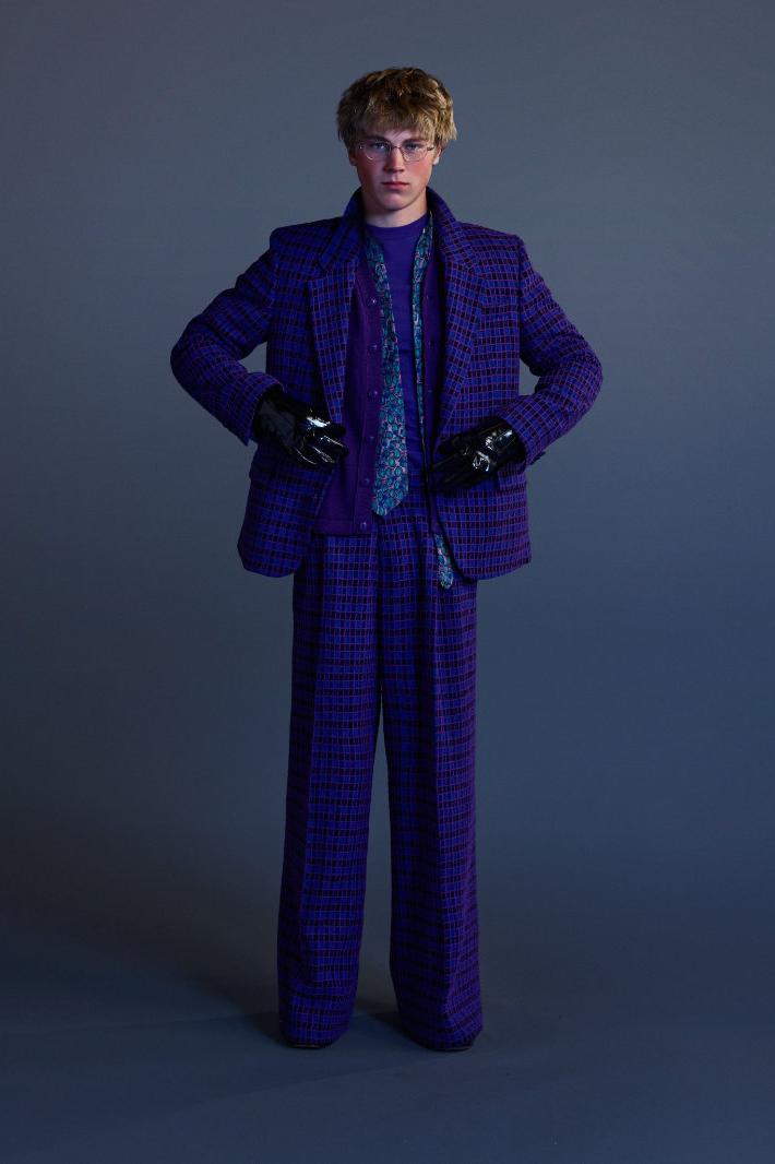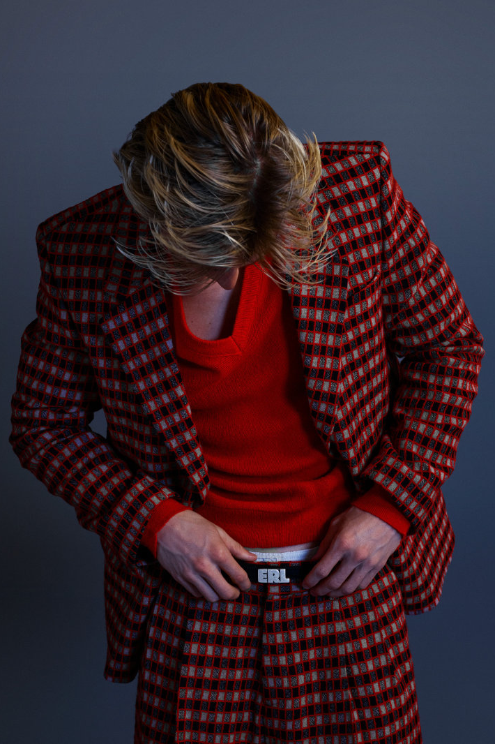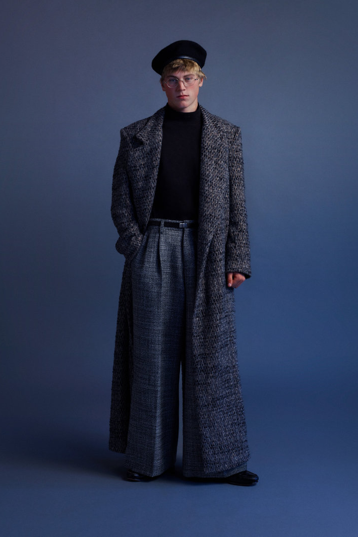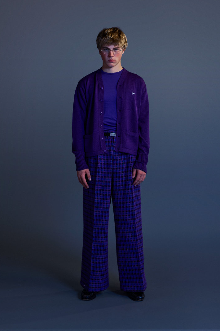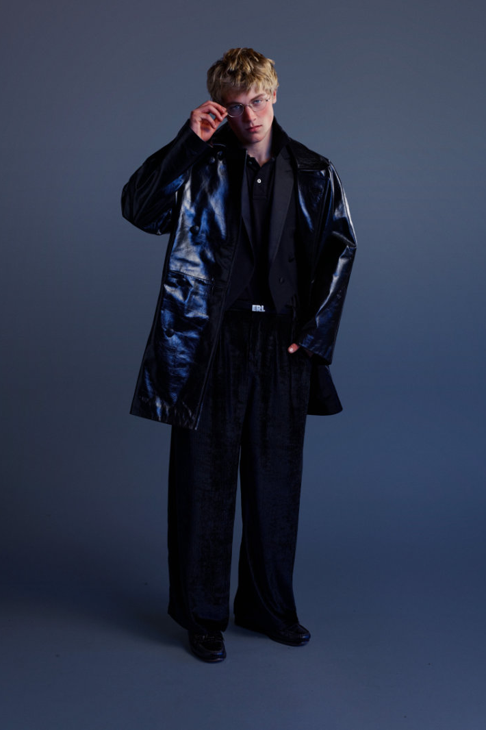 ERL 2026 秋冬系列在巴黎时装周上正式亮相。与其以往常见的威尼斯海滩风格截然不同,名为「The Void(虚空)」的该系列标志着 ERL 走向成熟。在这一季,剪裁主导了整体风格。质感丰富的羊毛西装外套和大衣、深红色和紫色的华夫格纹以及灰色粗花呢套装,无一不唤起我们对上世纪 80 年代权力着装美学的记忆。菱格纹针织衫、天鹅绒长裤、精致牛津衬衫以及珠宝的引入,都预示着品牌向优雅的转变。