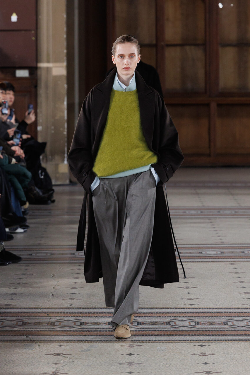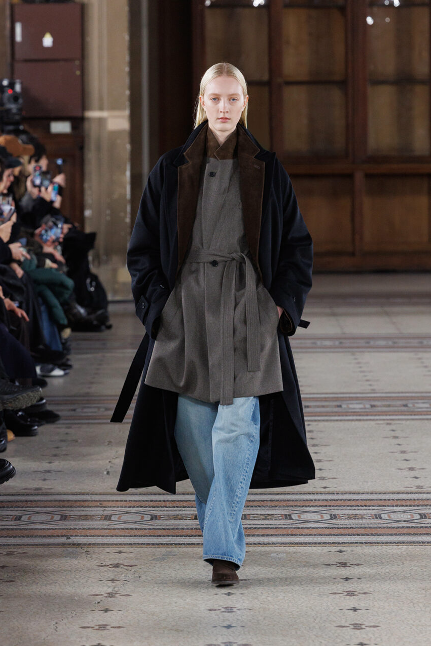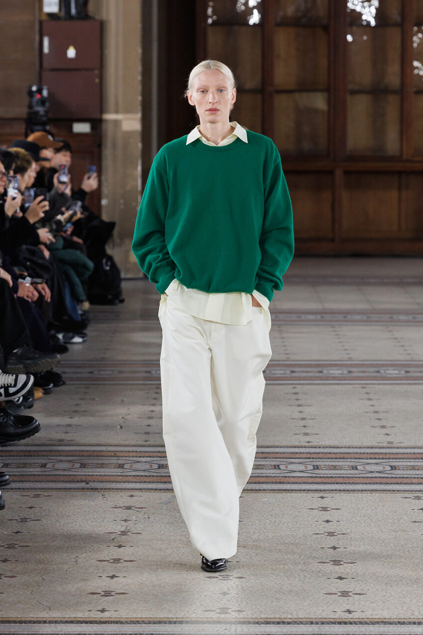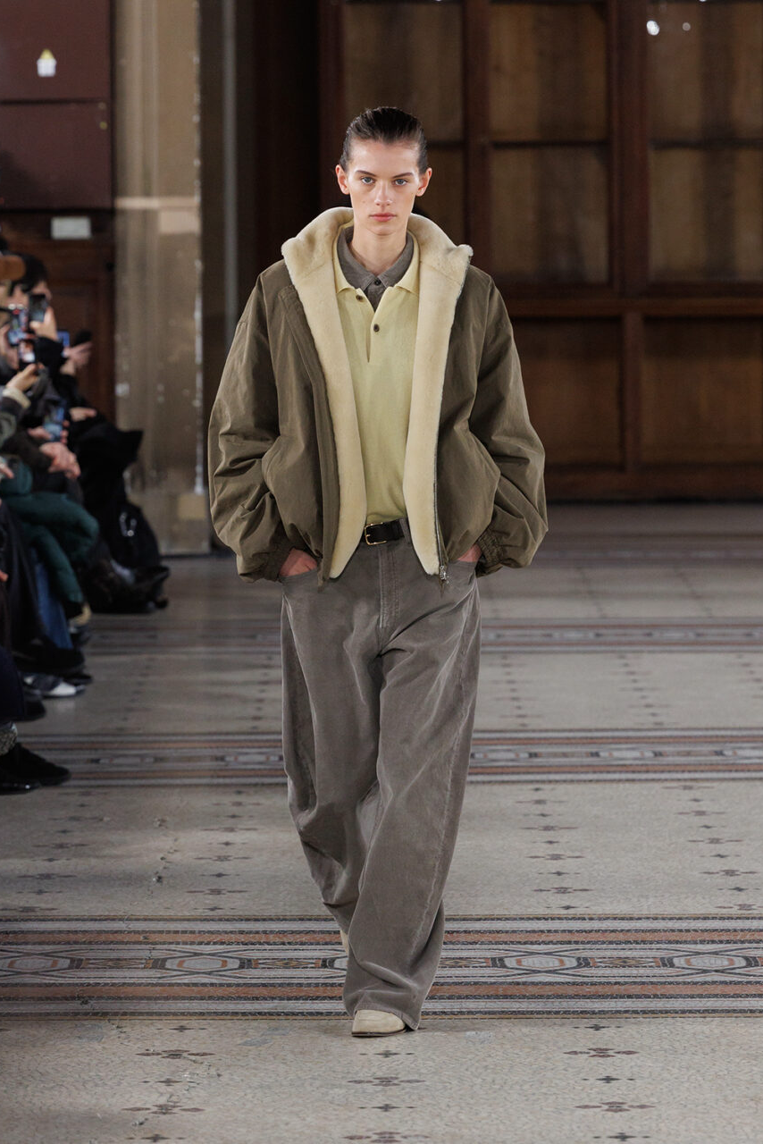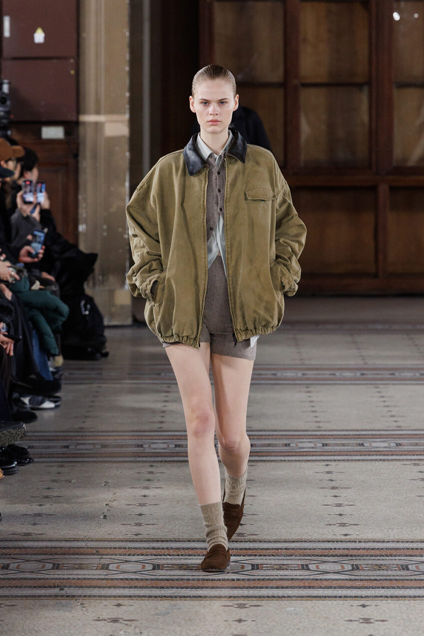 廓形方面巧妙地致敬了 20 世纪 40 年代:高腰褶裥长裤自然垂落至脚踝,马海毛橄榄球衫则饰以学院风条纹;拉绒羊毛大衣采用插肩袖设计,廓形柔软,收腰时几乎呈现出褶裥的效果。此外,双缝肩部设计巧妙地平衡了结构感和舒适度,既保持了廓形,又避免了垫肩带来的僵硬感。叠穿是本季的关键,从层层叠叠的领子到超大拉链袖口露出撞色内衬的飞行员夹克,无不体现着这一点。