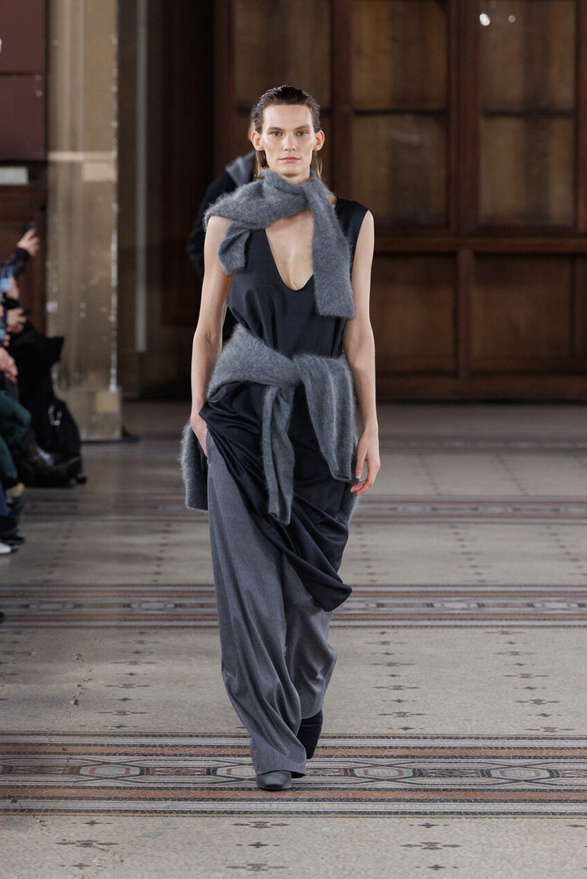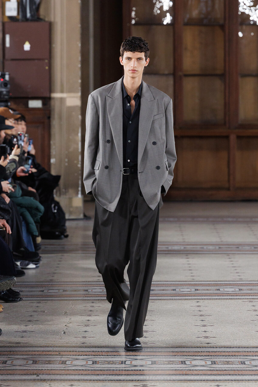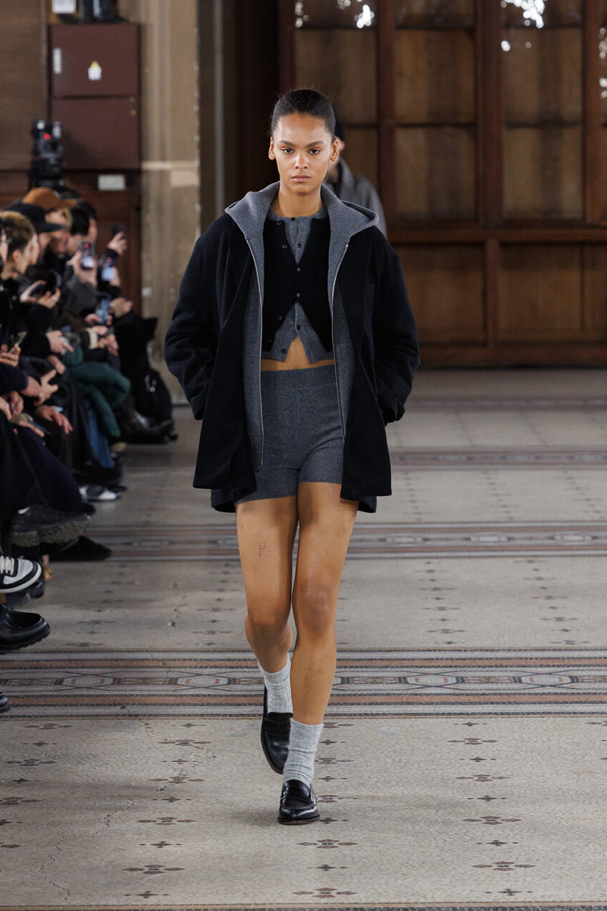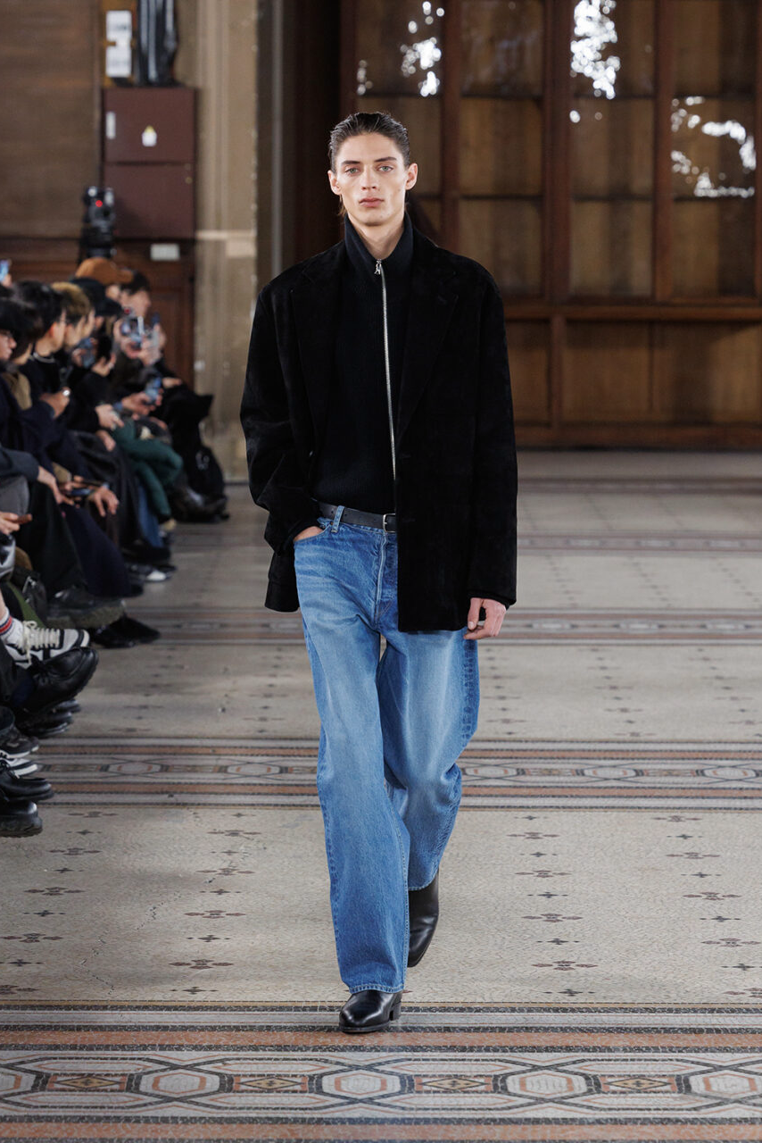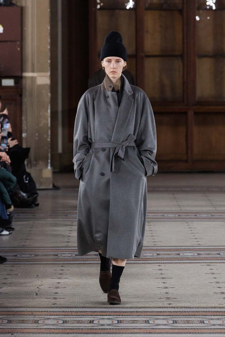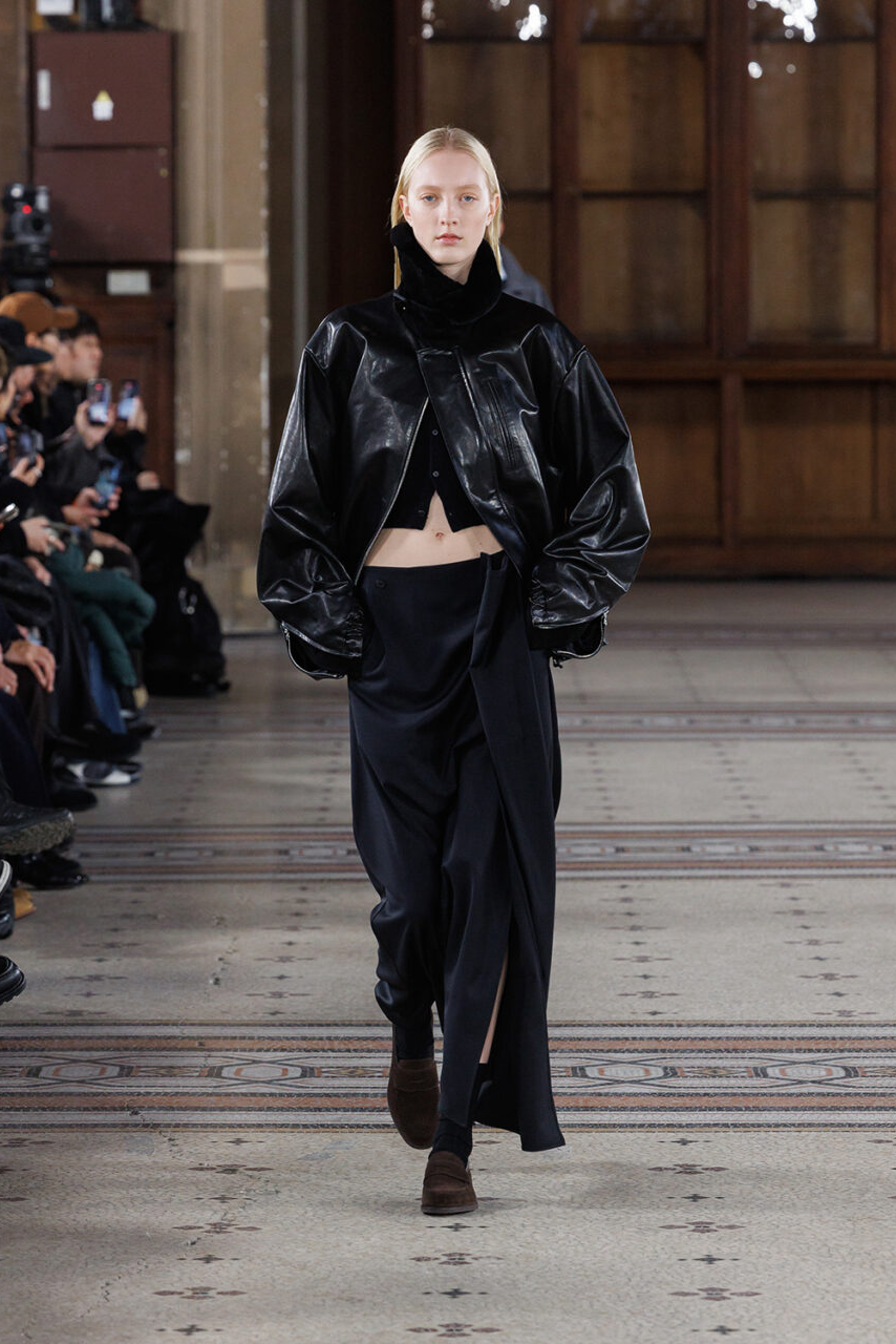 廓形方面巧妙地致敬了 20 世纪 40 年代:高腰褶裥长裤自然垂落至脚踝,马海毛橄榄球衫则饰以学院风条纹;拉绒羊毛大衣采用插肩袖设计,廓形柔软,收腰时几乎呈现出褶裥的效果。此外,双缝肩部设计巧妙地平衡了结构感和舒适度,既保持了廓形,又避免了垫肩带来的僵硬感。叠穿是本季的关键,从层层叠叠的领子到超大拉链袖口露出撞色内衬的飞行员夹克,无不体现着这一点。