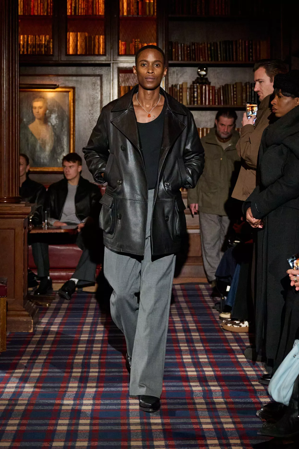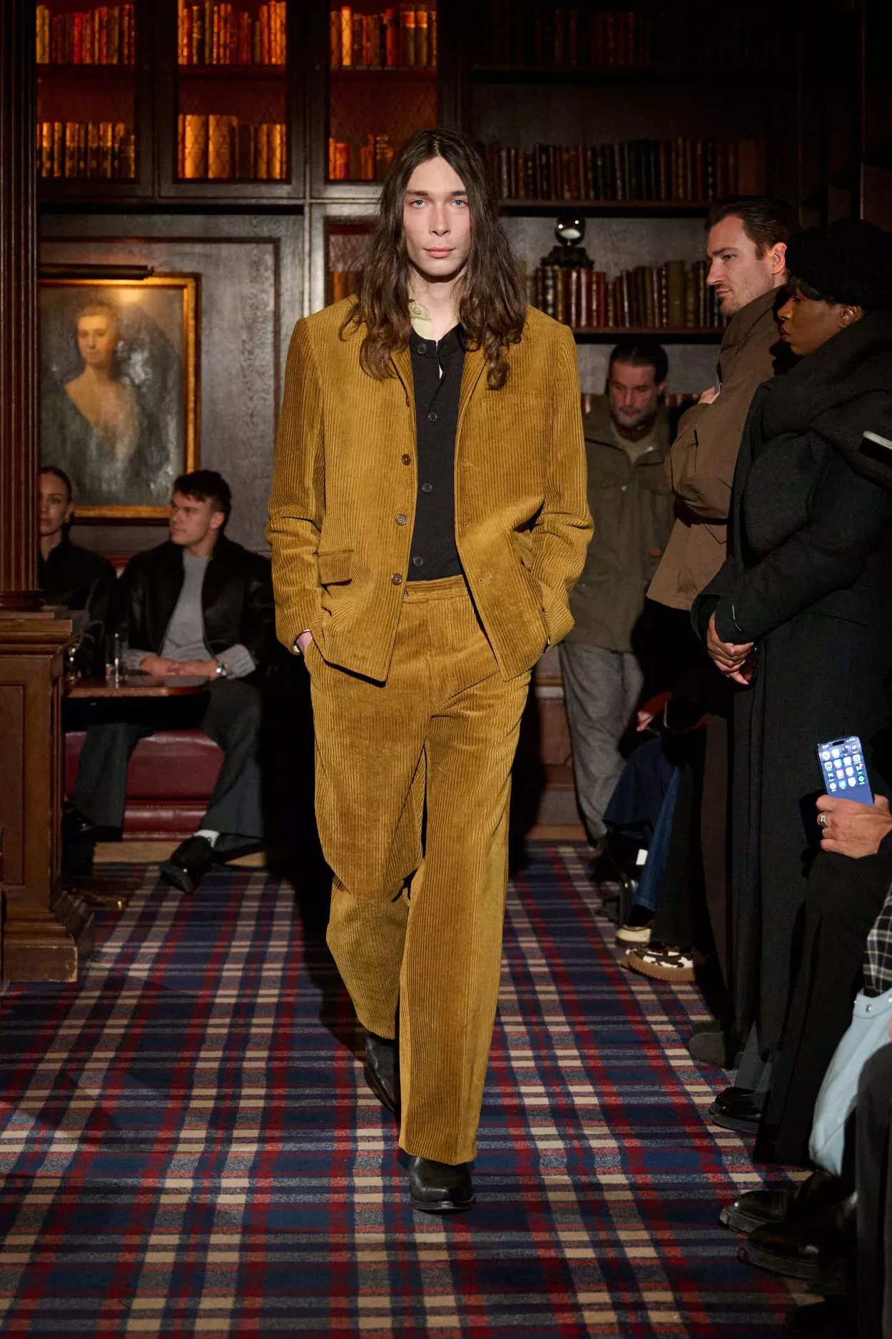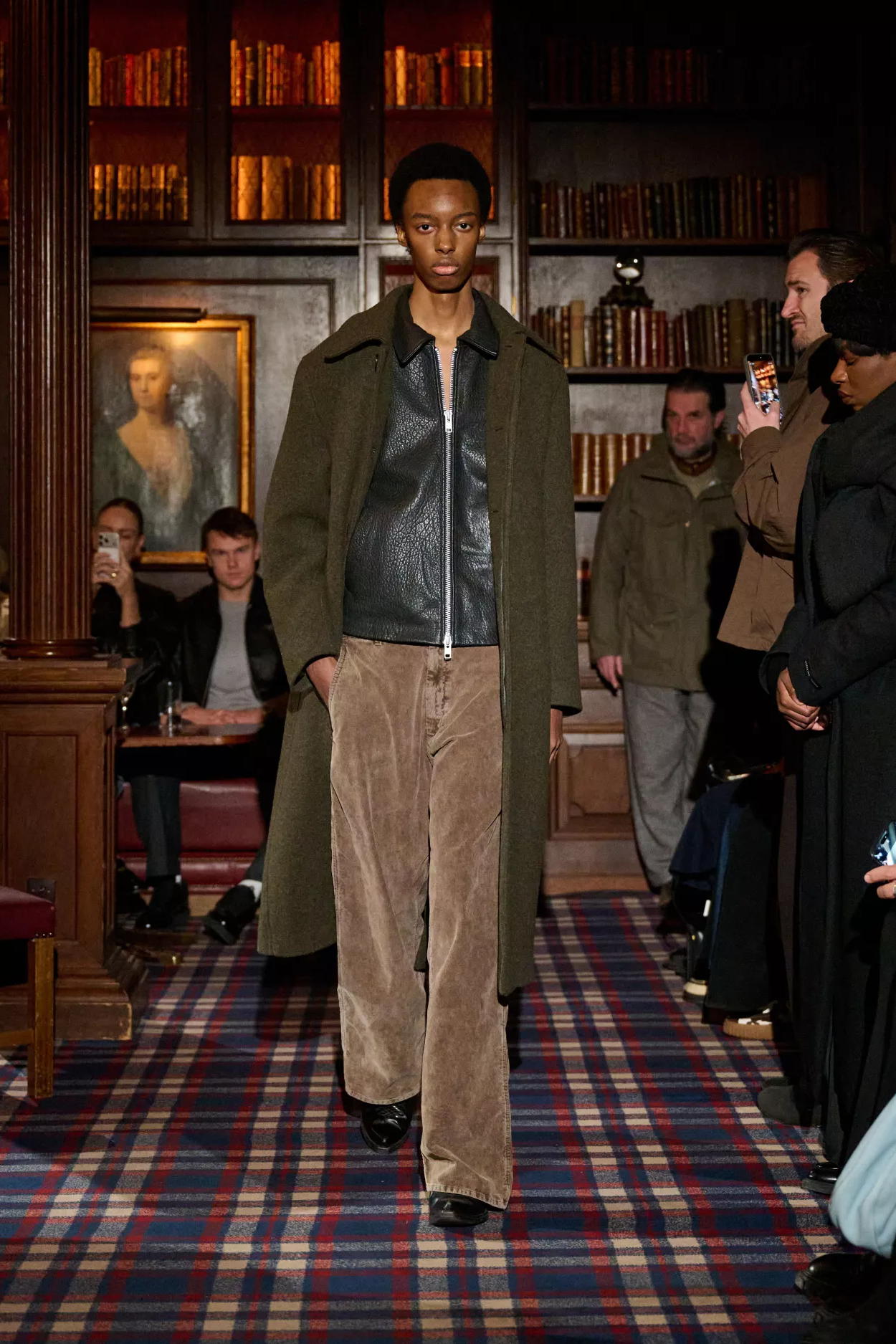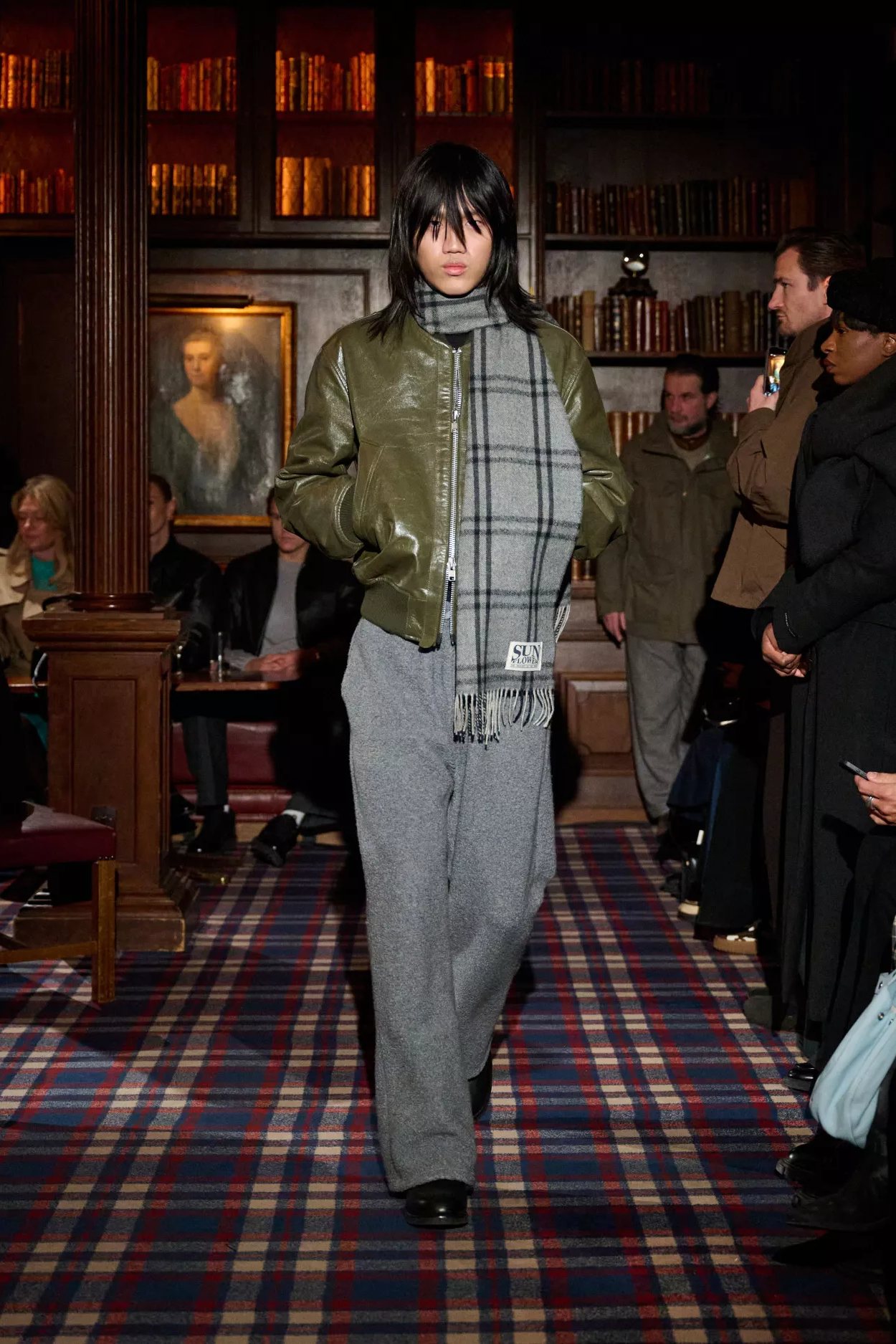 Sunflower 对皮夹克的设计驾轻就熟,本季新品也毫不逊色。简约的飞行员夹克几乎可以完美融入任何风格,质感柔滑的中长款风衣引人注目,棕色灯芯绒西装与以木质元素为主的秀场空间相得益彰,完美契合了 90 年代悠闲绅士的风格。