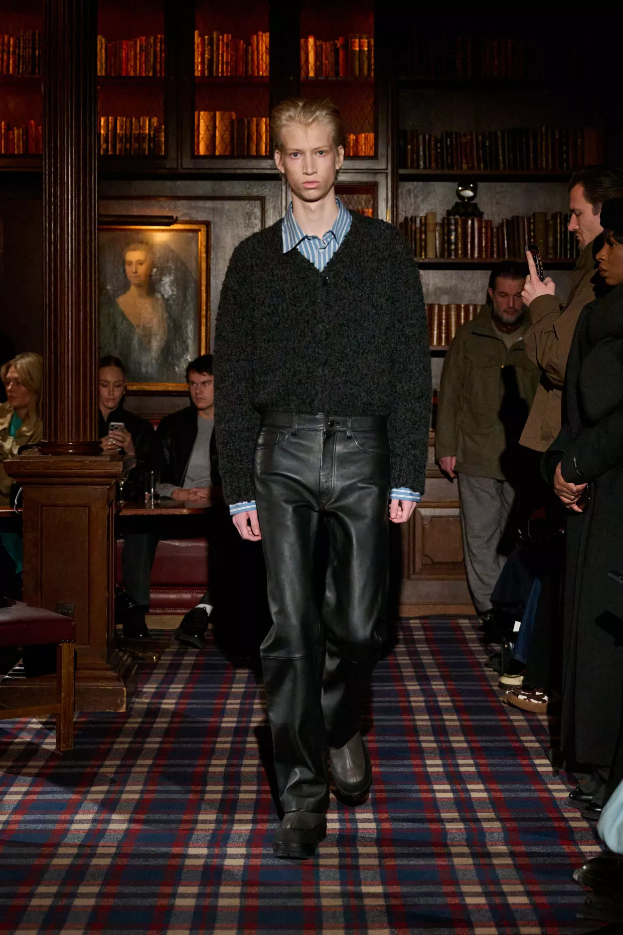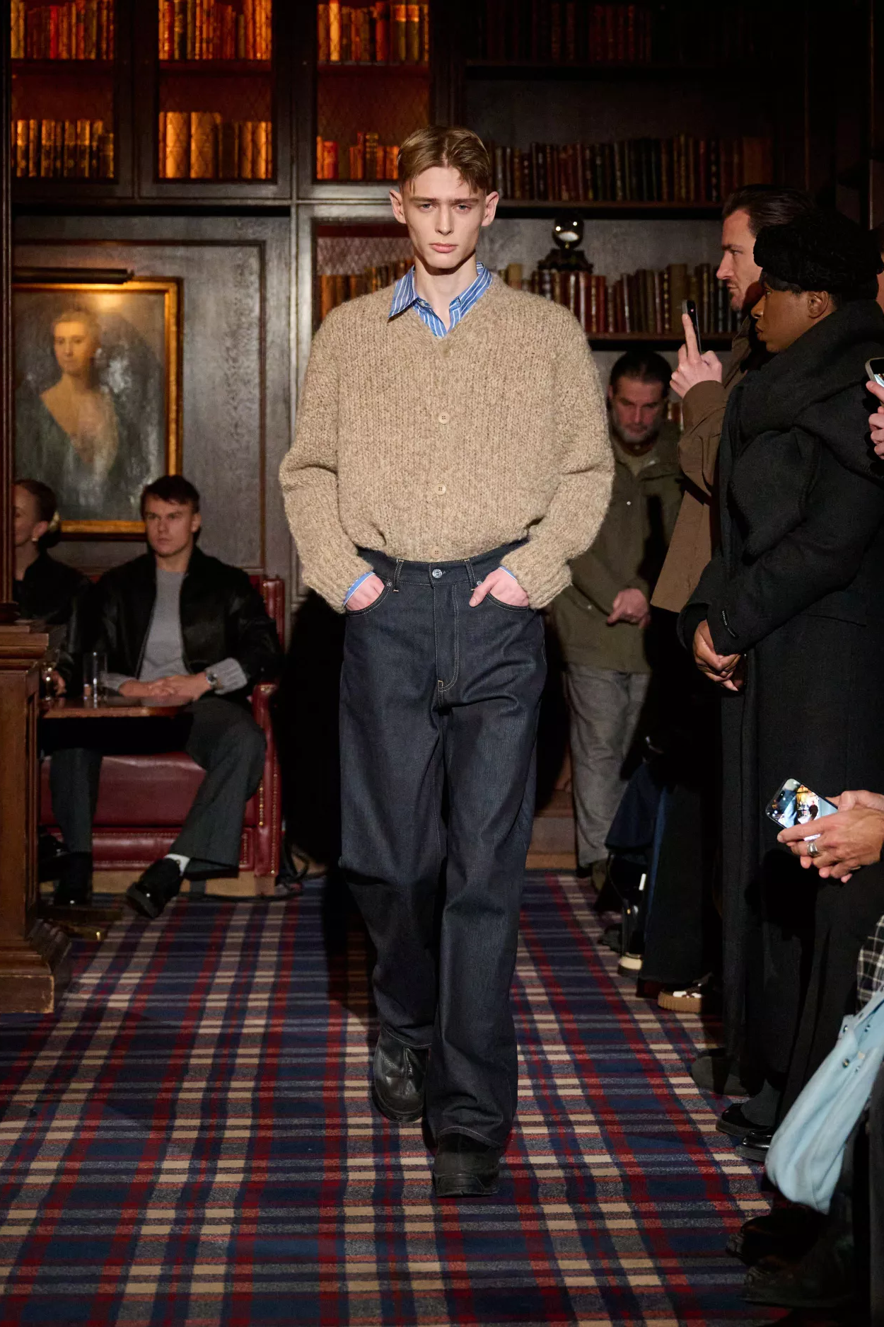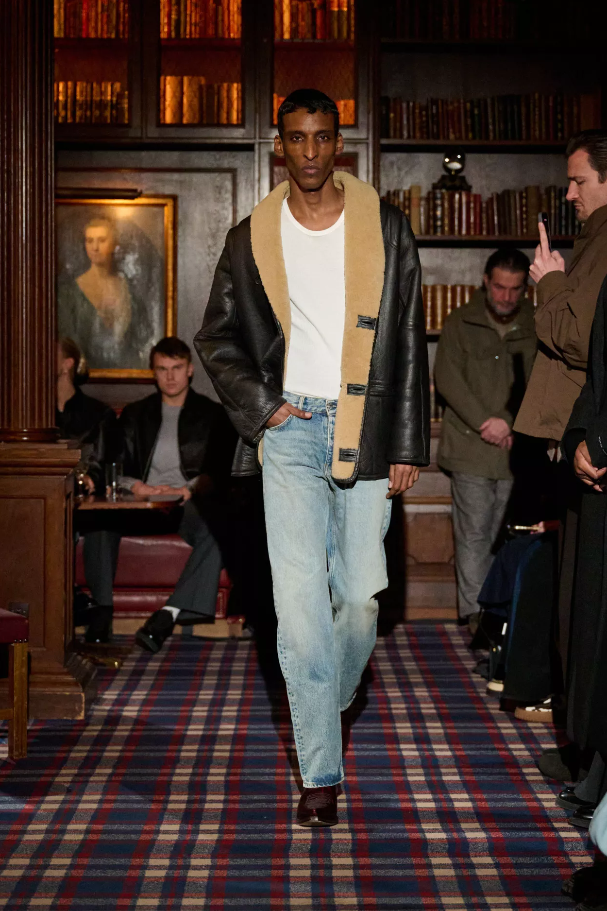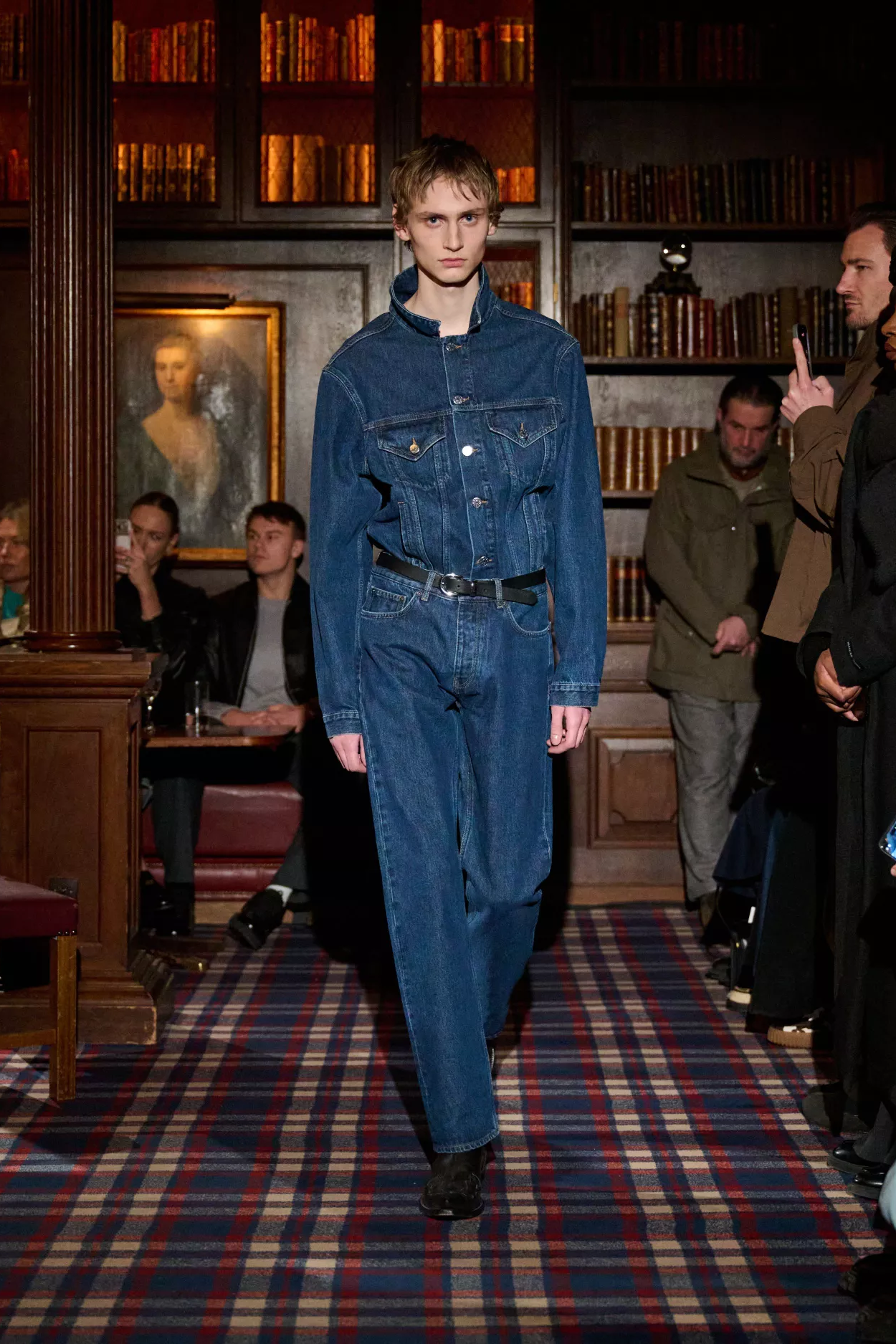 Sunflower 2026 秋冬秀在一家图书馆酒吧中落幕,为哥本哈根时装周画上了圆满的句号。在 2026 秋冬系列中,Sunflower 对其标志性的廓形进行了革新。以往以喇叭裤或微喇裤搭配宽肩西装外套为主,本季则转向了更为流畅的 90 年代早期风格。以牛仔裤为例,其版型略似水洗过的 501 牛仔裤介于紧身和直筒之间,并采用经典的中腰设计。Ulrik Pedersen 称「基本上是将牛仔裤带回了它的起源」。长裤也同样采用了修身剪裁,并搭配高腰设计,例如束腰衬衫或鲑鱼粉或钴蓝色的修身针织衫,整体造型正如 Pedersen 所描述的那样,增添了一丝柔和感。