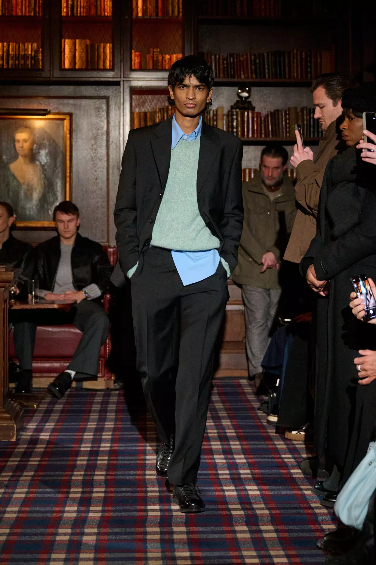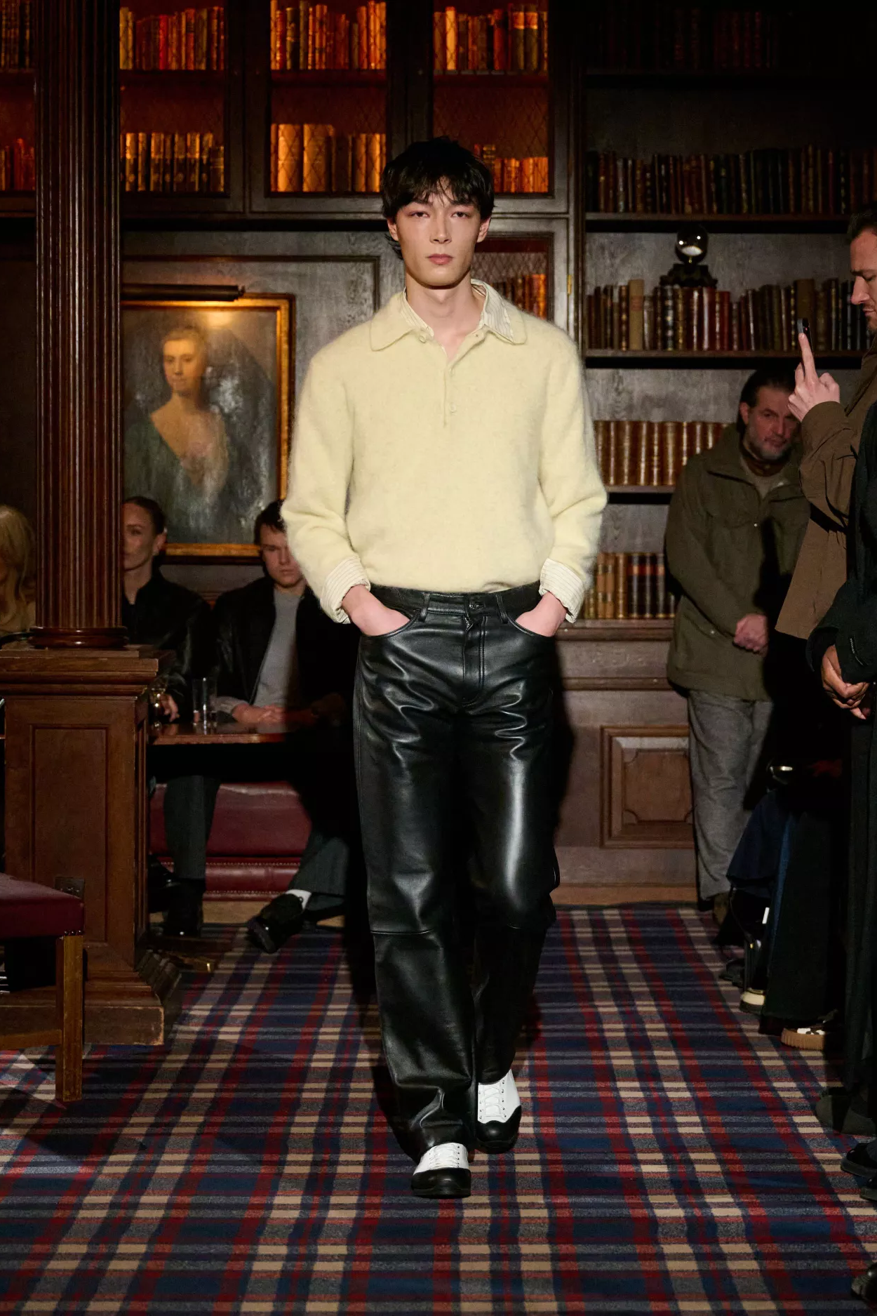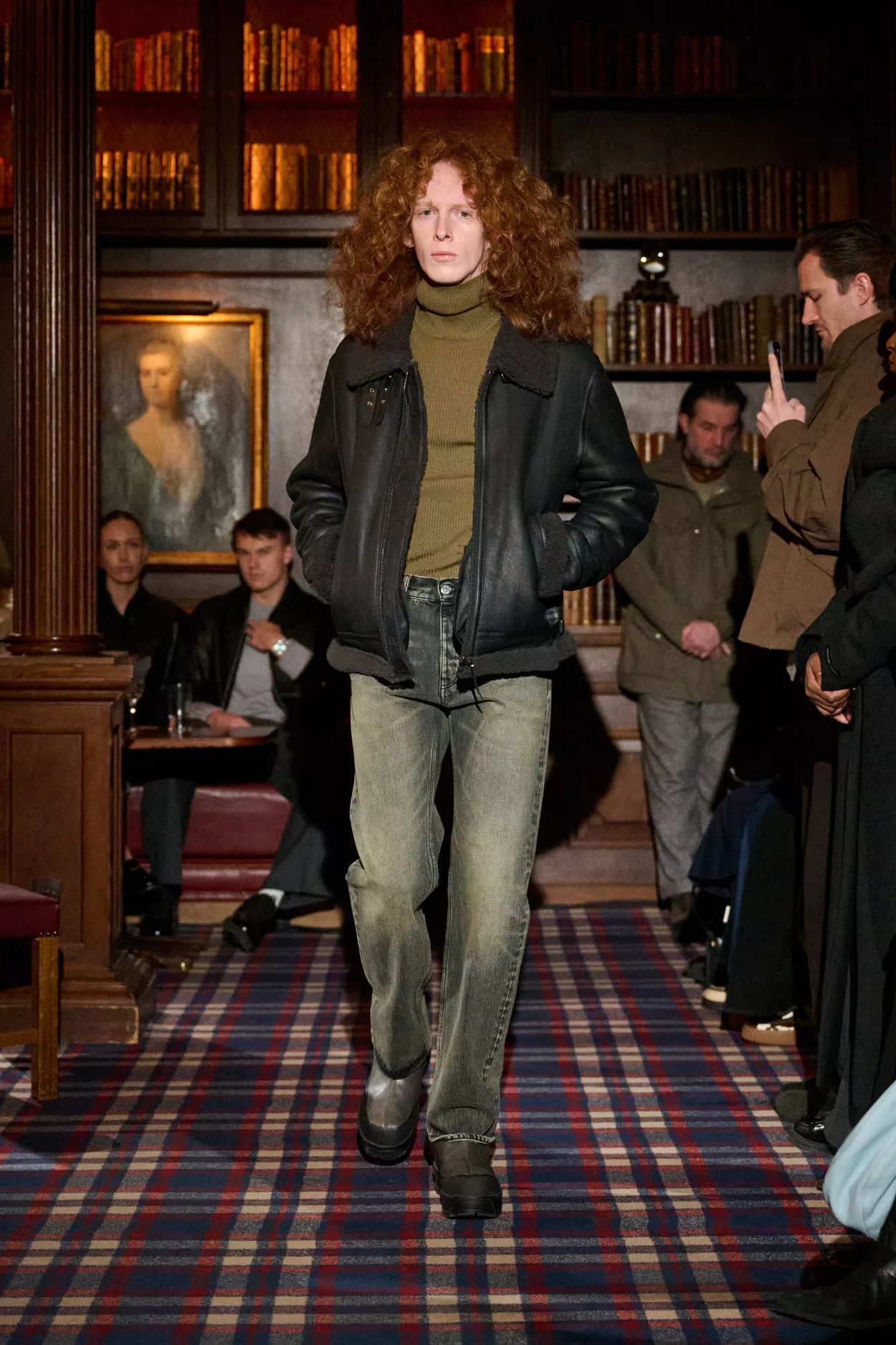 Sunflower 2026 秋冬秀在一家图书馆酒吧中落幕,为哥本哈根时装周画上了圆满的句号。在 2026 秋冬系列中,Sunflower 对其标志性的廓形进行了革新。以往以喇叭裤或微喇裤搭配宽肩西装外套为主,本季则转向了更为流畅的 90 年代早期风格。以牛仔裤为例,其版型略似水洗过的 501 牛仔裤介于紧身和直筒之间,并采用经典的中腰设计。Ulrik Pedersen 称「基本上是将牛仔裤带回了它的起源」。长裤也同样采用了修身剪裁,并搭配高腰设计,例如束腰衬衫或鲑鱼粉或钴蓝色的修身针织衫,整体造型正如 Pedersen 所描述的那样,增添了一丝柔和感。