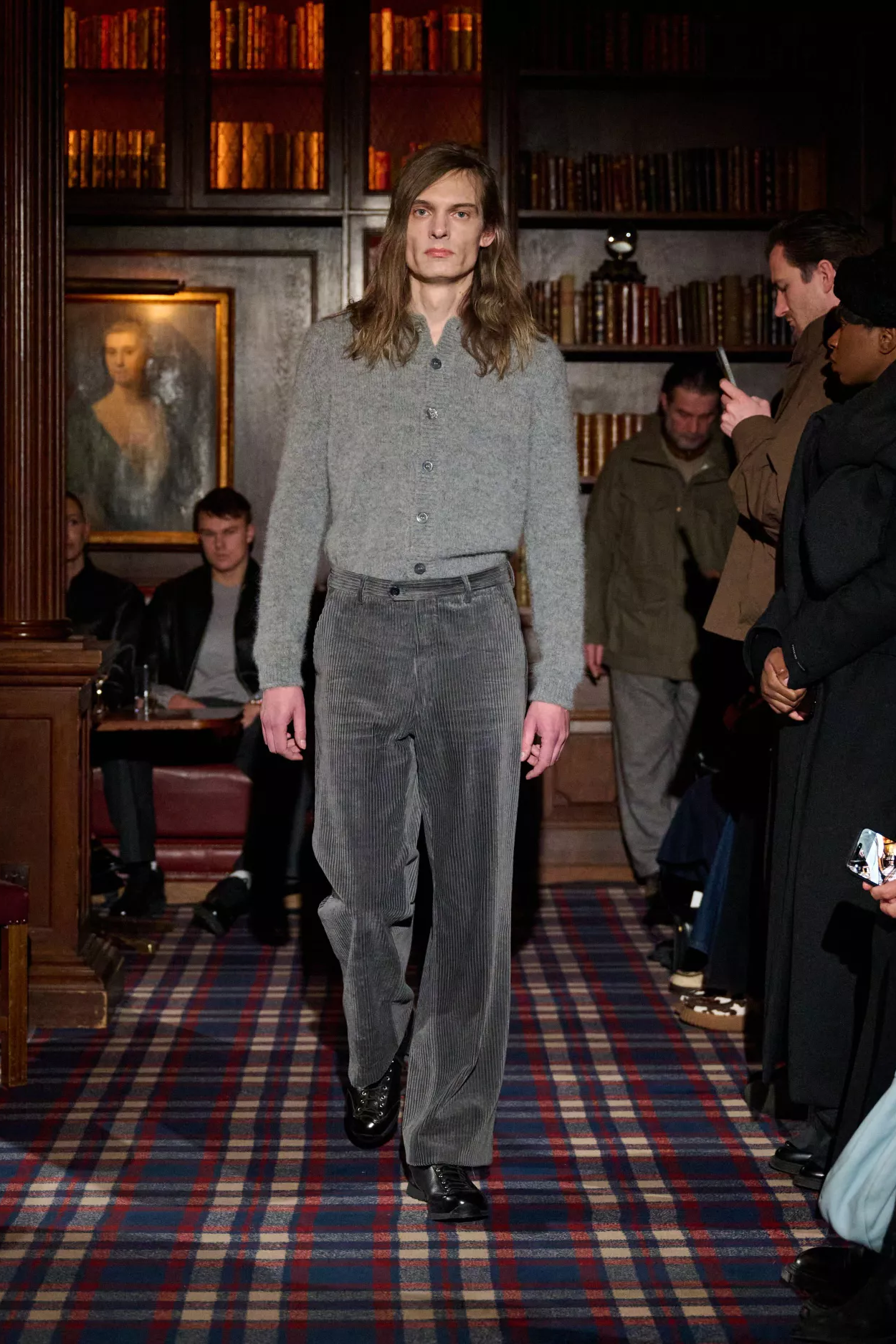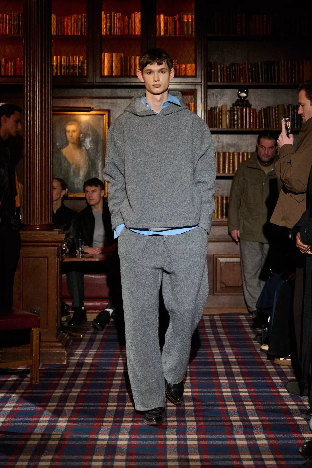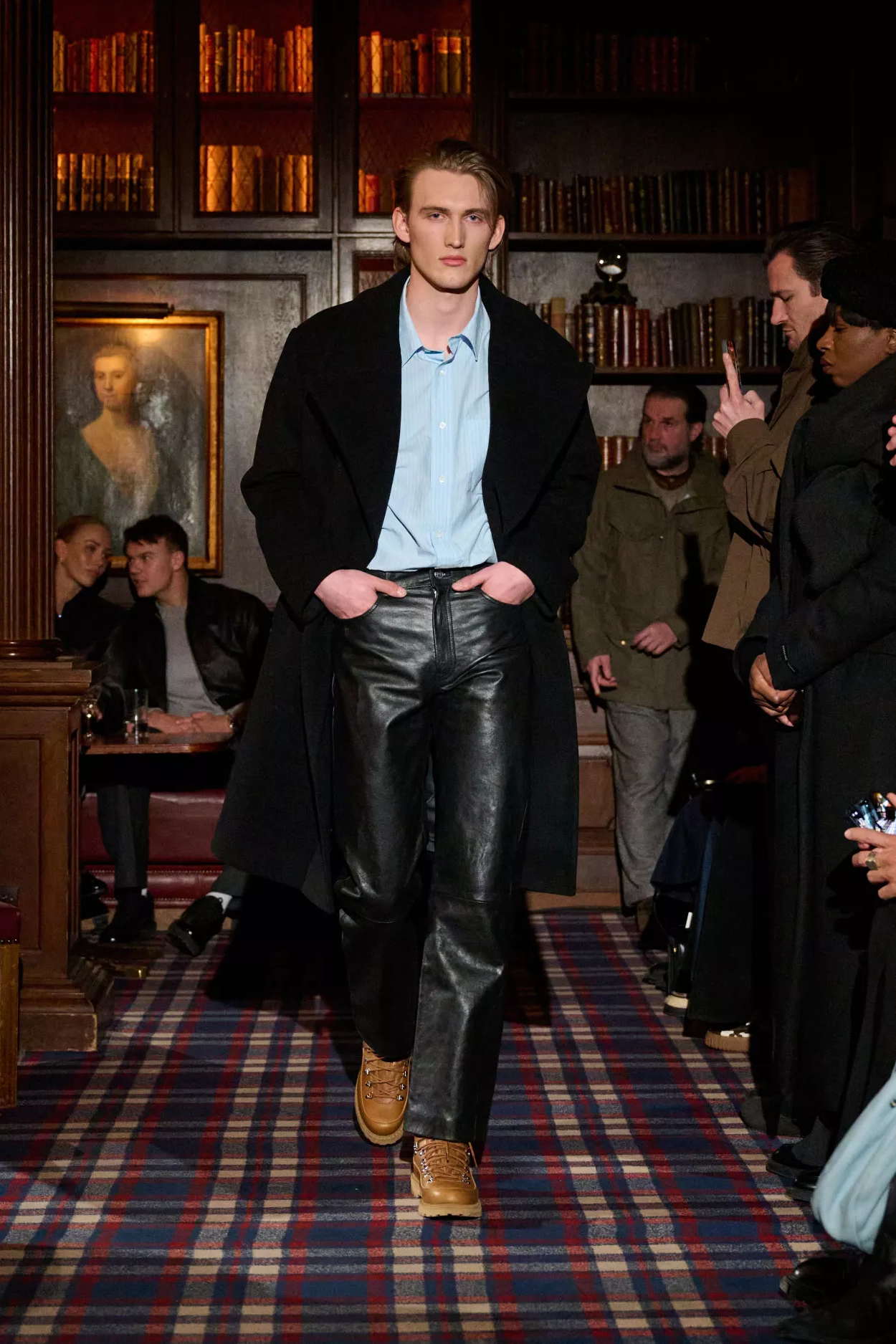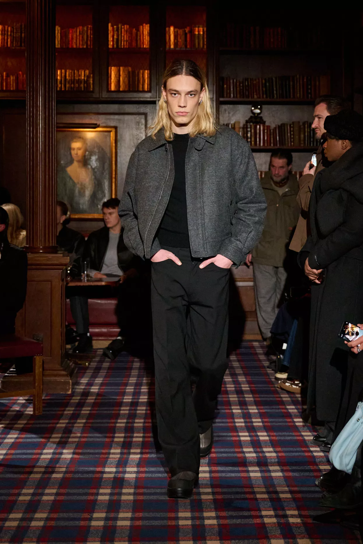 Sunflower 2026 秋冬秀在一家图书馆酒吧中落幕,为哥本哈根时装周画上了圆满的句号。在 2026 秋冬系列中,Sunflower 对其标志性的廓形进行了革新。以往以喇叭裤或微喇裤搭配宽肩西装外套为主,本季则转向了更为流畅的 90 年代早期风格。以牛仔裤为例,其版型略似水洗过的 501 牛仔裤介于紧身和直筒之间,并采用经典的中腰设计。Ulrik Pedersen 称「基本上是将牛仔裤带回了它的起源」。长裤也同样采用了修身剪裁,并搭配高腰设计,例如束腰衬衫或鲑鱼粉或钴蓝色的修身针织衫,整体造型正如 Pedersen 所描述的那样,增添了一丝柔和感。