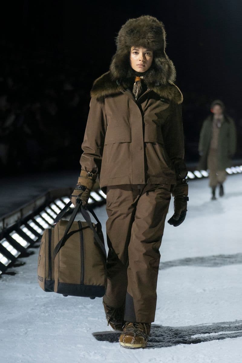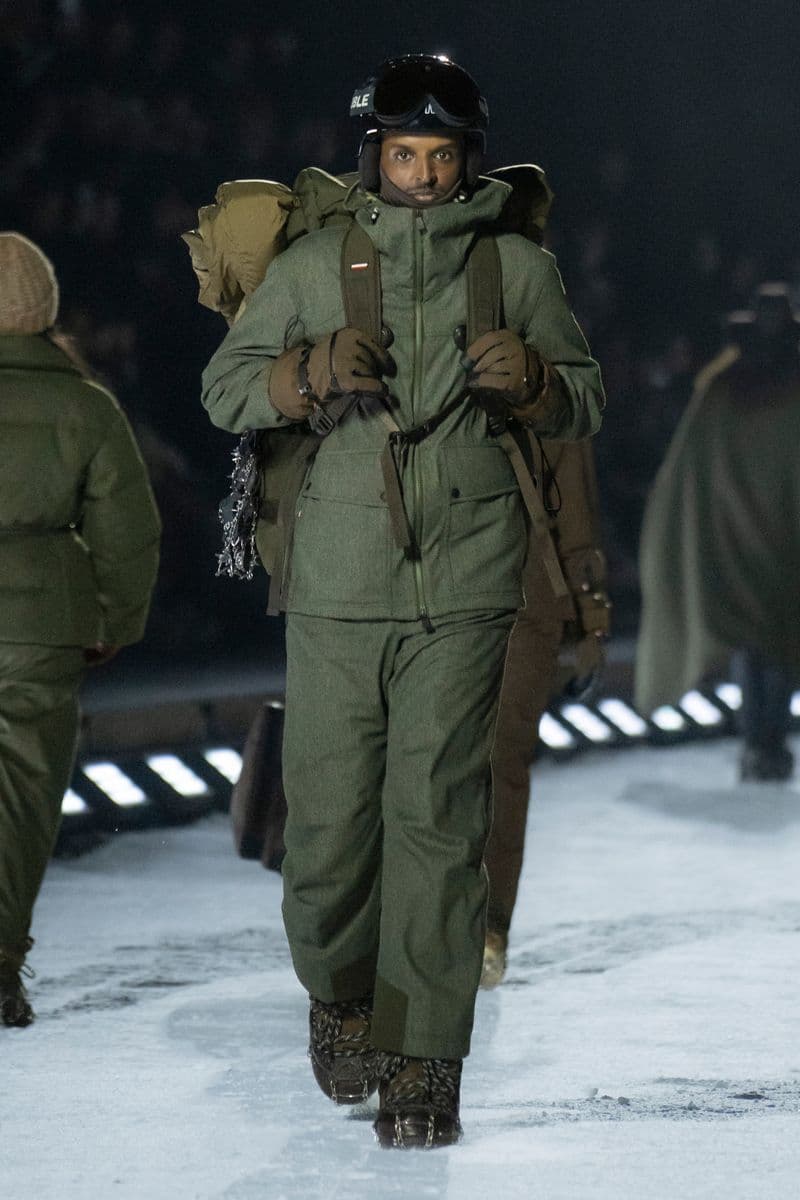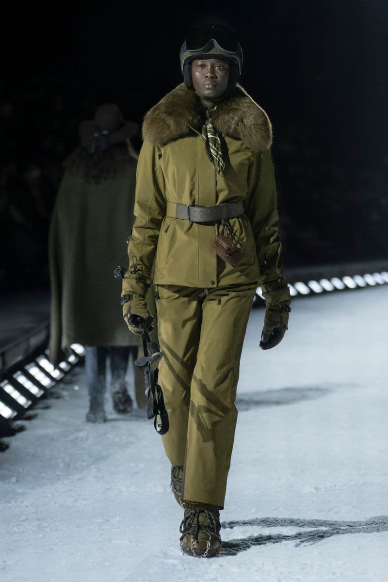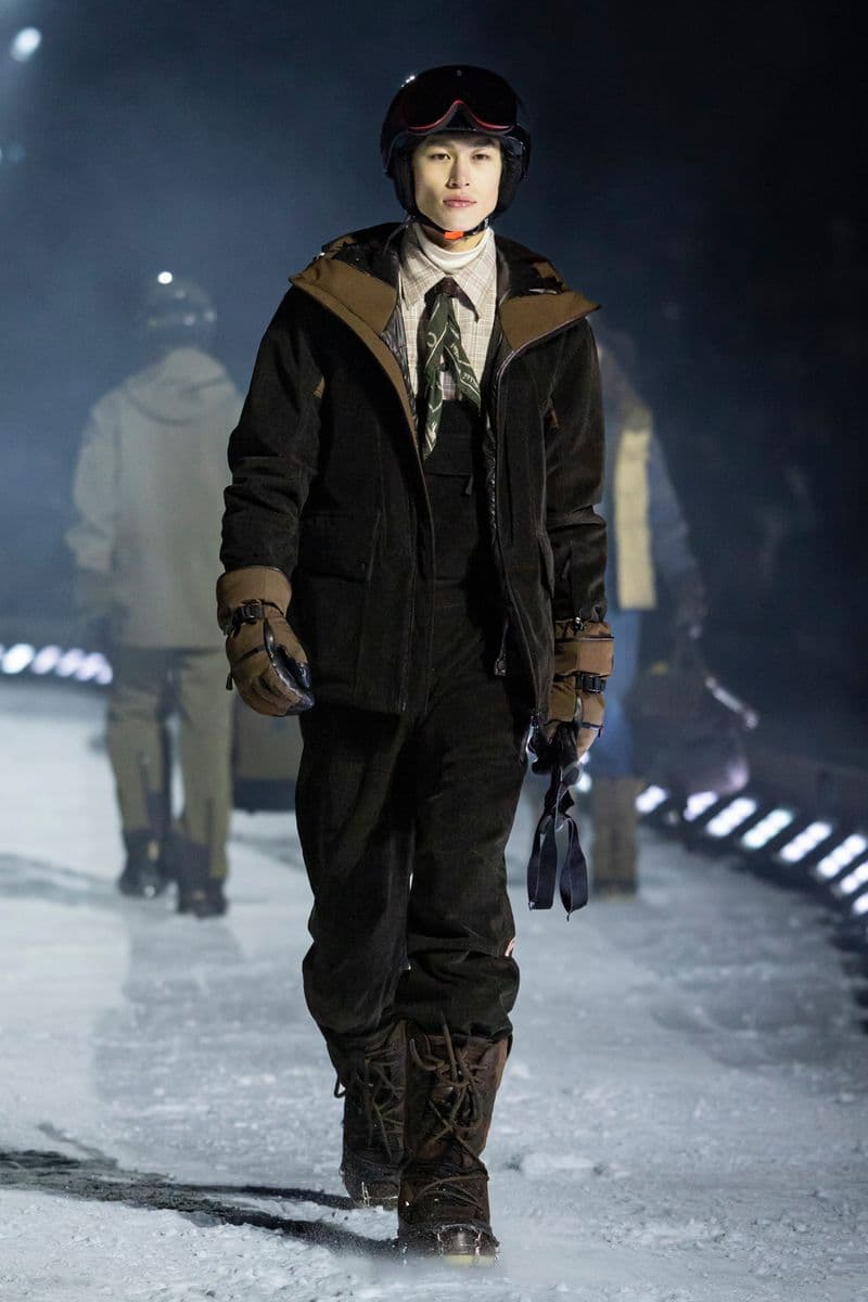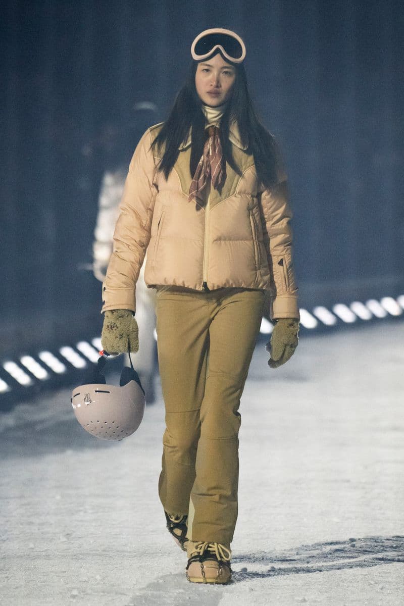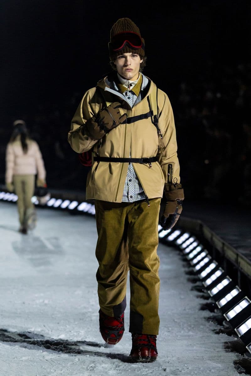 在设计层面,系列聚焦高性能外套系统的进阶演绎:多层结构羽绒服、滑雪夹克与技术大衣通过立体剪裁与分区保暖设计,实现防风、防水与轻量化的协同。功能性面料成为核心语言,结合弹性织物、技术填充与耐候材质,适应雪地、低温与高海拔条件。细节上可见大量源自专业滑雪装备的设计逻辑,如功能口袋配置、可调节结构与包裹式廓形,在保持运动机能的同时,强化整体线条的精致度与奢华感。