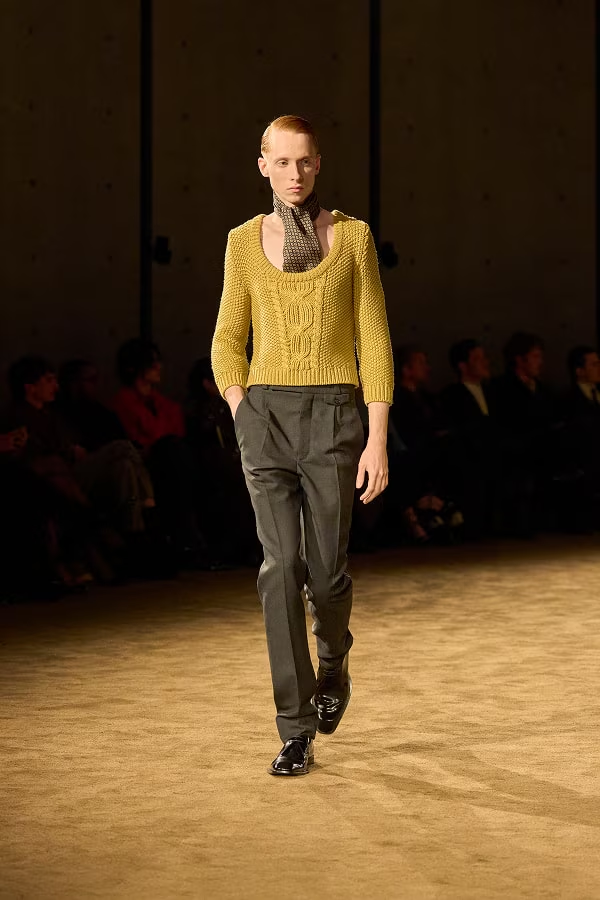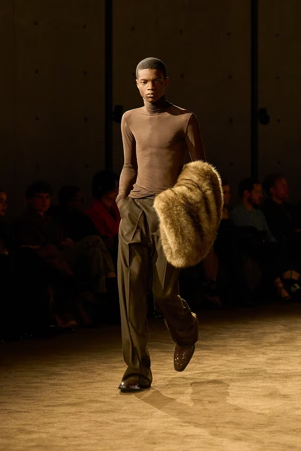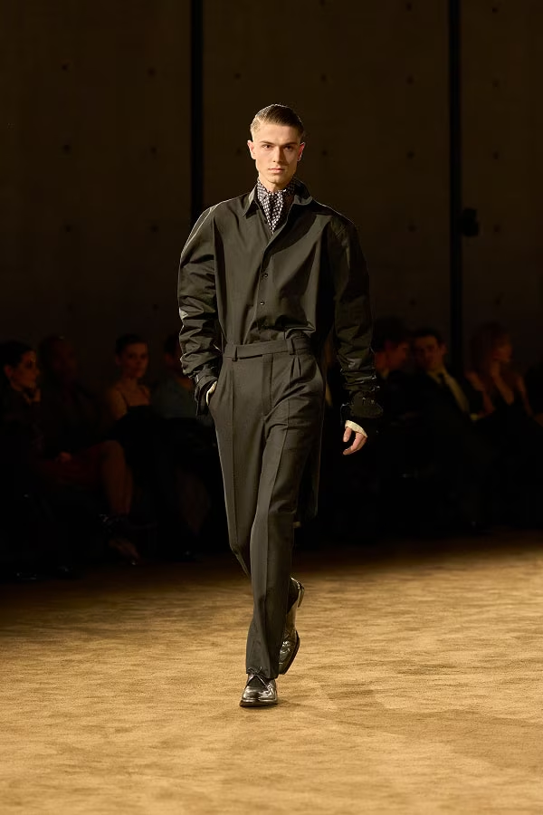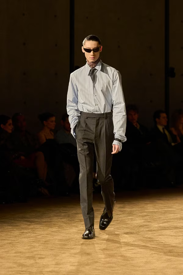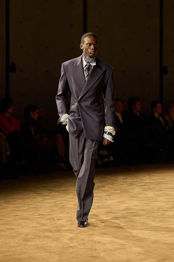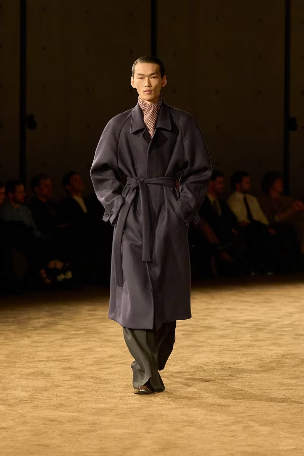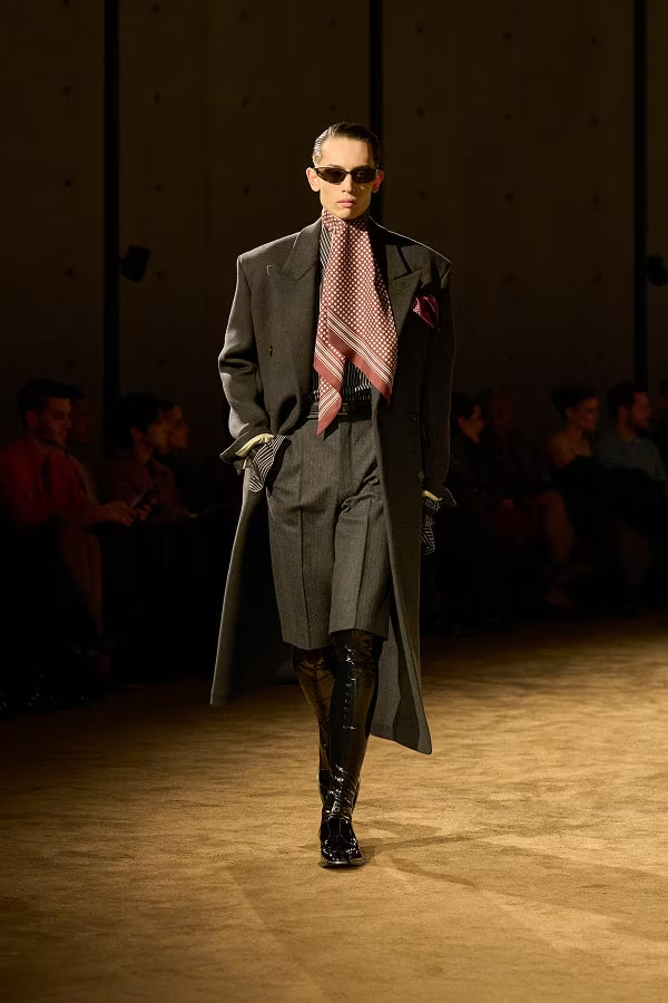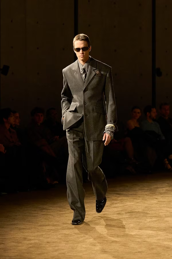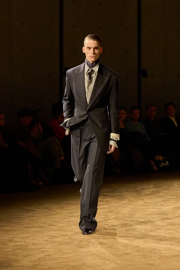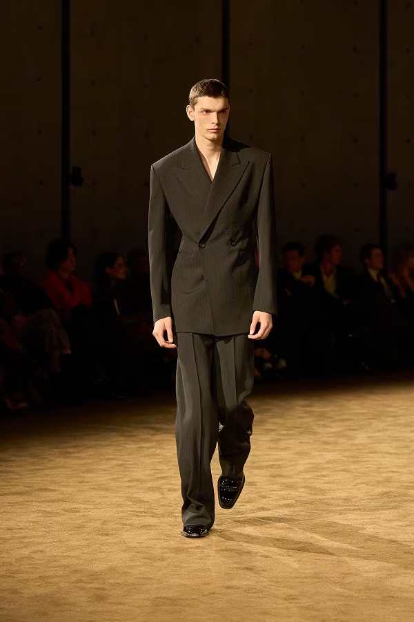 在巴黎时装周男装秀结束后,Anthony Vaccarello 在皮诺艺术基金会的 Bourse de Commerce 迎来了其最新的 SAINT LAURENT 2026 秋冬系列,中央圆厅成为了这场大秀的展示场地。此次展览不仅确认了 2026 年男装的时尚趋势将是「永恒的剪裁」,也映射了传统(甚至保守)着装规范的回归。Vaccarello 也借此机会探索了 SAINT LAURENT 品牌中「男性气质」所代表的内涵,尤其是在「亲密、脆弱和一丝情色」之间的微妙关系。