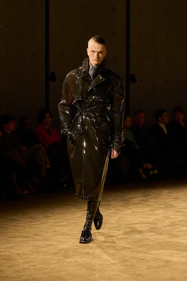 Vaccarello 将 SAINT LAURENT 的经典外套进行了柔化处理,腰部略微收腰,打造了一种既不女性化,也不死板的「理想男性形象」。亮面皮革风衣搭配光亮的过膝靴,向奇异文化致敬,也预示了 SAINT LAURENT 在未来将吸引更多敢于挑战常规的男性观众。