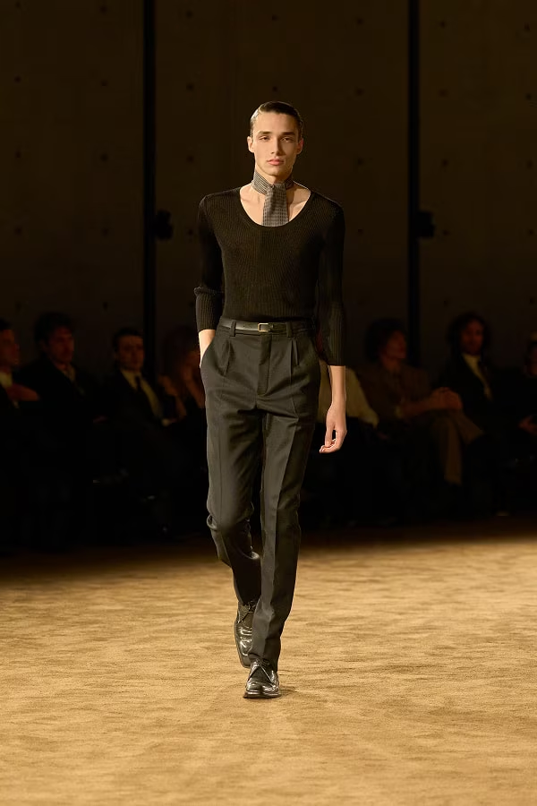 西装裤在本季设计中成为了颠覆传统的载体。早在 2022 春夏,他就推出了高腰短裤和透视波西米亚风上衣,而 2023 秋冬的戏剧性蝴蝶结衬衫和层叠前开口设计,2025 秋冬的过膝靴则被 Pedro Pascal、魏大勋以及常以红毯实验奇异风格著称的 Alexander Skarsgård 穿着。Vaccarello 一直致力于平衡尊重品牌传承与现代男性需求之间的矛盾,展现了既适应当代需求又不失经典美感的 SAINT LAURENT 剪裁风格。