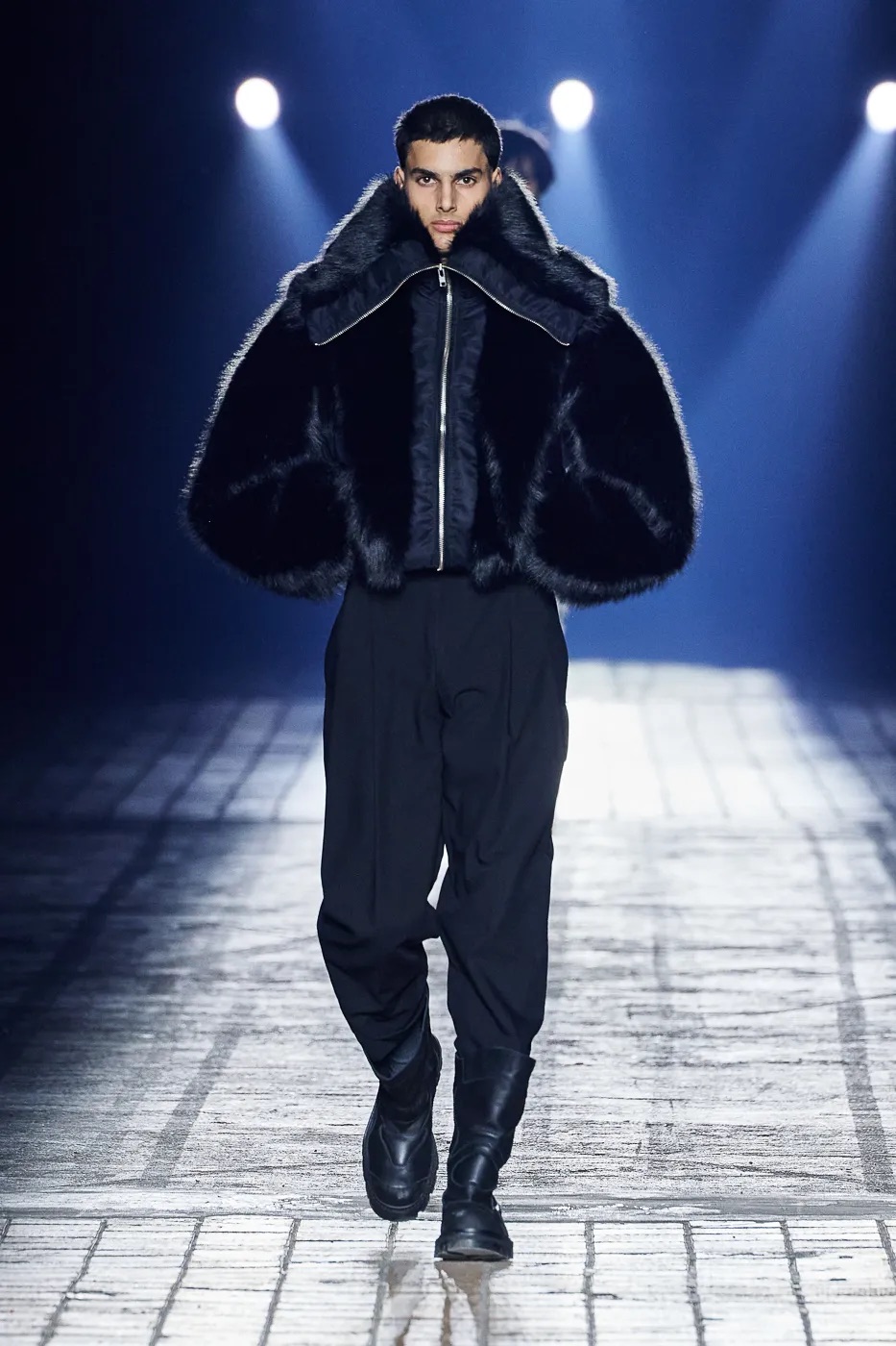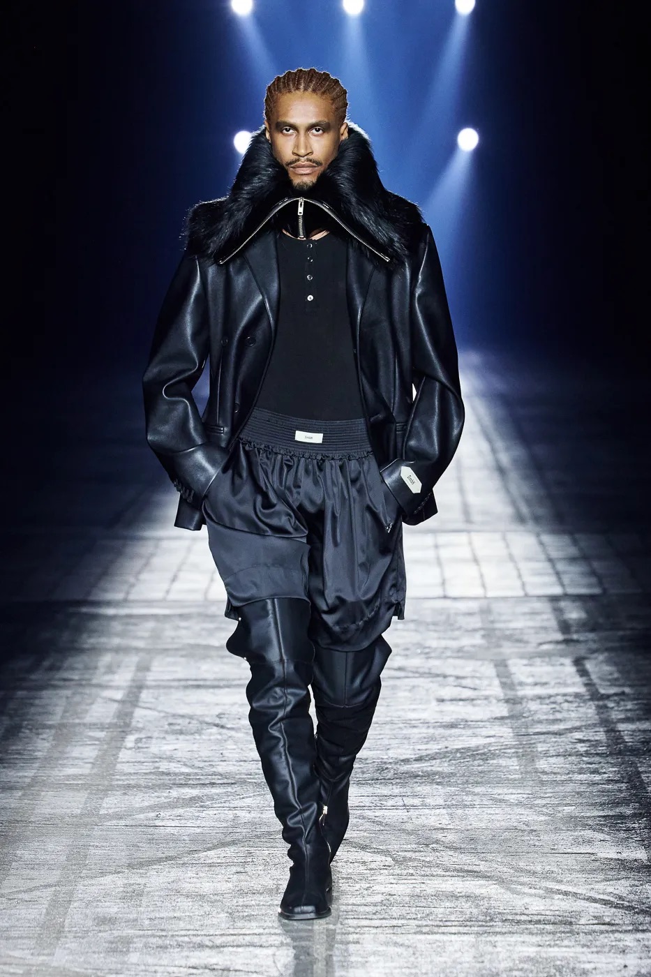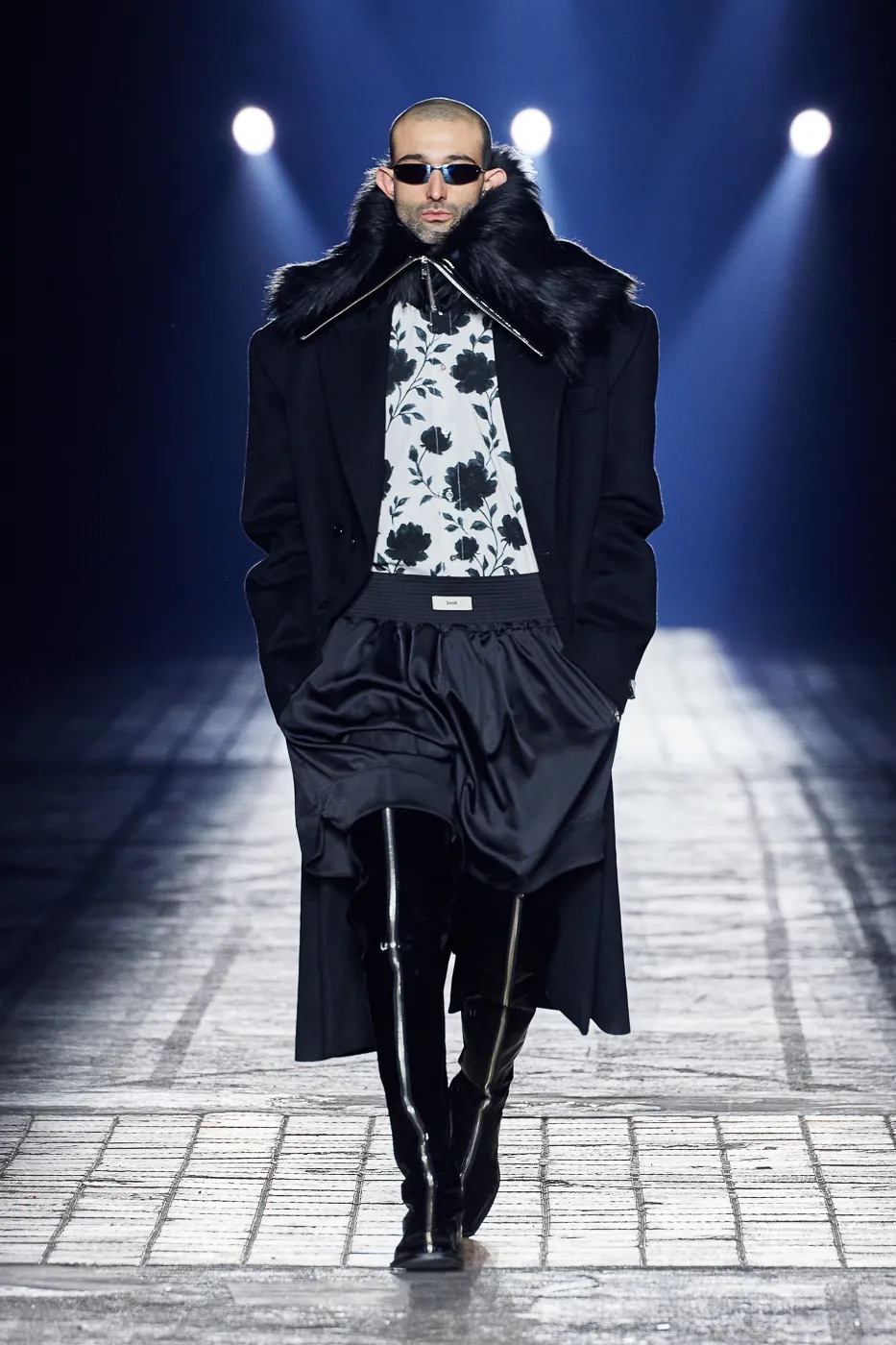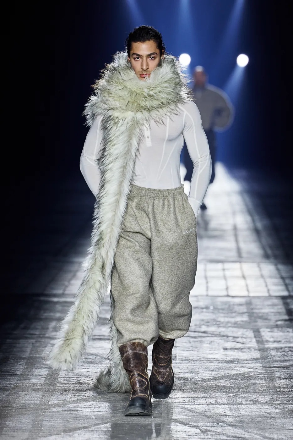 本季延续了 GmbH 始终拒绝沉默的理念,并从柏林的过往中汲取灵感,聚焦于 20 世纪 80 年代初的实验音乐场景。彼时的柏林充满反主流文化和乌托邦式的理想,而今被贪婪和压迫所取代。GmbH 将新系列视为一种反抗,用服装唤起人们对这座城市昔日美好的回忆。整季以黑、灰、米白和冷银色为主色调,硬挺的面料上点缀以花卉印花,蓬松的皮草质感、不对称的廓形设计既彰显空间感,又提供了防护性。超大号连帽衫和皮背心与结构感十足的长裤和宽肩设计相得益彰。