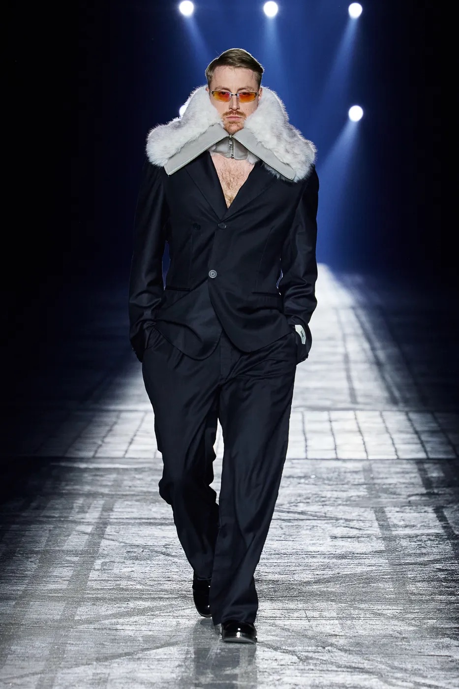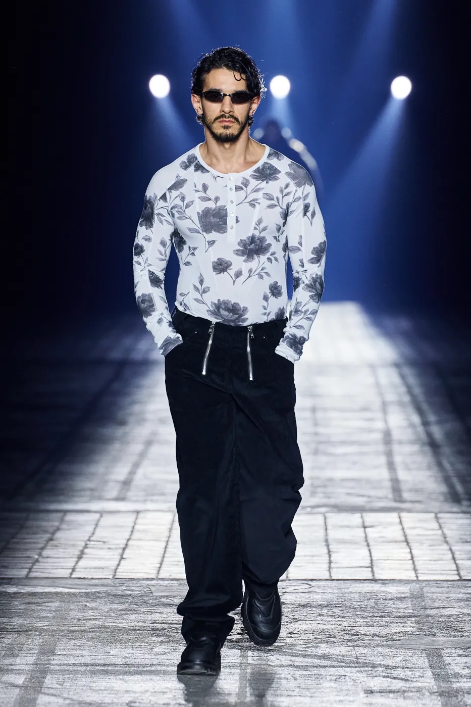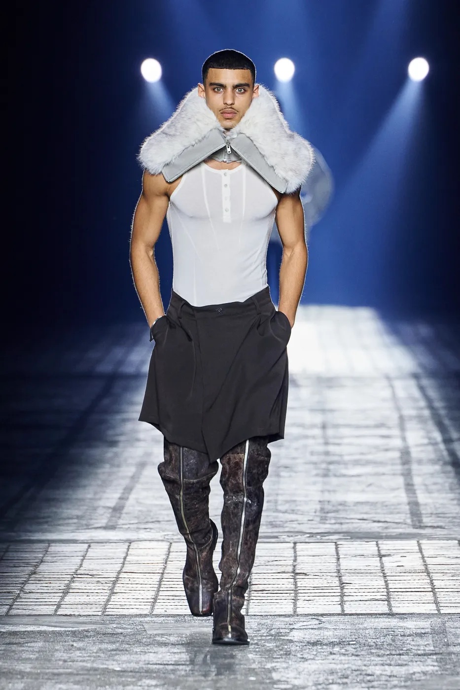 本季延续了 GmbH 始终拒绝沉默的理念,并从柏林的过往中汲取灵感,聚焦于 20 世纪 80 年代初的实验音乐场景。彼时的柏林充满反主流文化和乌托邦式的理想,而今被贪婪和压迫所取代。GmbH 将新系列视为一种反抗,用服装唤起人们对这座城市昔日美好的回忆。整季以黑、灰、米白和冷银色为主色调,硬挺的面料上点缀以花卉印花,蓬松的皮草质感、不对称的廓形设计既彰显空间感,又提供了防护性。超大号连帽衫和皮背心与结构感十足的长裤和宽肩设计相得益彰。