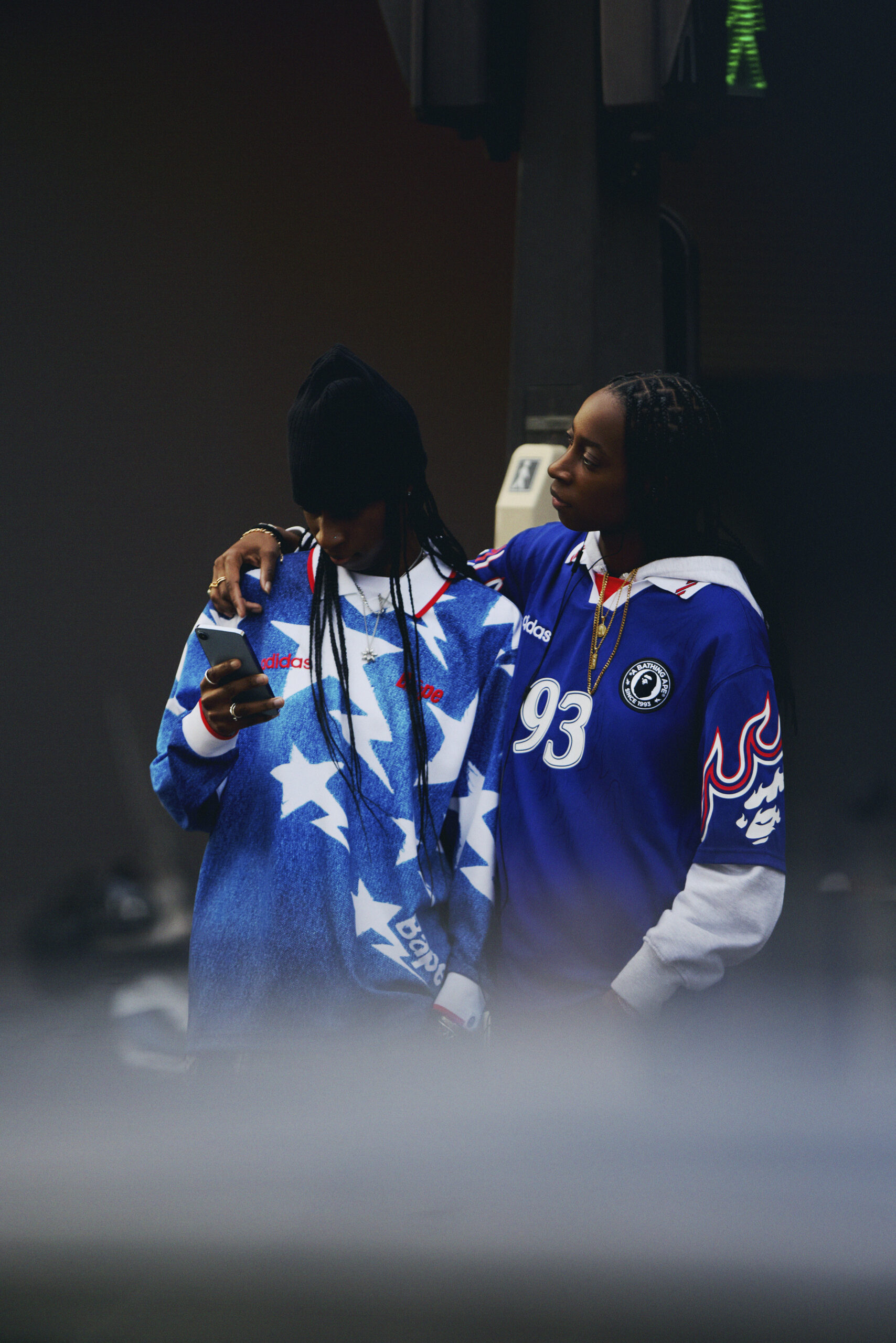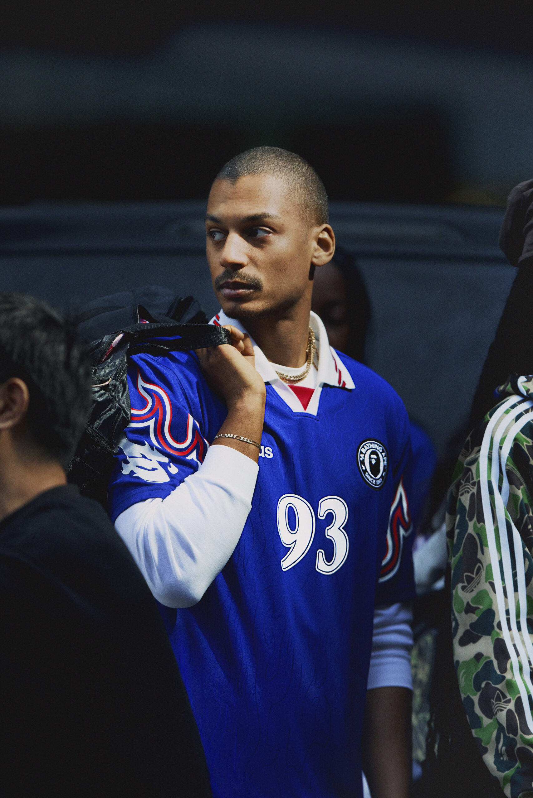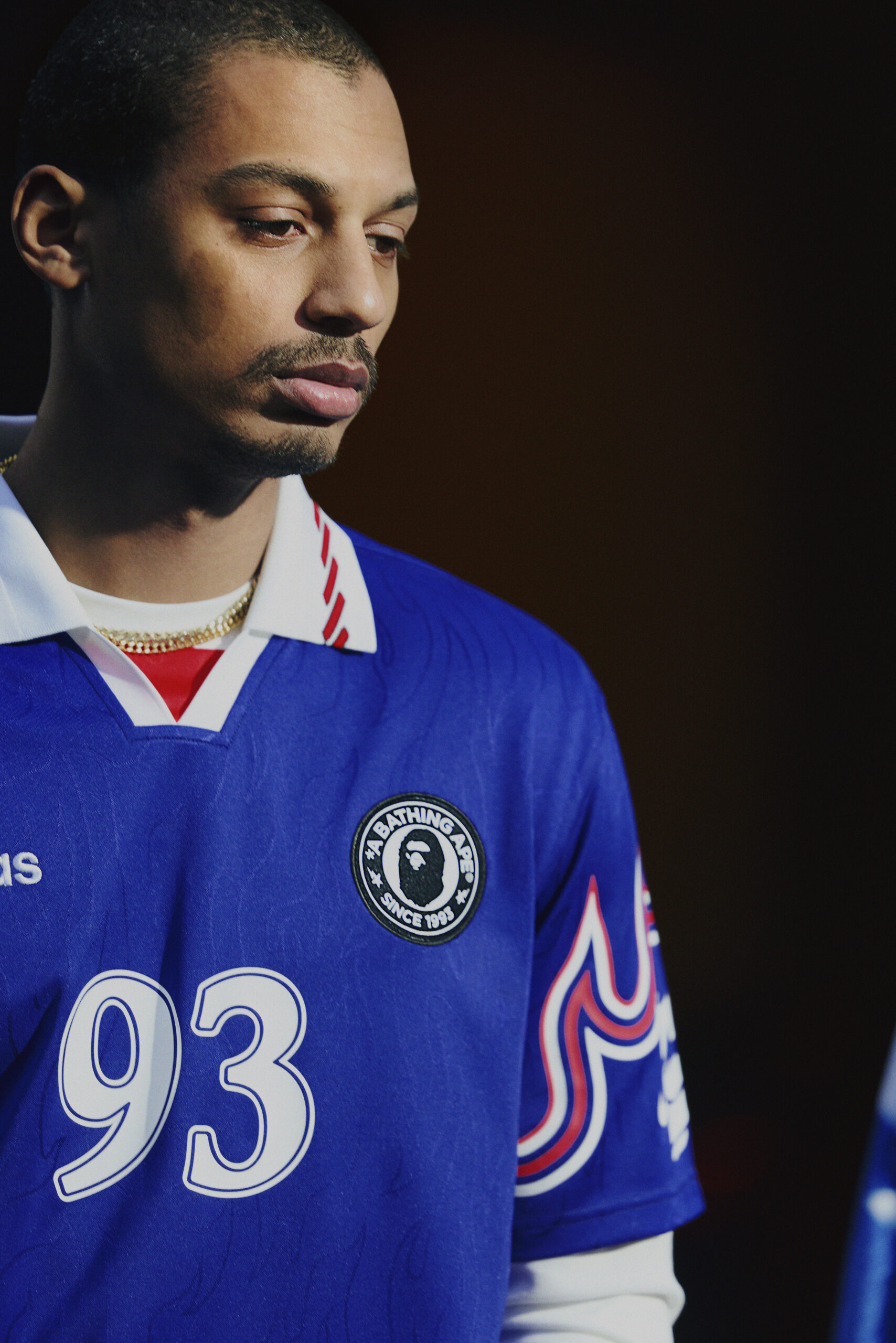 服饰系列中,两款球迷球衣尤为吸睛。第一款是长袖牛仔印花有领上衣,饰有 BAPE STA™ 标志性图案与双方联名细节,潮流感十足;第二款则重塑了 90 年代日本国家队球衣经典版型,衣袖处点缀原创 BAPE® 火焰图案,背部专属定制 「BAPE 93」字样,以此致敬 BAPE® 品牌 1993 年诞生的重要时刻。