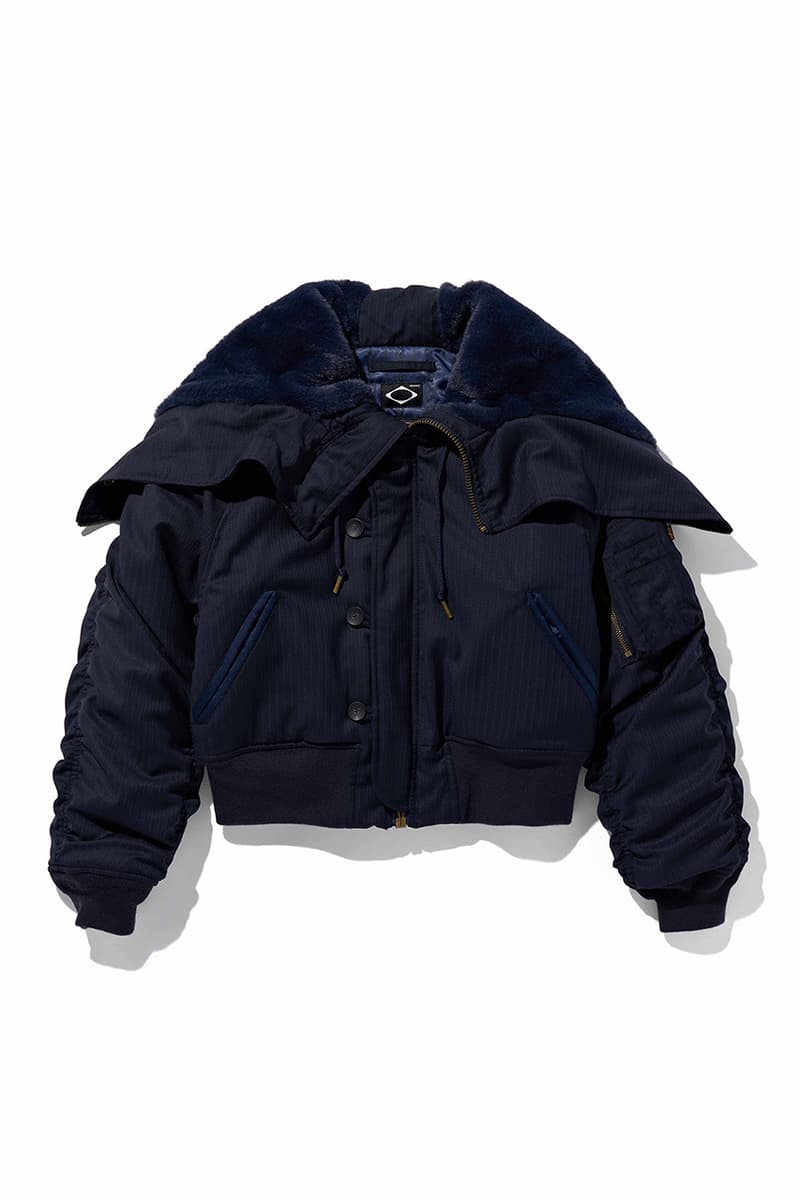 外套采用深海军蓝单一配色,并以短款剪裁强化活动性与穿着舒适度,在保留军用派克大衣结构感的同时,呈现更利落平衡的比例。最大亮点来自材质升级——本次合作罕见地舍弃传统 MA-1 系列常用的尼龙面料,转而选用高品质羊毛混纺作为外层,使整体质感从纯功能性军装跃升至兼具定制服装氛围的都市外套。