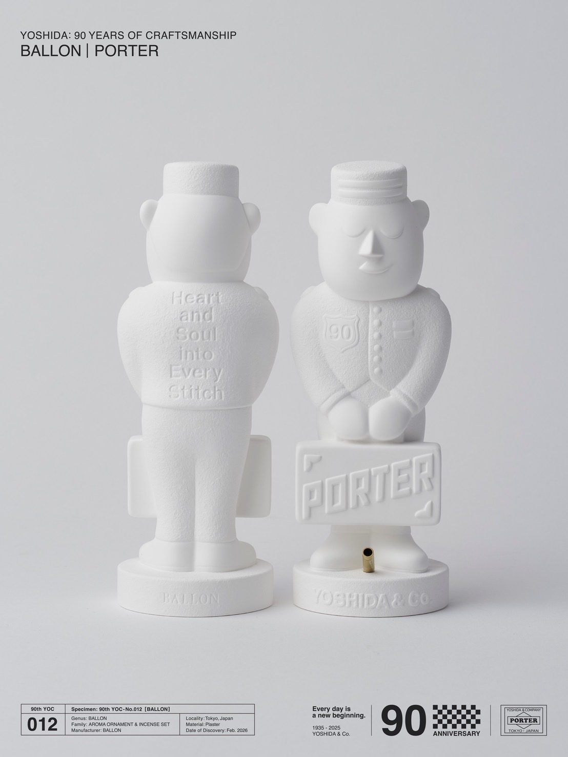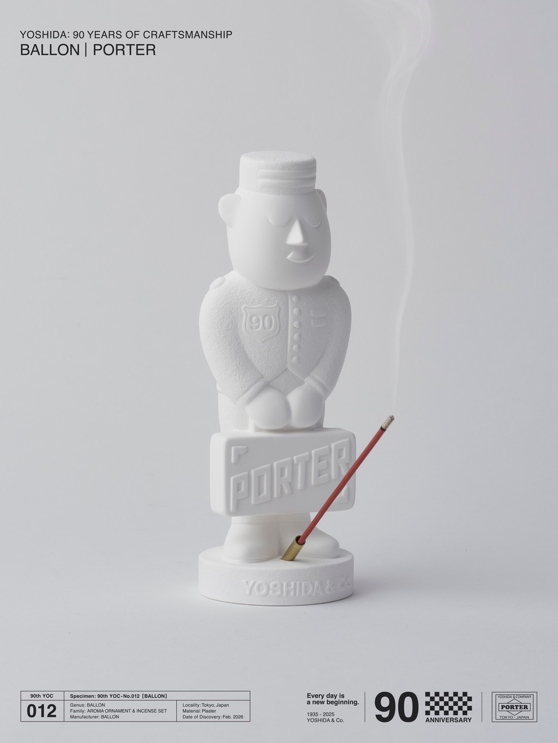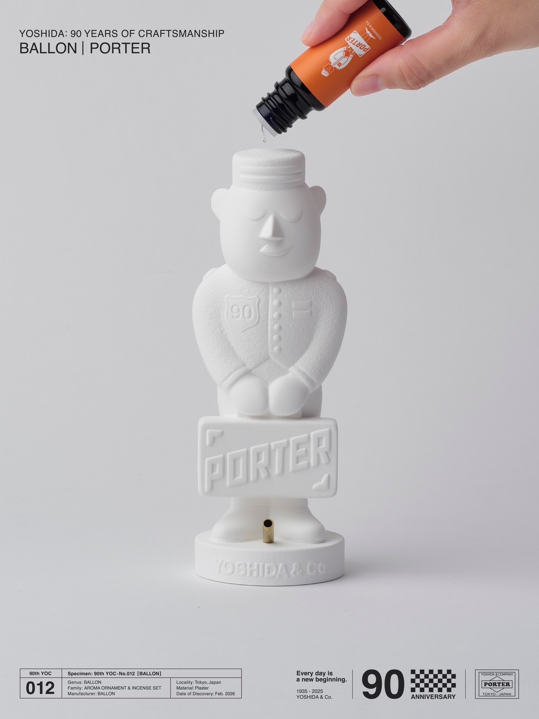 为庆祝吉田株式会社成立 90 周年,旗下包袋品牌 PORTER 携手香氛设计品牌 BALLON,推出联名石膏香氛摆件「Porter-kun」。该摆件亦可作为香炉使用,内置融合檀香、柚子与柏树的专属香调线香及精油。设计上,胸前饰有 90 周年纪念徽章,背部刻有品牌格言「Heart and Soul into Every Stitchs」(倾注心血于每一针一线」,体现匠心传承。据悉此限量作品将于 2 月 11 日起,在日本所有 PORTER 门店、吉田株式会社线上商店及部分 BALLON 门店发售。