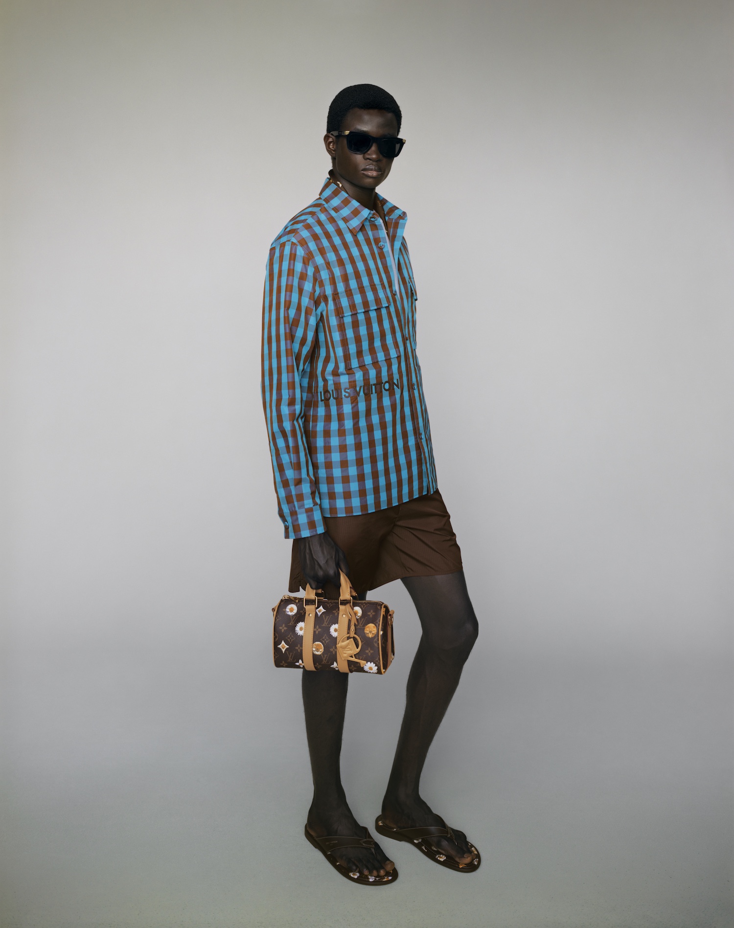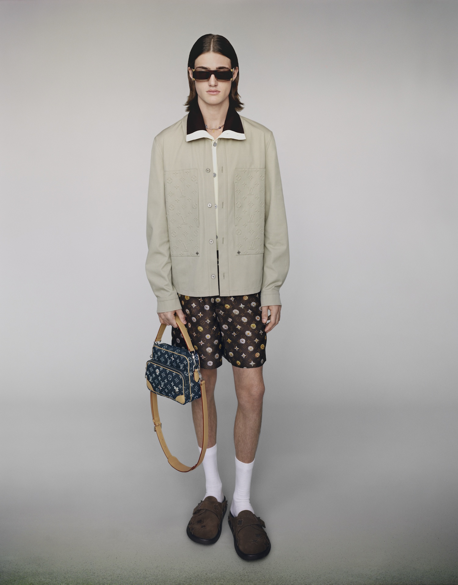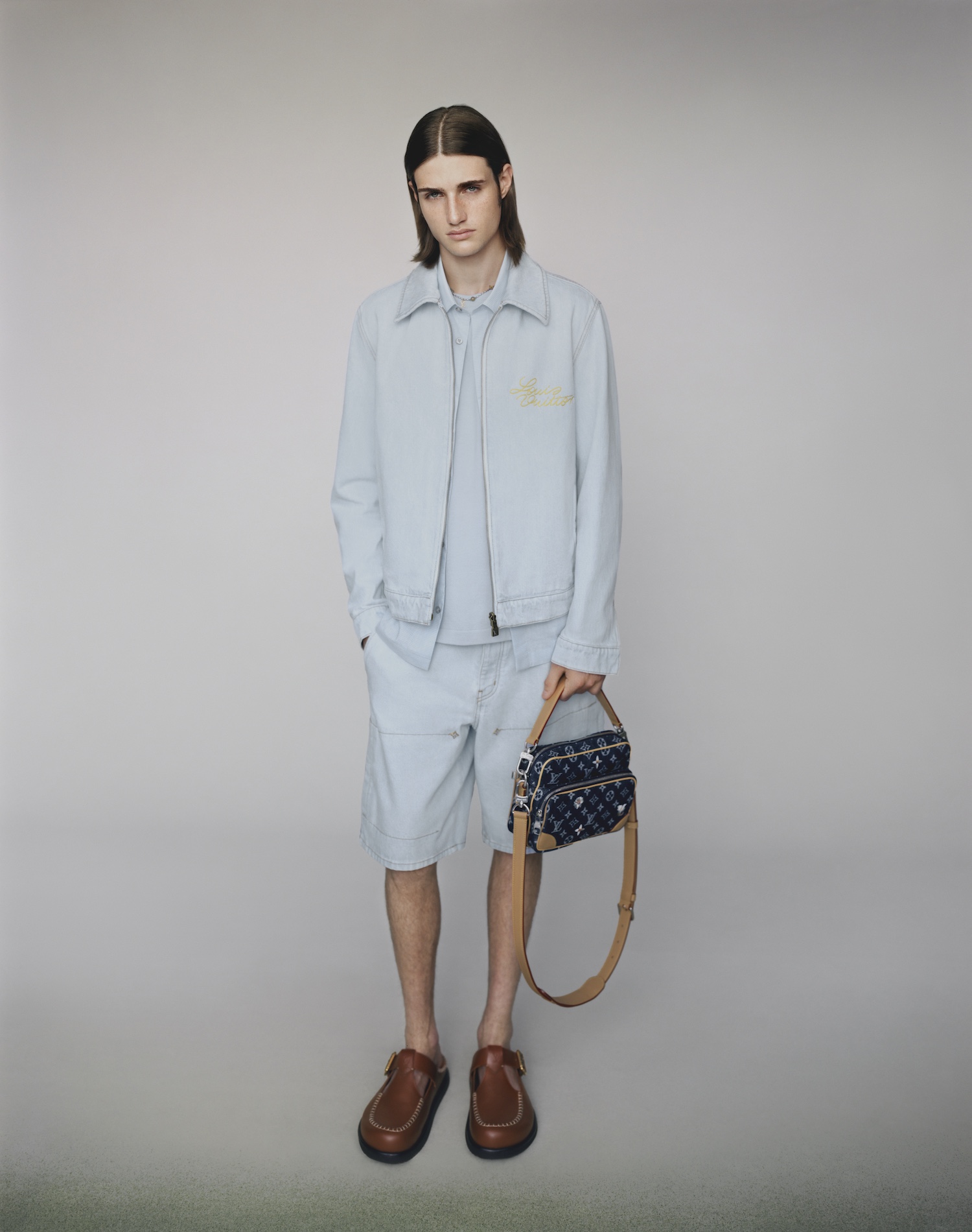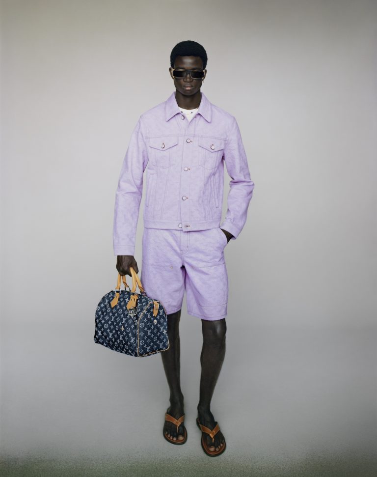 配饰方面,该系列由一款形状像洒水壶的包袋而增添一丝趣味性。经典 Monogram Denim 包袋系列包括 Keepall 50 和 Speedy 30B。鞋履则延续休闲主题,推出了 LV Sunset Thong 和 Portofino Mule,同时还有新的运动鞋款式,如受滑板启发的 LV Tilted 和以 1960 年代为灵感的 LV Buttersoft。标志性的 LV Trainer 也以刺绣花卉款式回归。