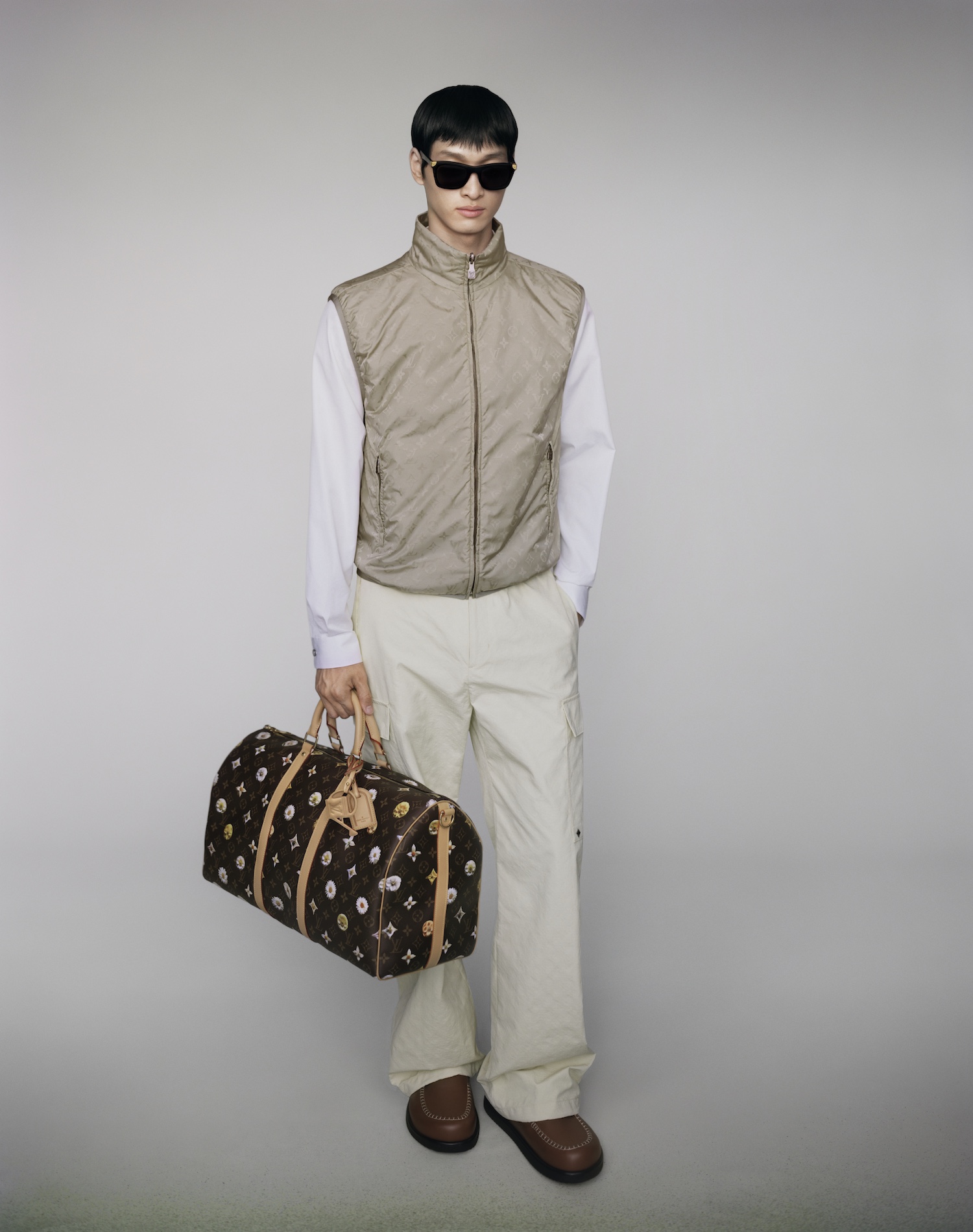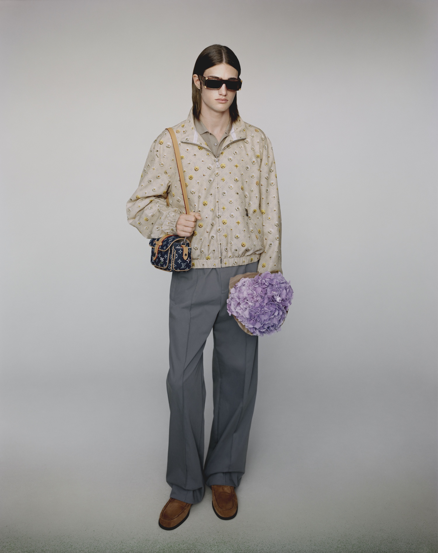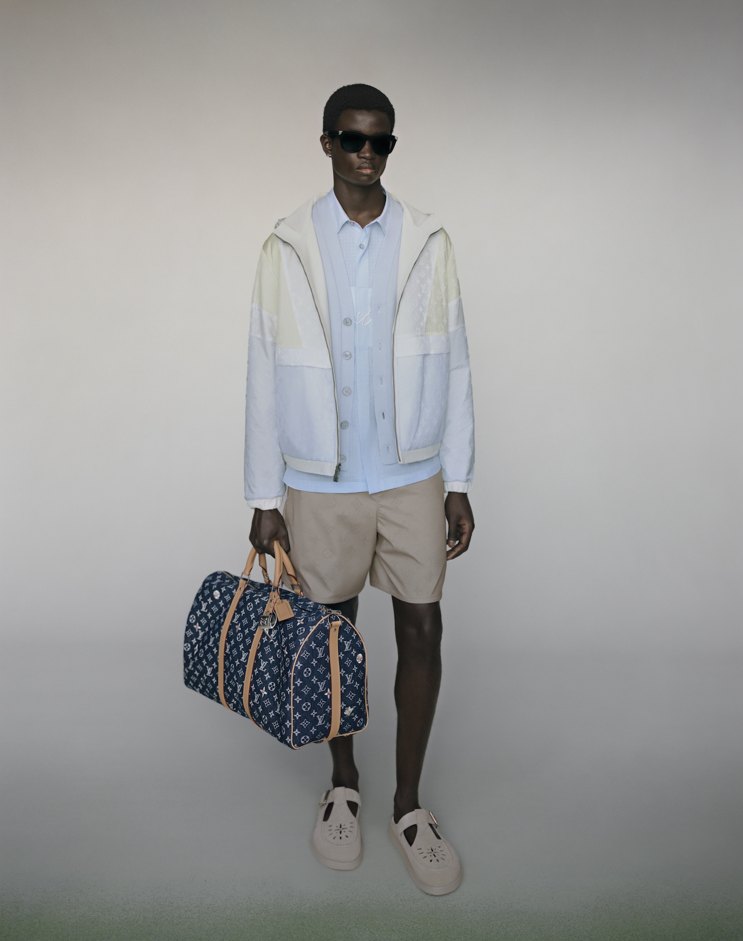 配饰方面,该系列由一款形状像洒水壶的包袋而增添一丝趣味性。经典 Monogram Denim 包袋系列包括 Keepall 50 和 Speedy 30B。鞋履则延续休闲主题,推出了 LV Sunset Thong 和 Portofino Mule,同时还有新的运动鞋款式,如受滑板启发的 LV Tilted 和以 1960 年代为灵感的 LV Buttersoft。标志性的 LV Trainer 也以刺绣花卉款式回归。