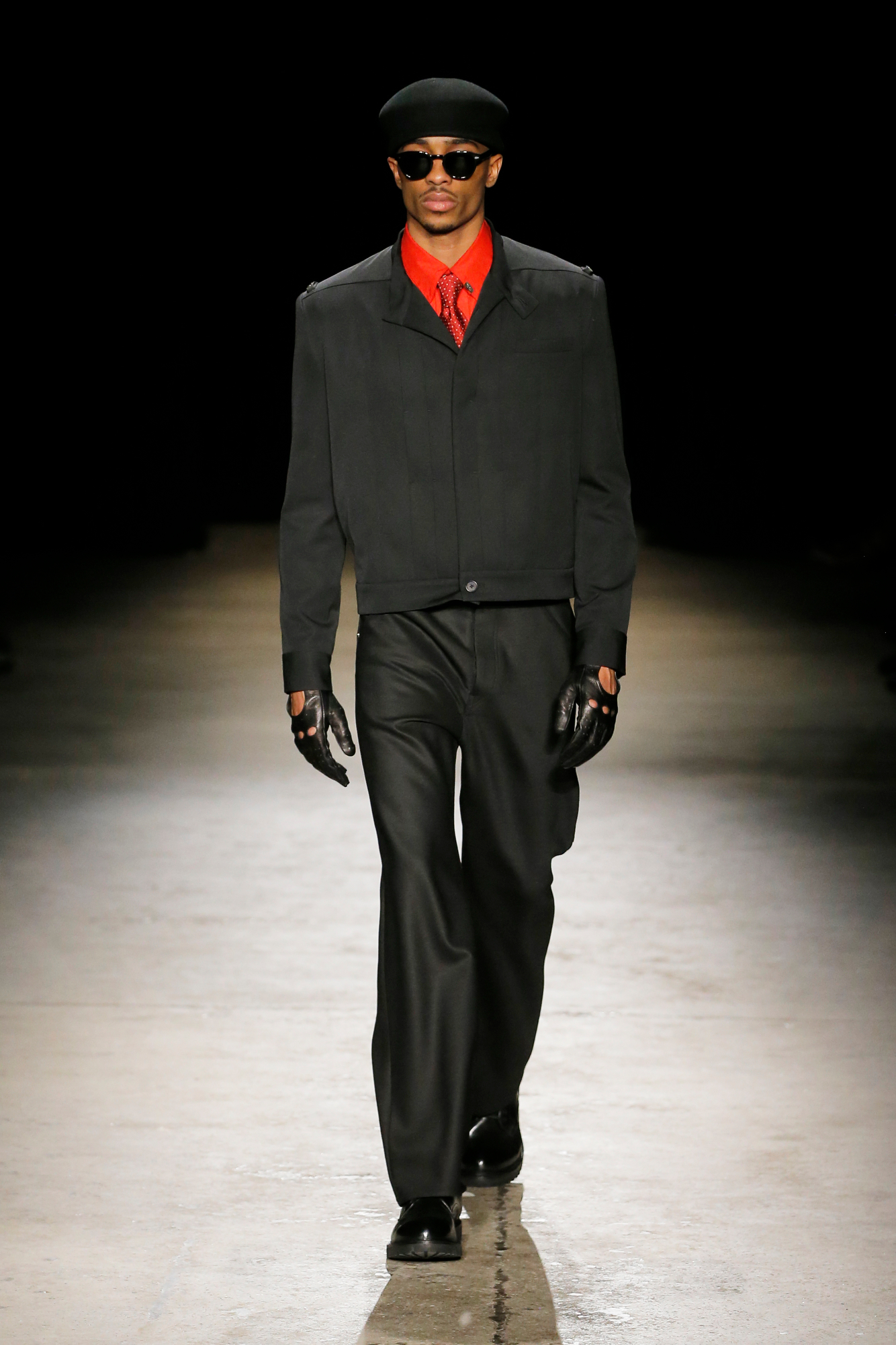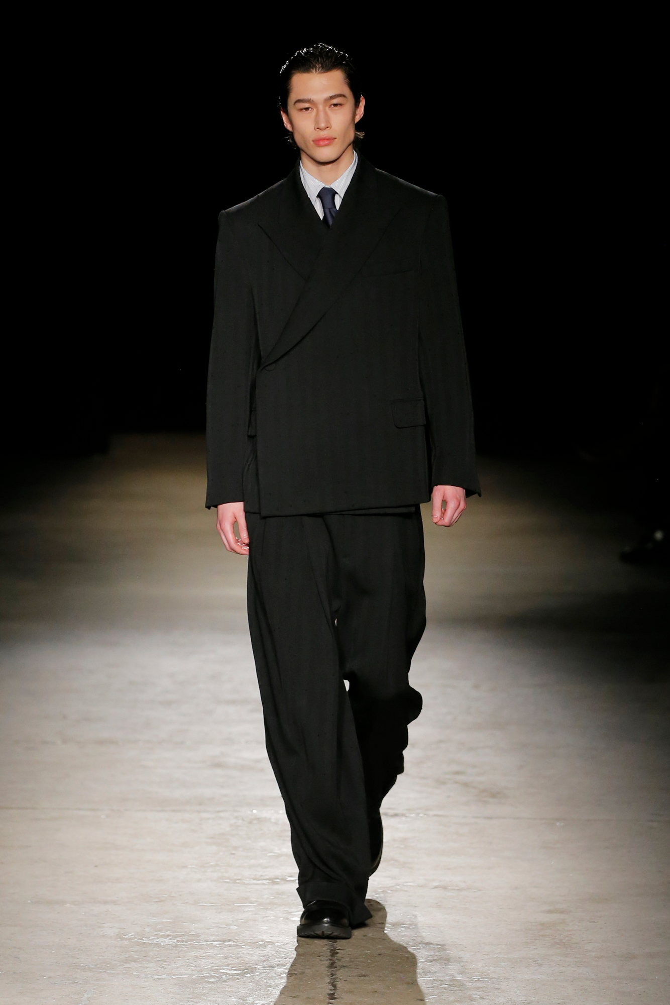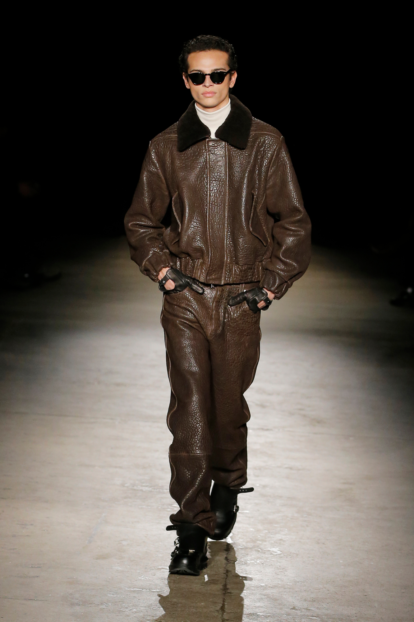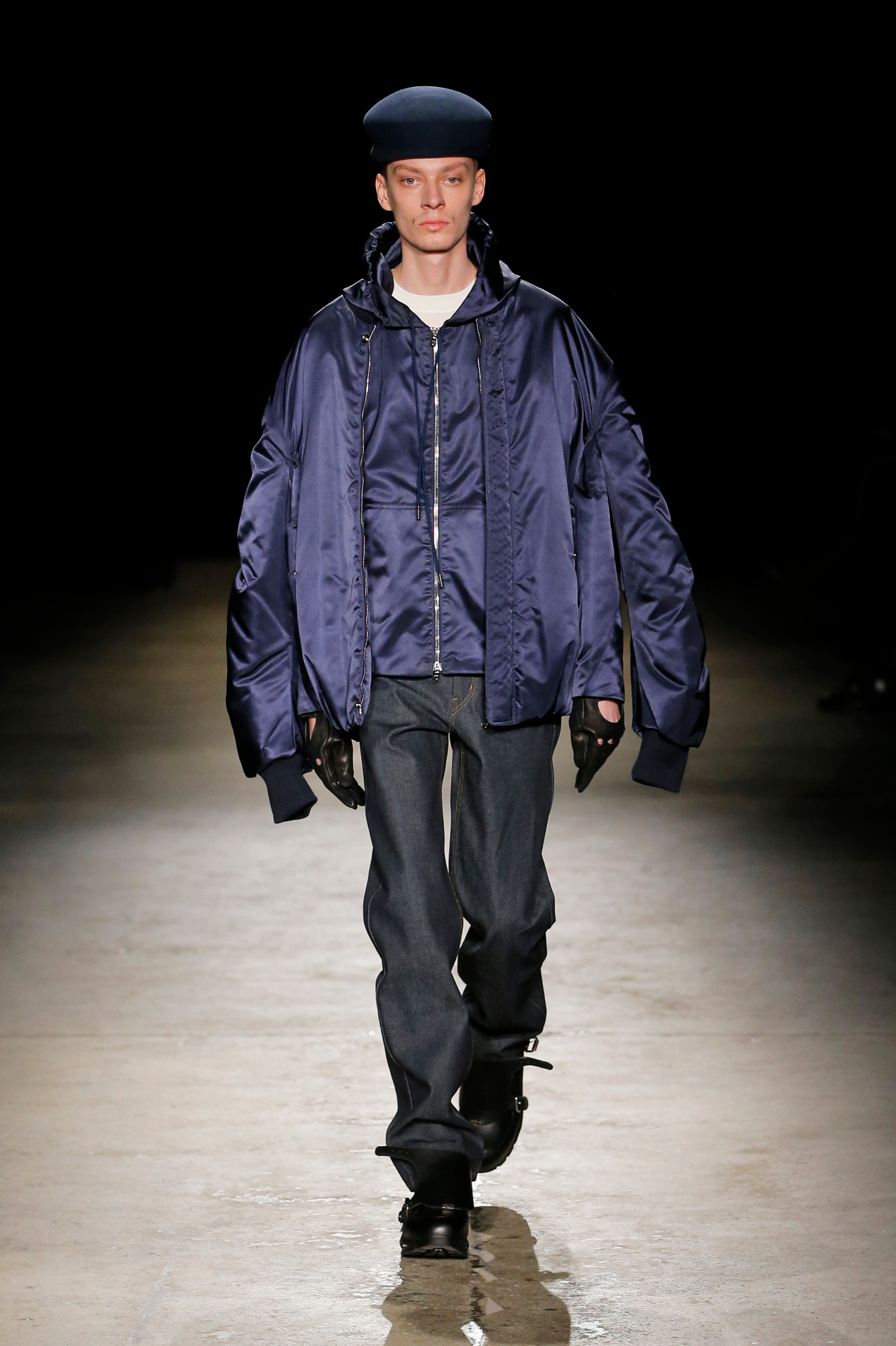 系列中出现了锋利剪裁的裹式西装、流动感的建筑风格重新诠释的剪裁、西装外套、经典的高级派大衣和飞行夹克,背部的造型设计加入了收褶元素,甚至有款夹克通过额外的臂洞让袖子变得更具装饰性。此外,皮革面料被重新演绎,细腻的皮质裤子与夹克成为亮点。