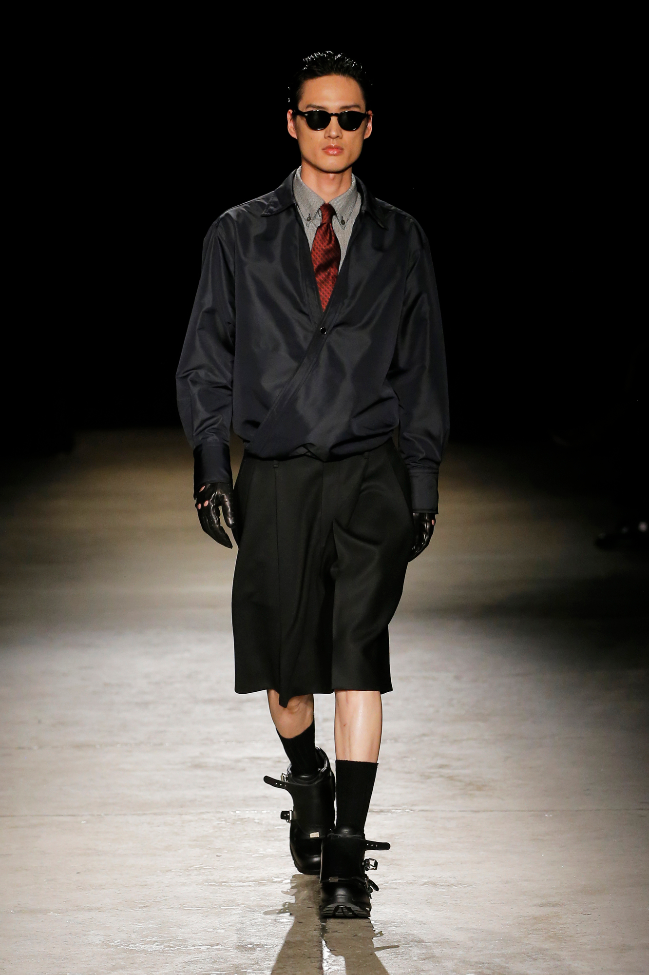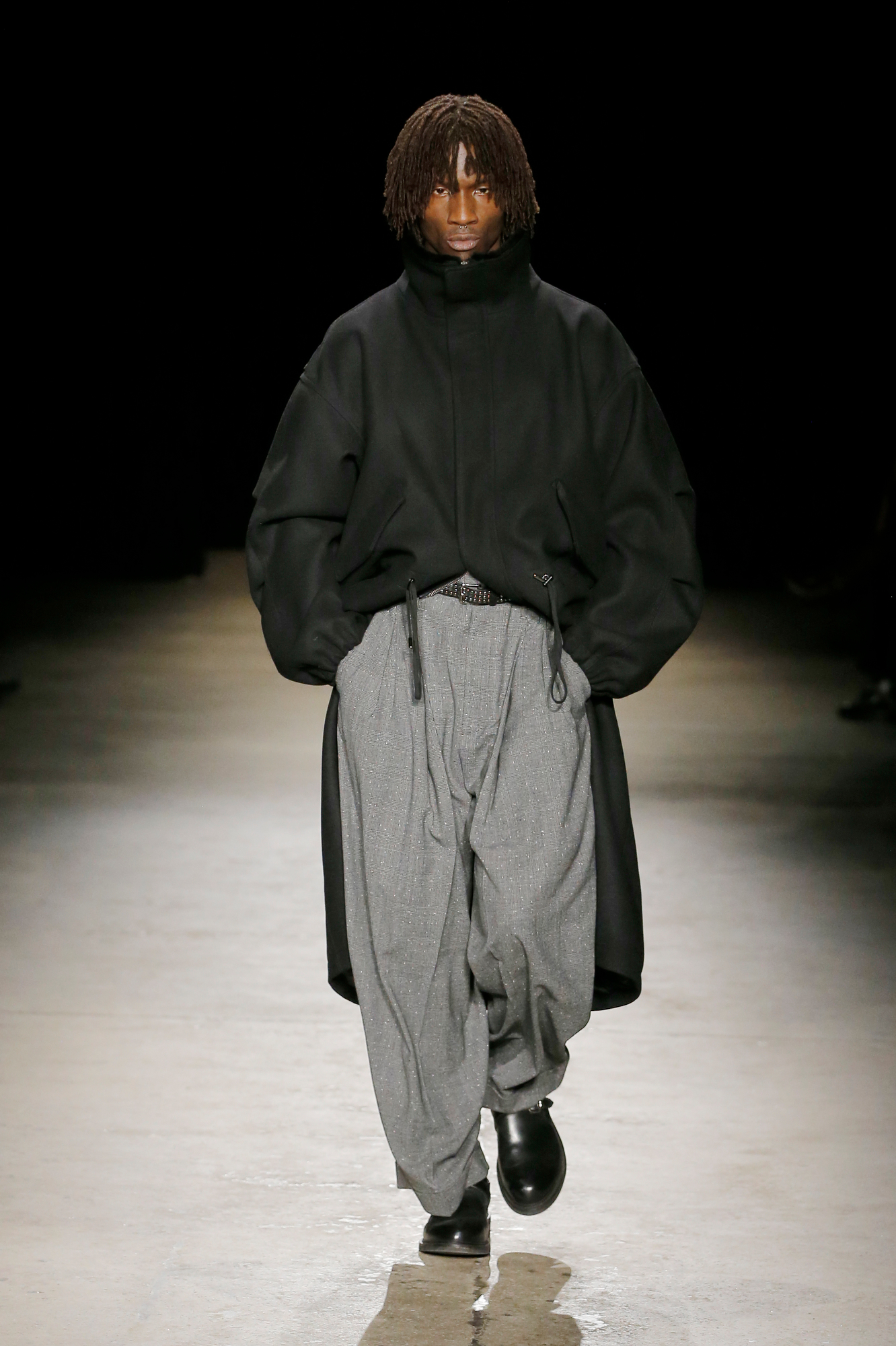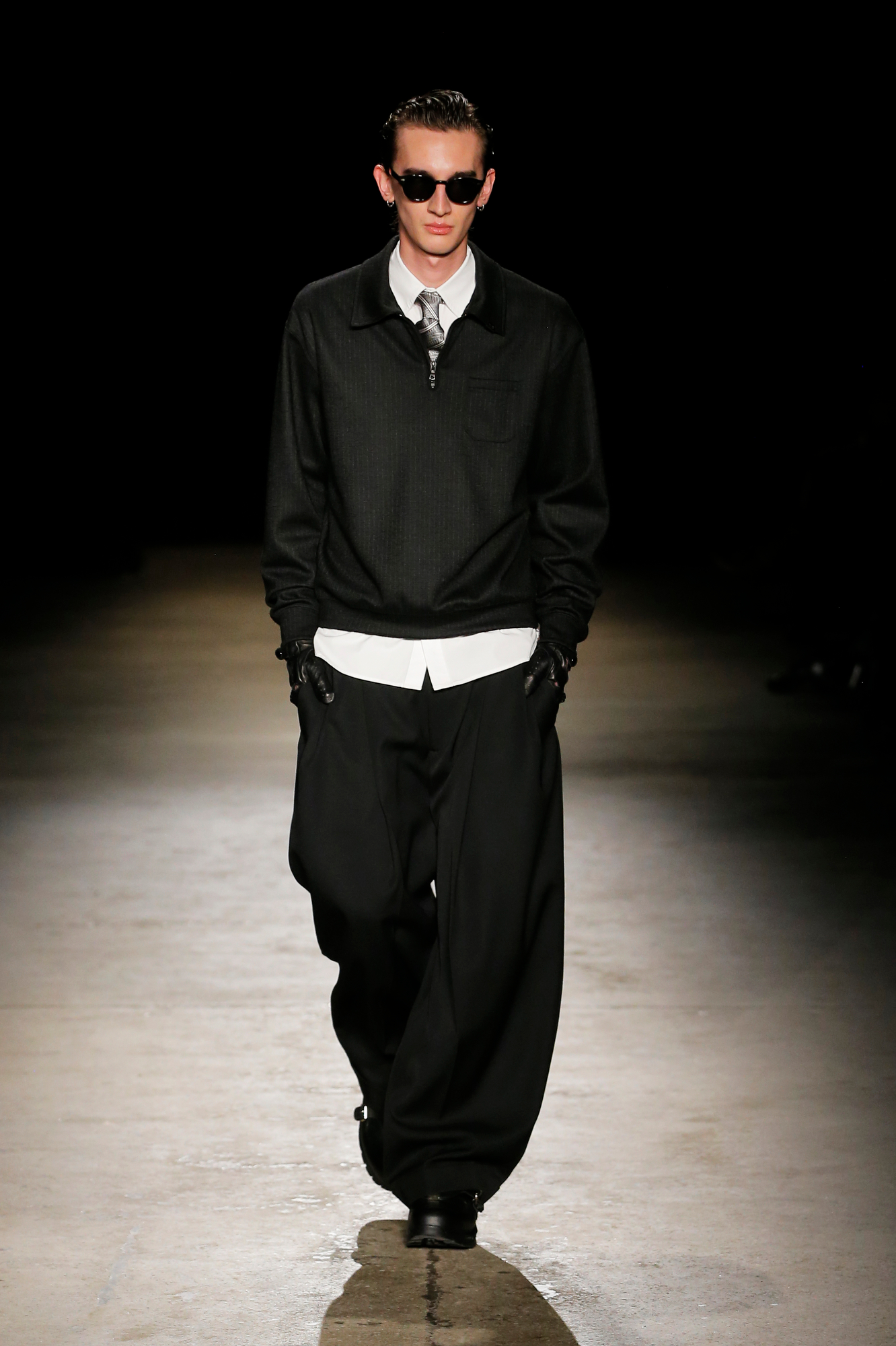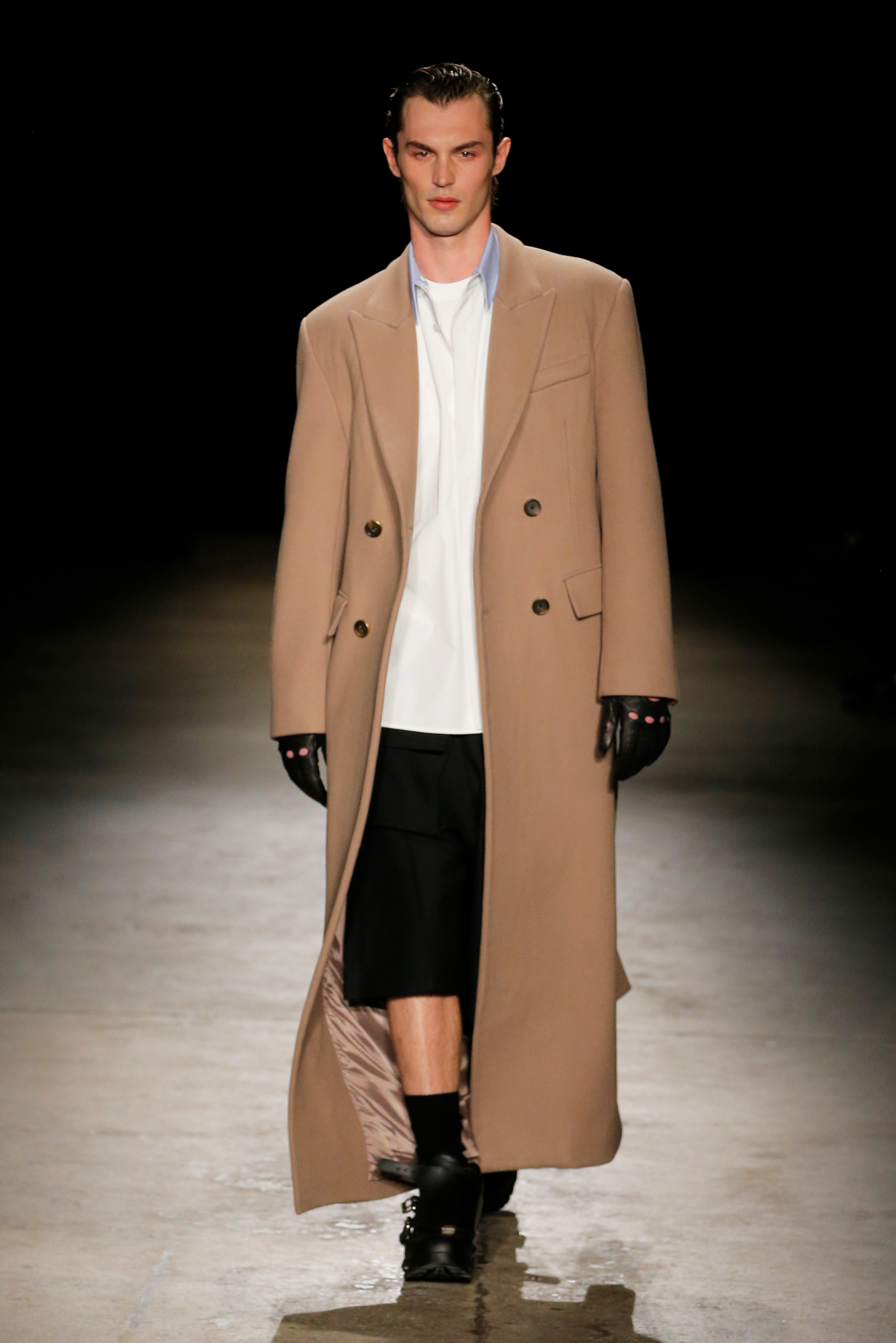 系列中出现了锋利剪裁的裹式西装、流动感的建筑风格重新诠释的剪裁、西装外套、经典的高级派大衣和飞行夹克,背部的造型设计加入了收褶元素,甚至有款夹克通过额外的臂洞让袖子变得更具装饰性。此外,皮革面料被重新演绎,细腻的皮质裤子与夹克成为亮点。