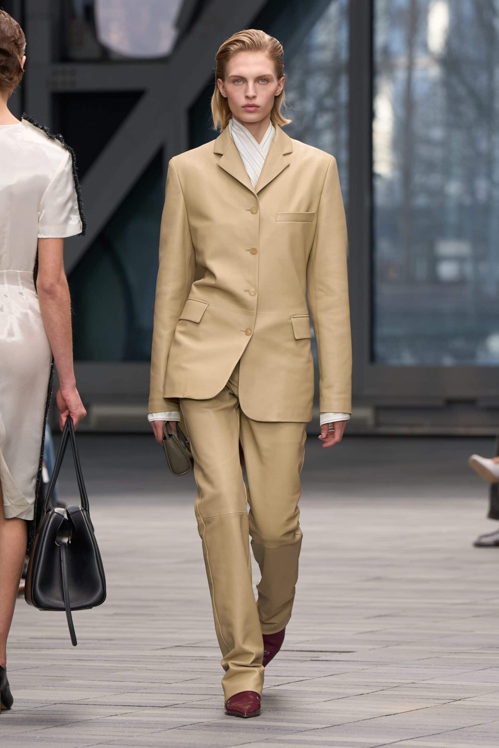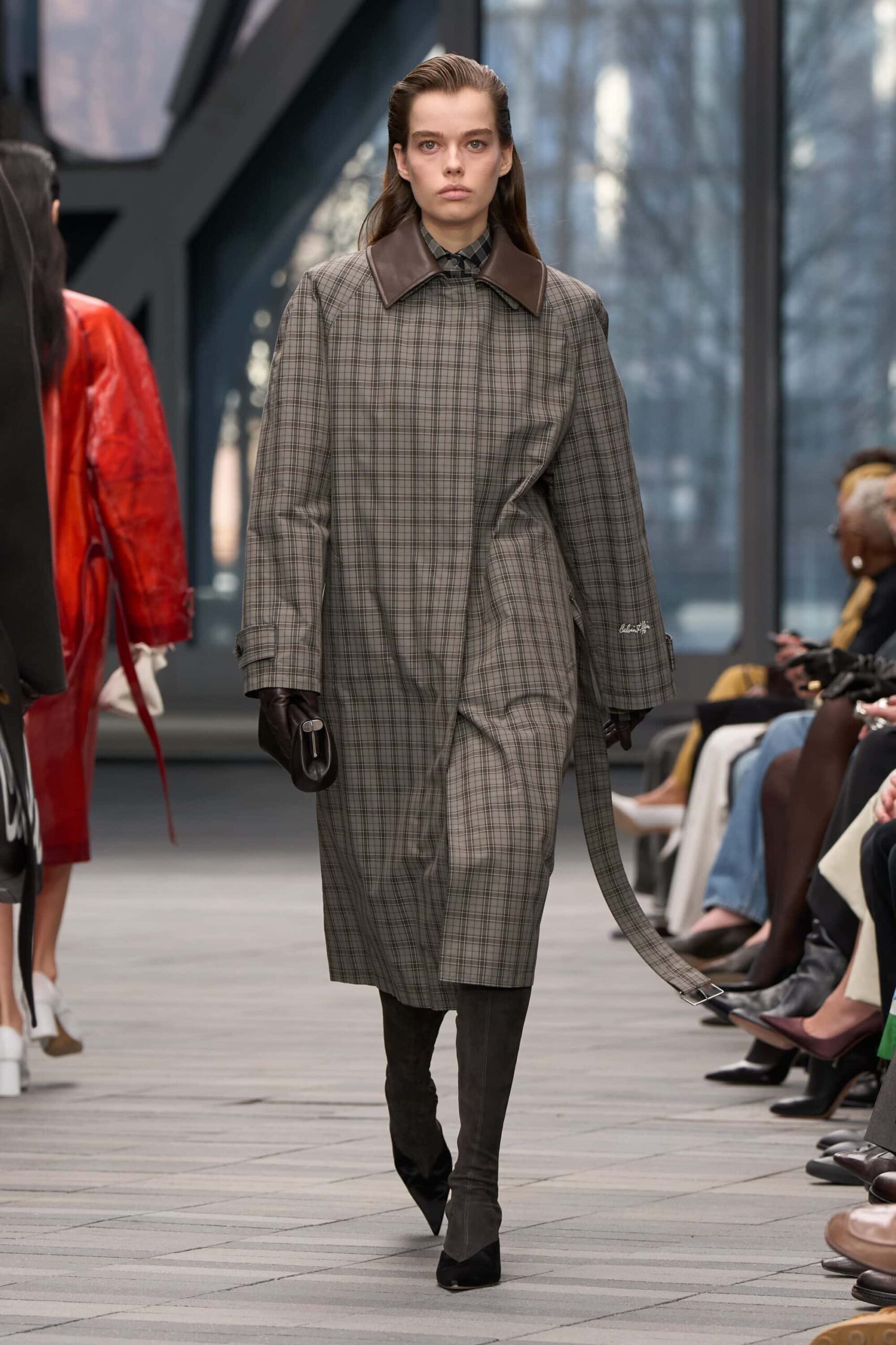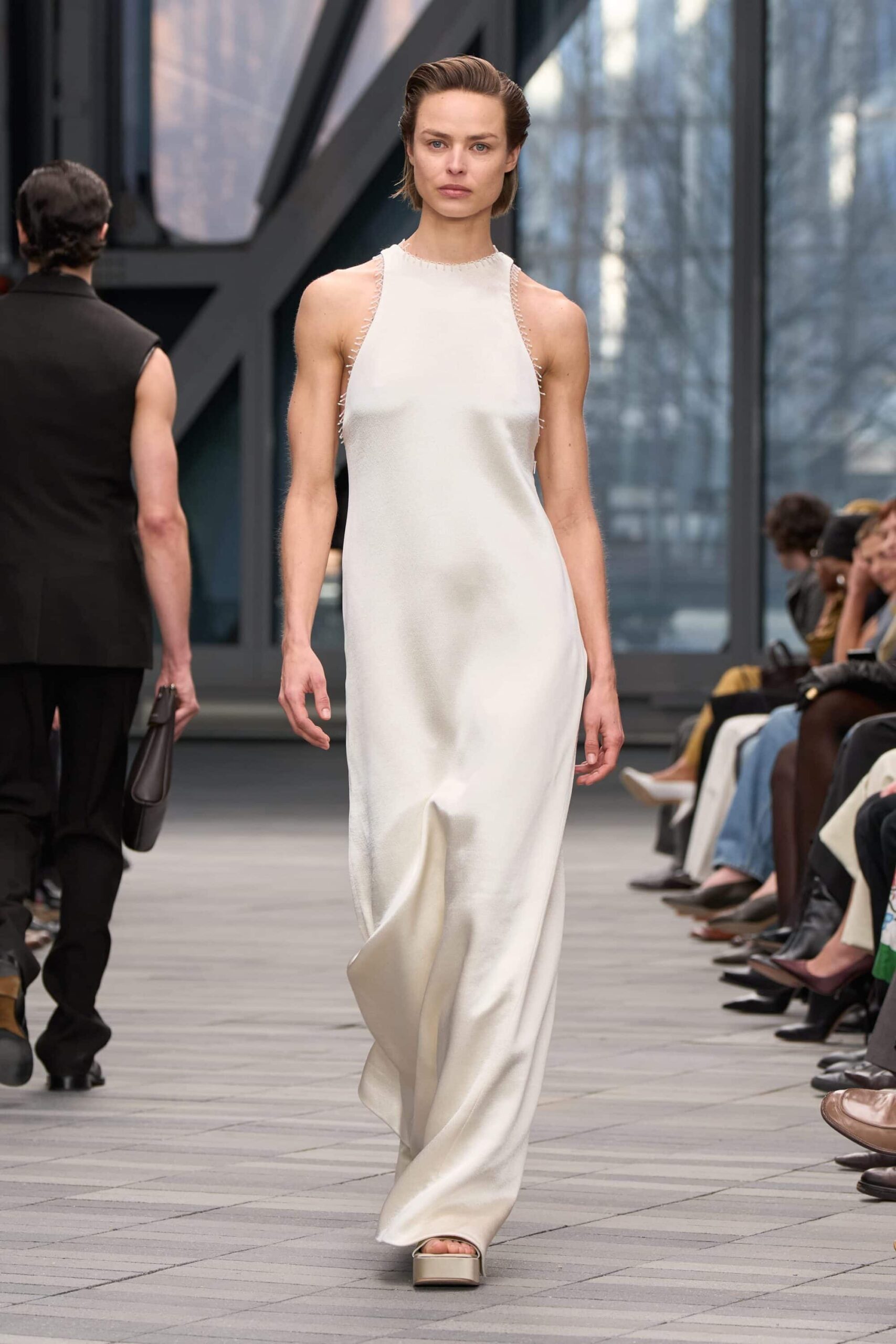系列开场由黑白简约的服饰引领,细节经过简化处理,黑色西装采用同色条纹,窄小的翻领设计加以点缀;而一条无肩带、结构感十足的黑色裙子,几乎无缝贴合身形,展现出极简美学的精髓。接下来的羊毛外套、全皮西装、羊毛和皮革领口等,逐渐将氛围推向奢华享受。整体系列既有简洁的建筑感,也有豪华质感的柔美面料,反映出 Leoni 对 Calvin Klein 历史遗产的独特理解与延续。