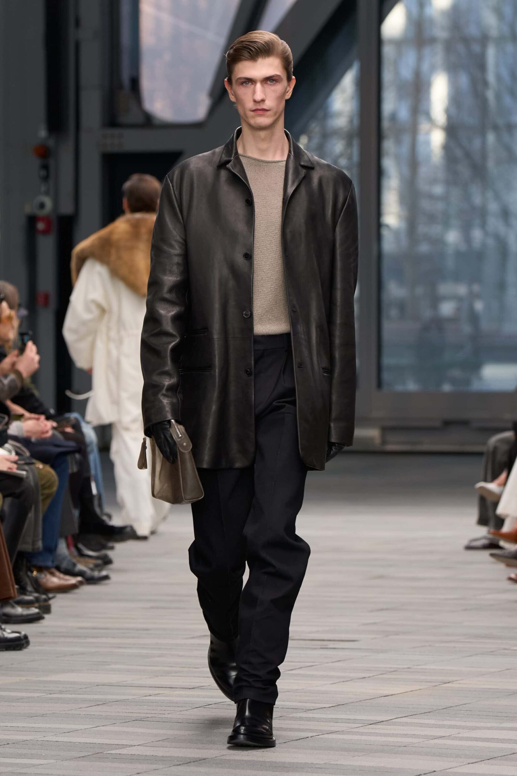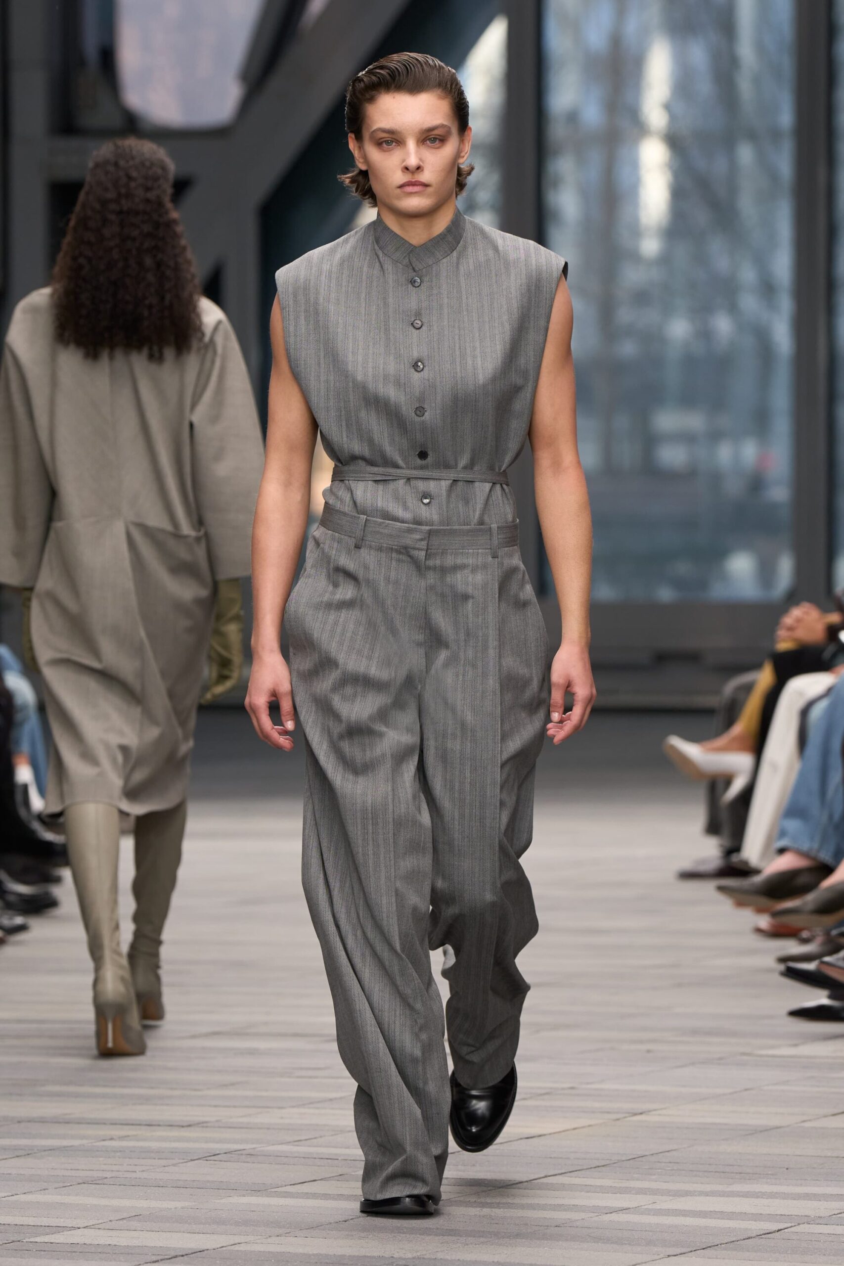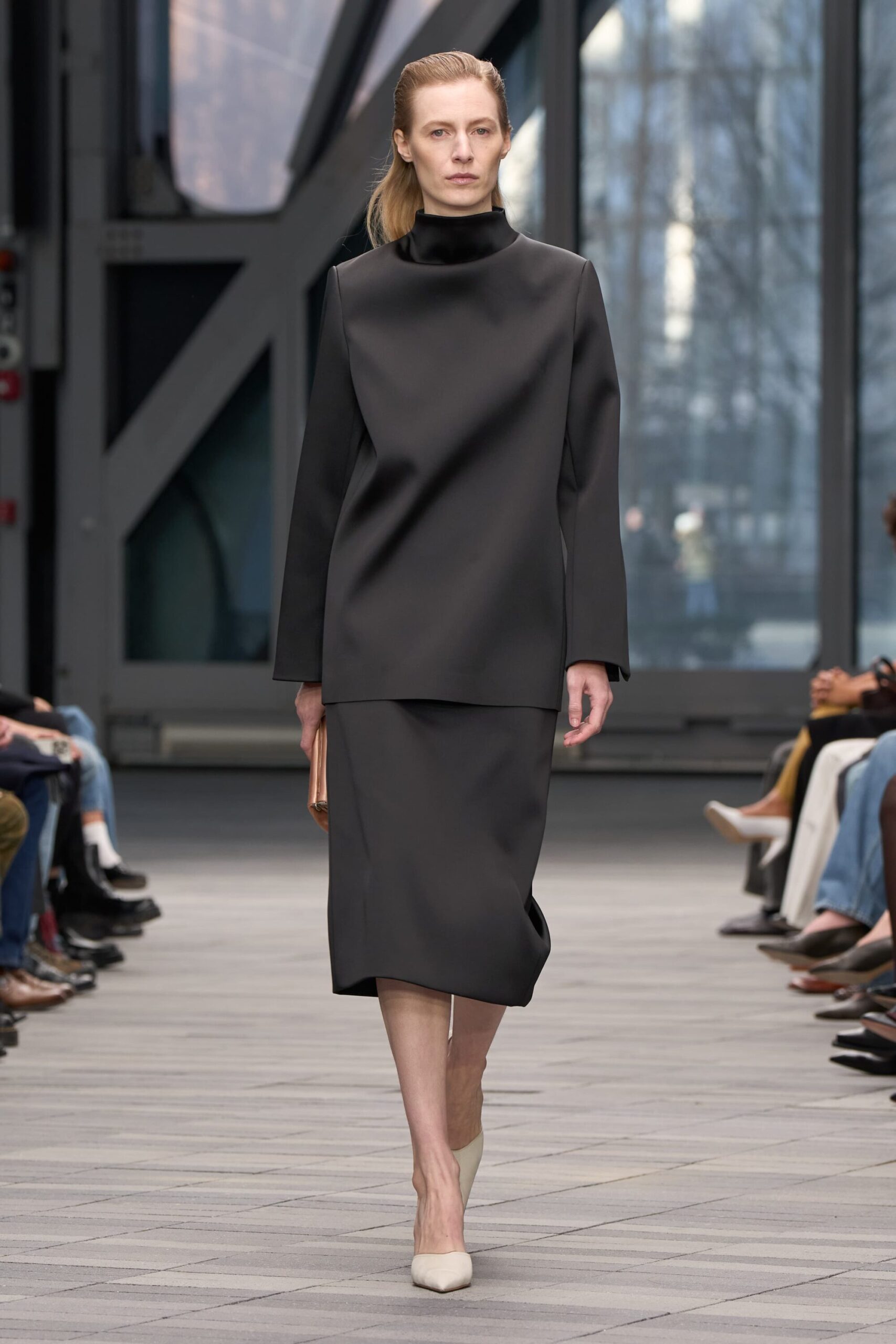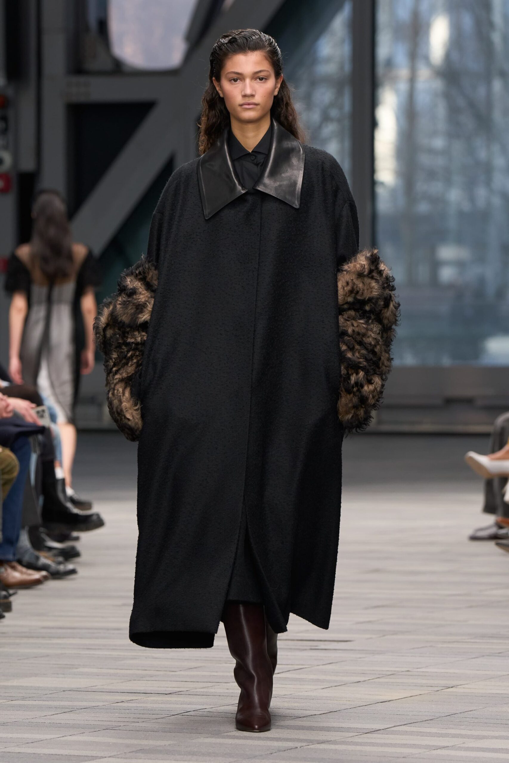 系列开场由黑白简约的服饰引领,细节经过简化处理,黑色西装采用同色条纹,窄小的翻领设计加以点缀;而一条无肩带、结构感十足的黑色裙子,几乎无缝贴合身形,展现出极简美学的精髓。接下来的羊毛外套、全皮西装、羊毛和皮革领口等,逐渐将氛围推向奢华享受。整体系列既有简洁的建筑感,也有豪华质感的柔美面料,反映出 Leoni 对 Calvin Klein 历史遗产的独特理解与延续。