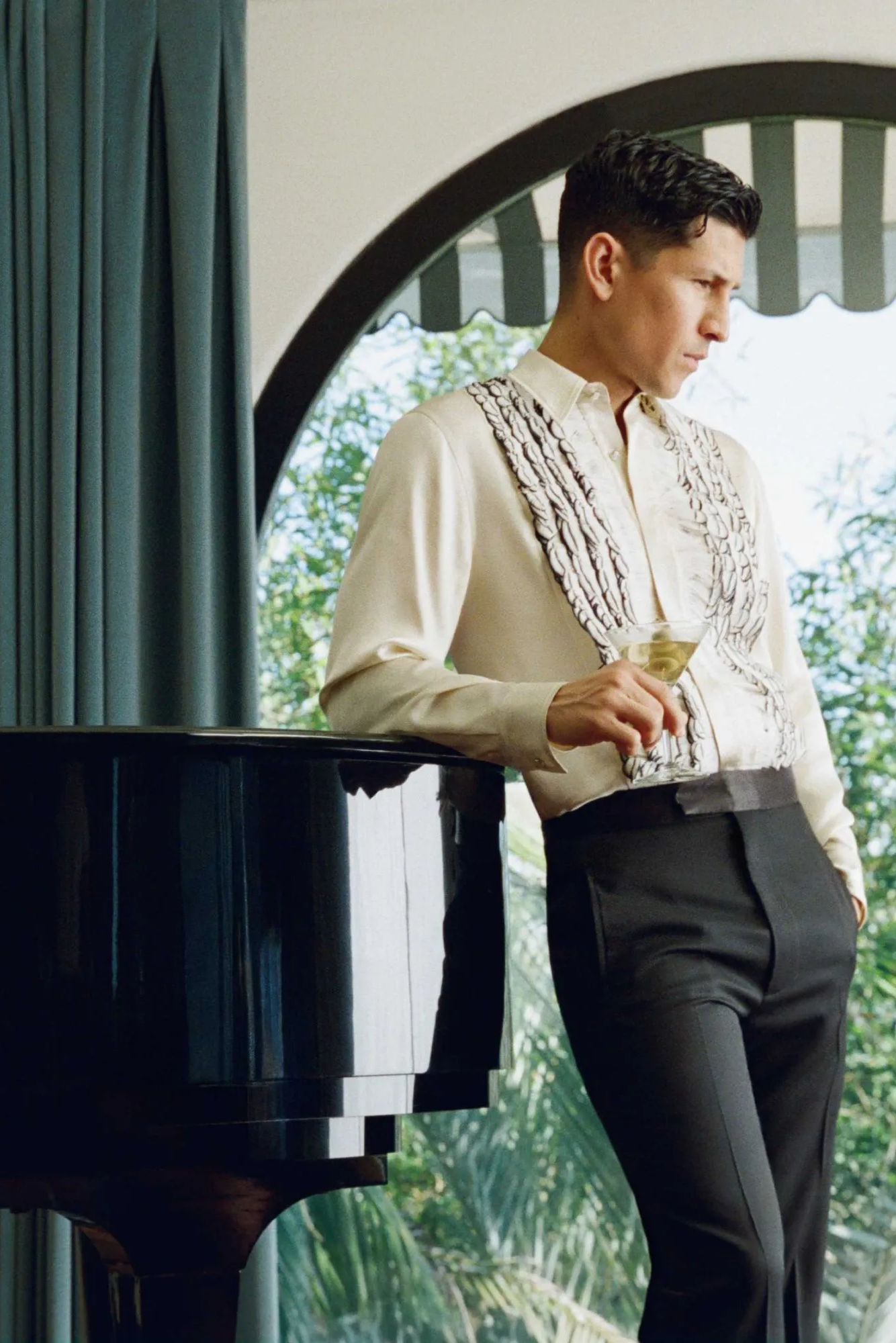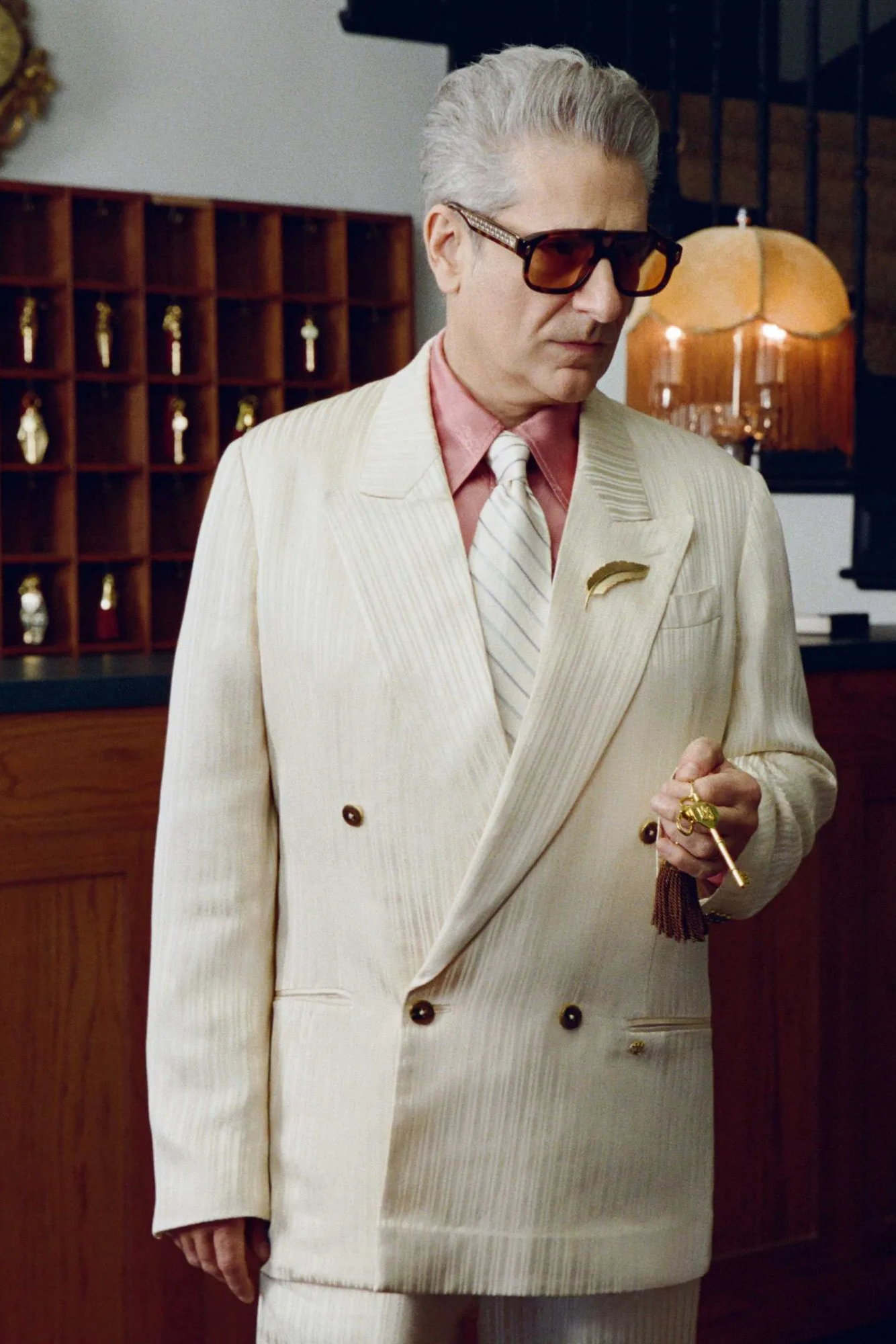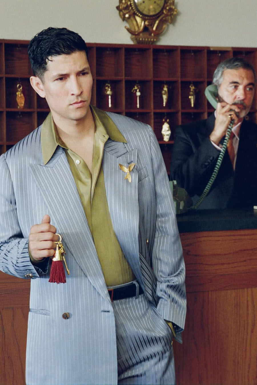 可以看到出演该片的明星阵容强大,由艾美奖和美国演员工会奖得主、金球奖提名者 Michael Imperioli 领衔主演,其他演员包括 Danny Ramirez、演员兼音乐人Malcolm McRae,以及模特 Jordan Daniels 和 Heather Diamond Strongarm。每一位明星都在 AMIRI 城堡酒店中扮演着不同的角色:身着剪裁利落的西装、怀揣梦想的演员;身着丝绸长袍、风度翩翩的制片人;身着华丽礼服、光彩夺目的好莱坞偶像;以及身着纤细闪耀晚礼服的新晋时尚偶像。他们彼此对比,相互矛盾,恰恰体现了 AMIRI 2026 春夏系列的核心理念:慵懒随性与盛装打扮、轻松自在与精致优雅共存。