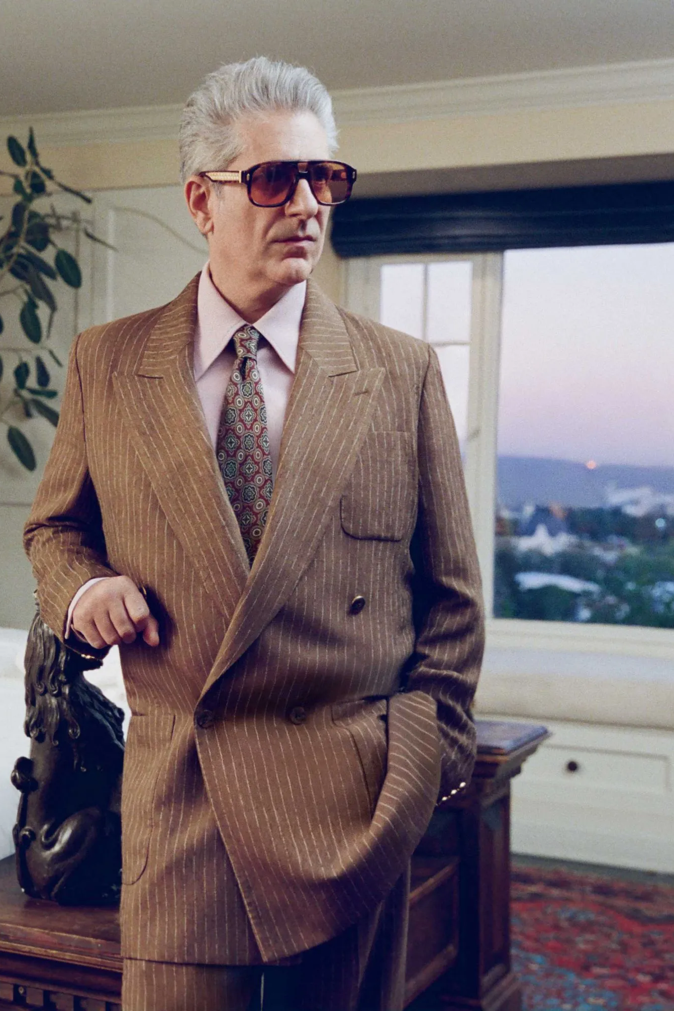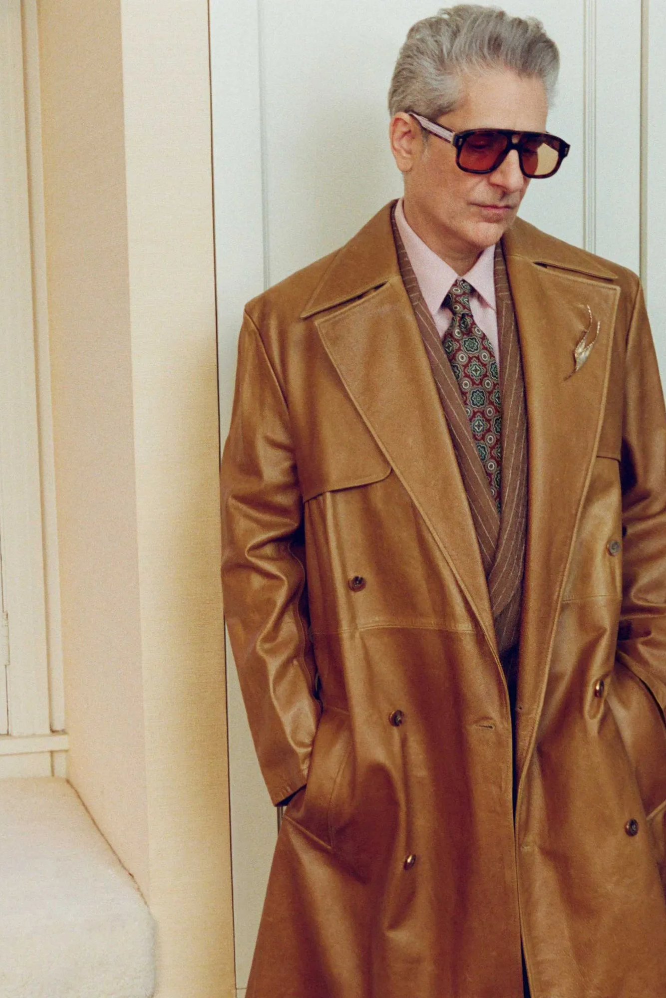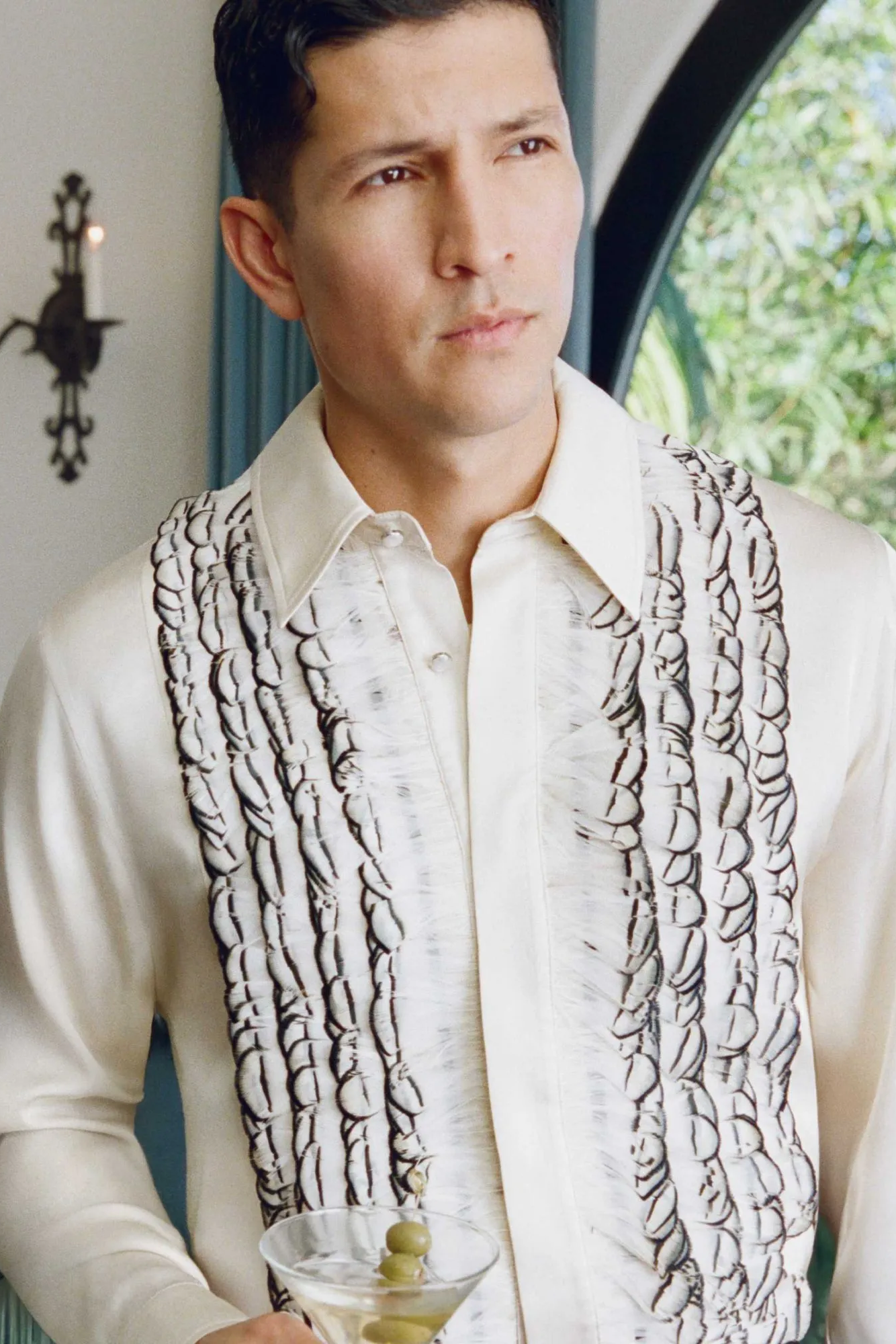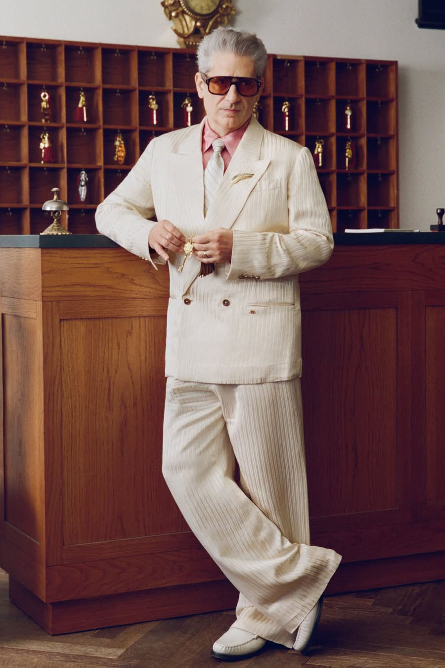 可以看到出演该片的明星阵容强大,由艾美奖和美国演员工会奖得主、金球奖提名者 Michael Imperioli 领衔主演,其他演员包括 Danny Ramirez、演员兼音乐人Malcolm McRae,以及模特 Jordan Daniels 和 Heather Diamond Strongarm。每一位明星都在 AMIRI 城堡酒店中扮演着不同的角色:身着剪裁利落的西装、怀揣梦想的演员;身着丝绸长袍、风度翩翩的制片人;身着华丽礼服、光彩夺目的好莱坞偶像;以及身着纤细闪耀晚礼服的新晋时尚偶像。他们彼此对比,相互矛盾,恰恰体现了 AMIRI 2026 春夏系列的核心理念:慵懒随性与盛装打扮、轻松自在与精致优雅共存。