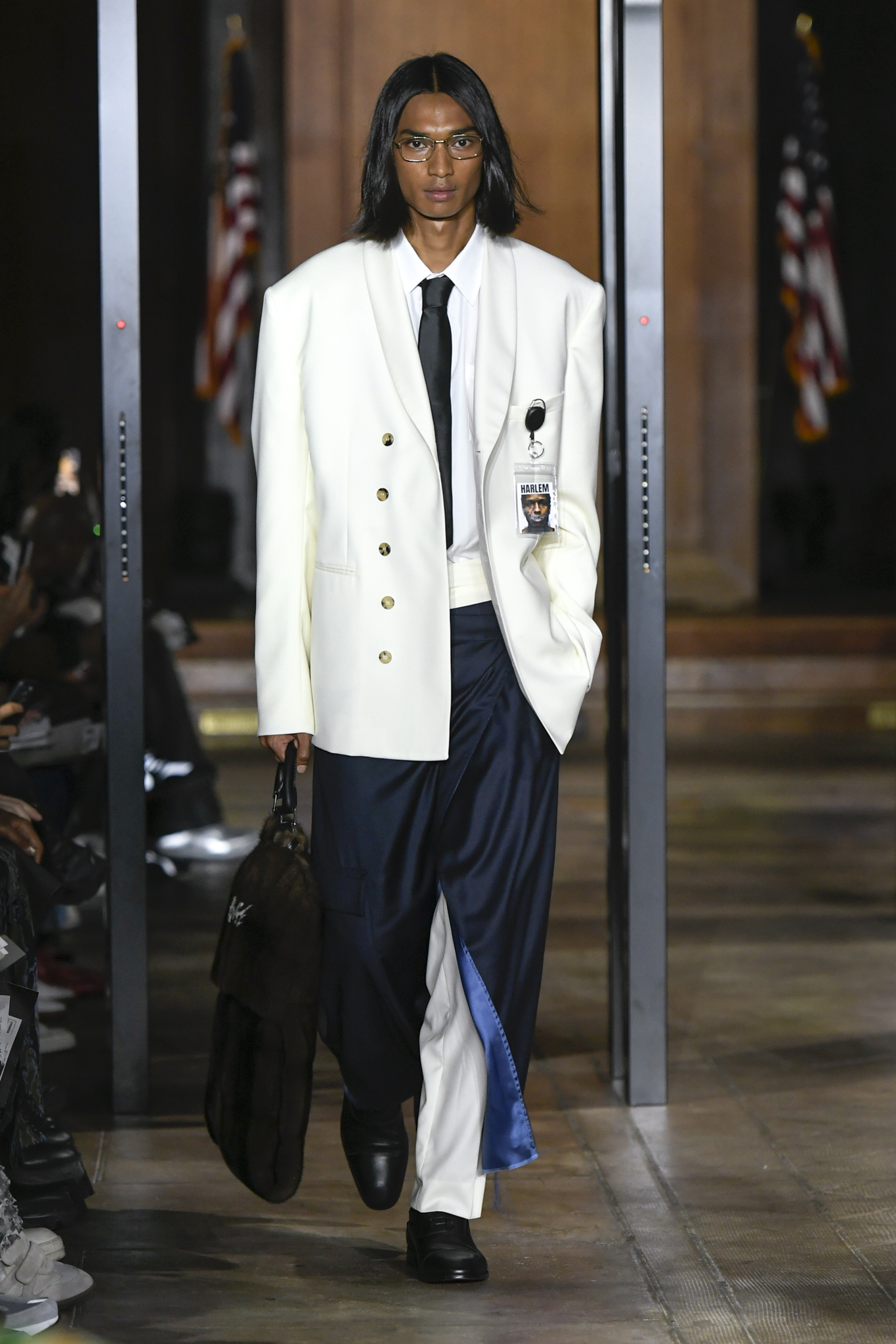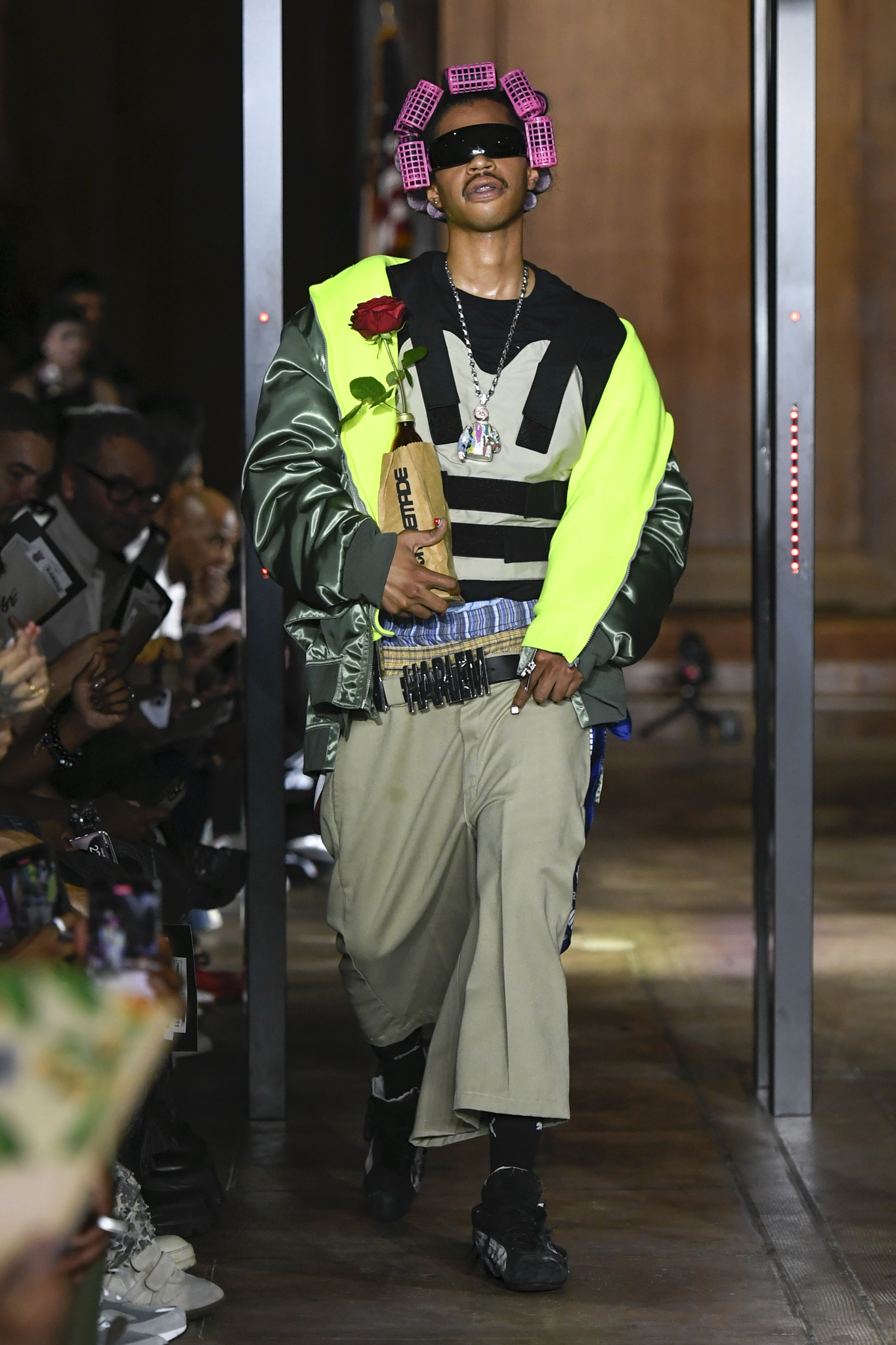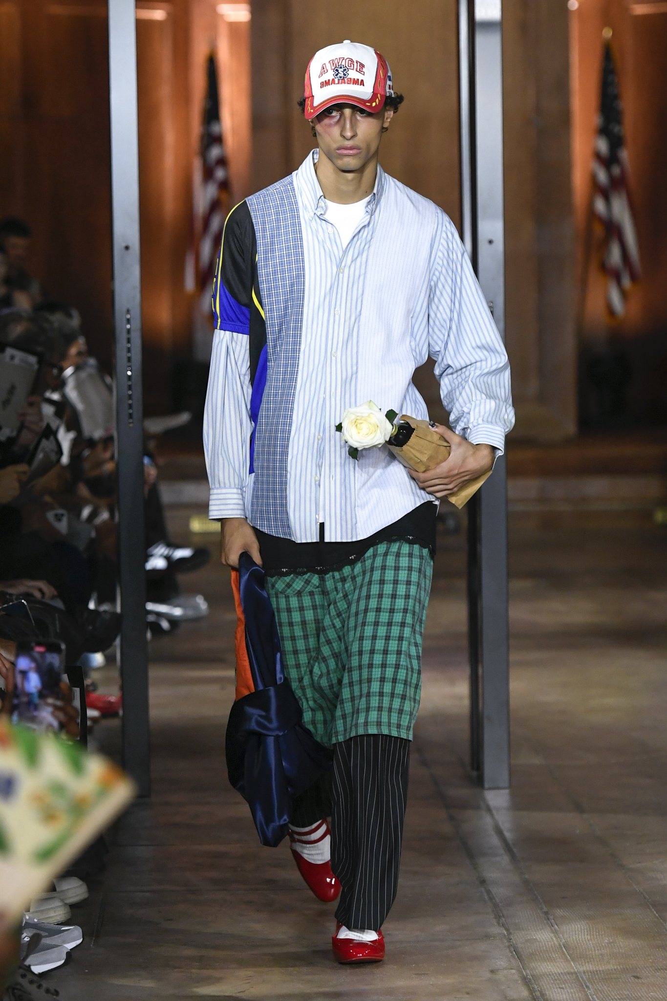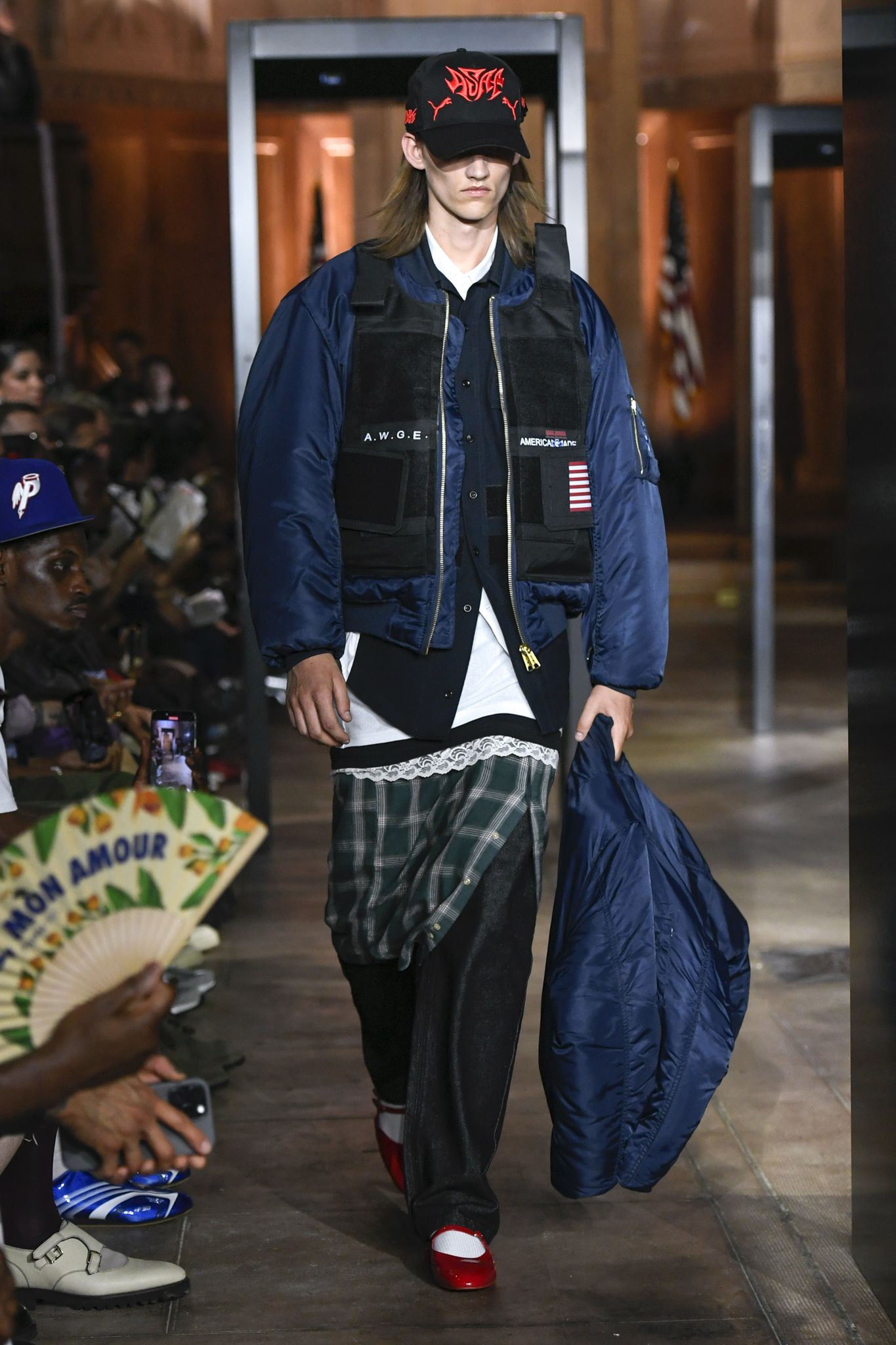 A$AP Rocky 携个人品牌 AWGE 回归家乡纽约,于市政厅旧址呈现 2026 秋季大秀。系列以「Obligatory Fashion」为主题,延续对创作过程的解构,将秀场后台搬至 T 台中央,化妆镜与等候队列成为视觉叙事的一部分。设计上模糊性别界限,融合利落剪裁、学院格纹与实用工装,并以乳胶质感、夸张比例及皮草饰边注入叛逆张力。亮点单品包括与 Puma 合作的皮质赛车外套、超大号态度包袋及皮质婴儿车,将其父亲角色与街头美学并置。秀场亦特邀蕾哈娜前排助阵,全程贯穿 Rocky 对社群、身份与日常衣着的真挚探讨。