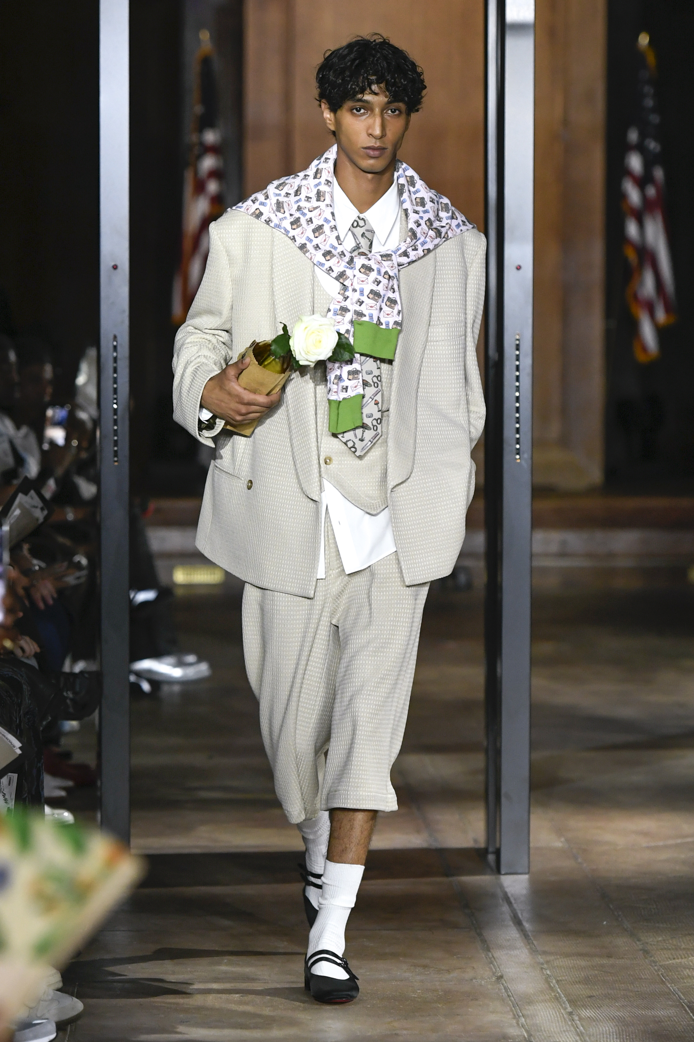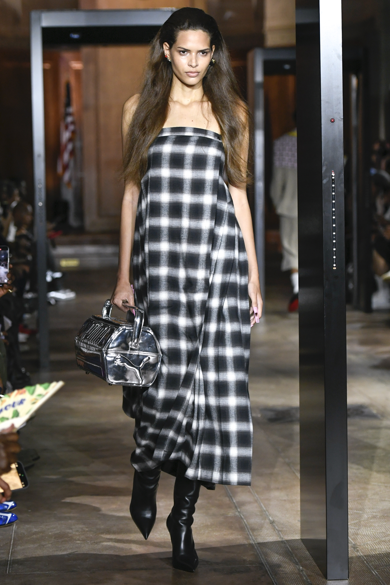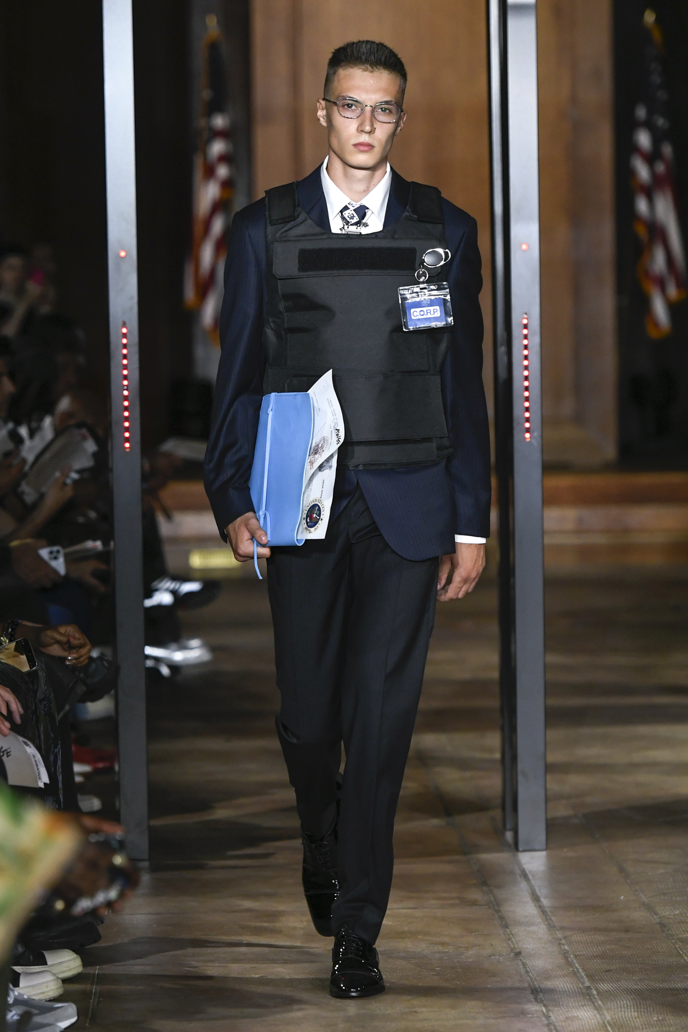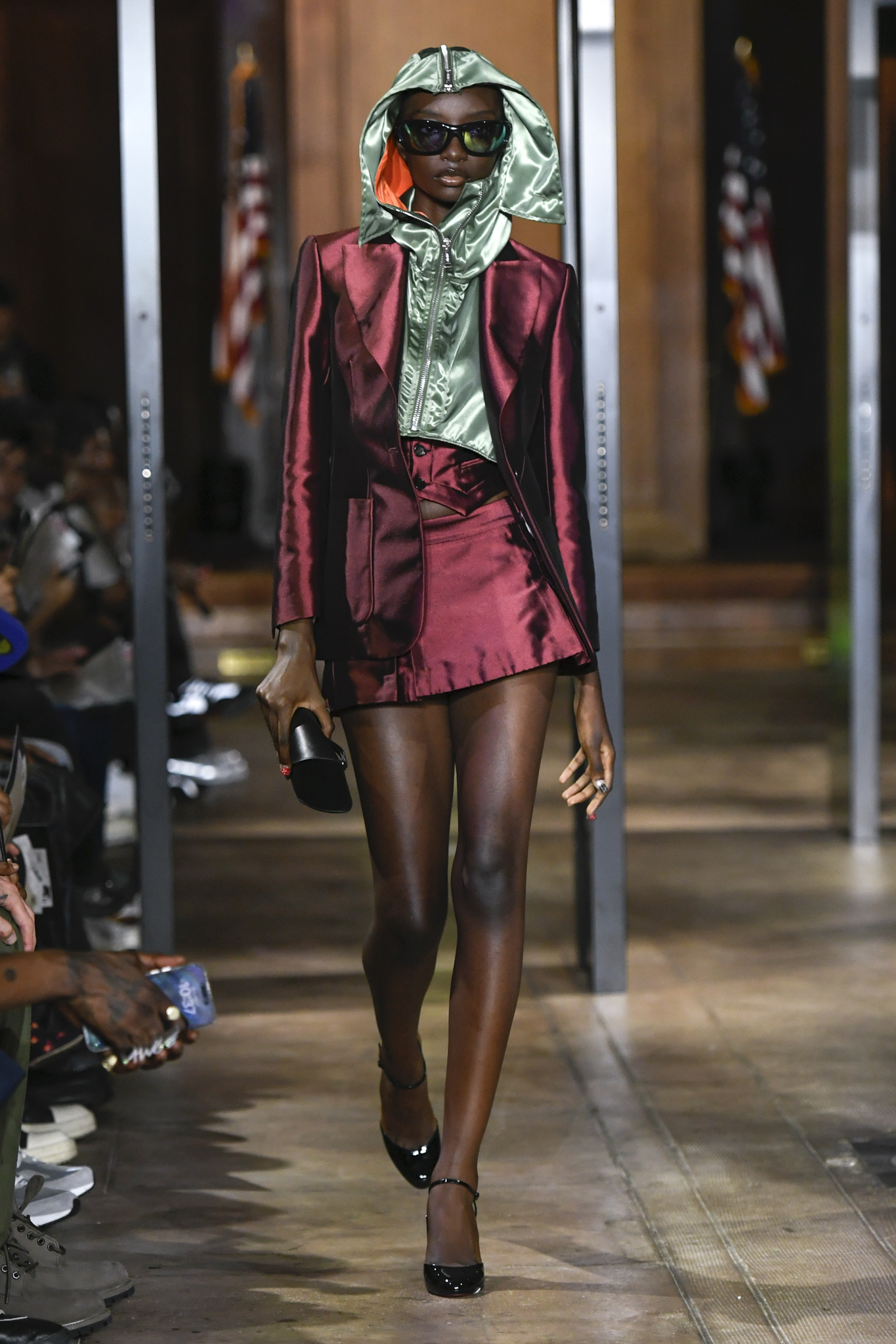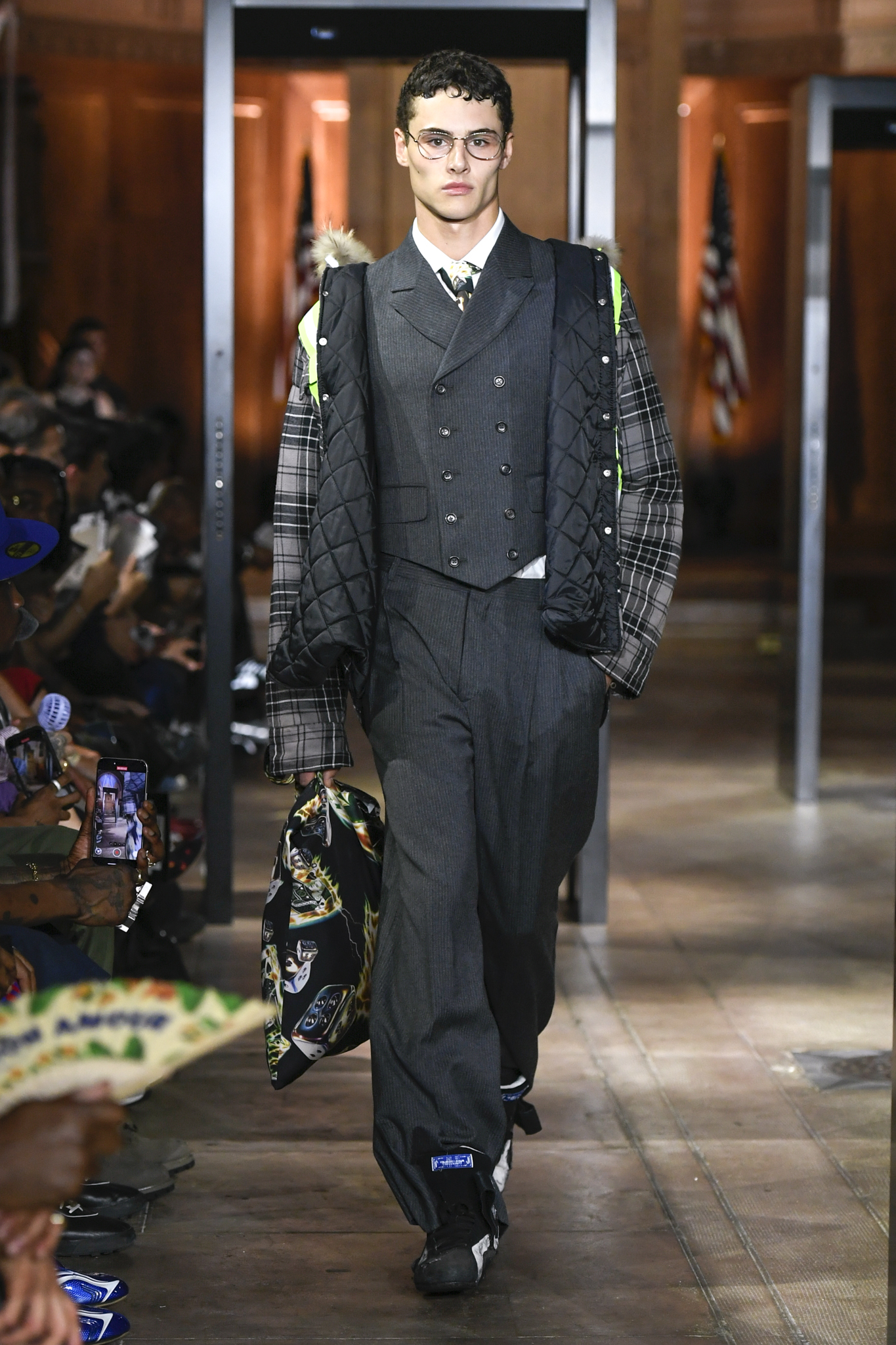 A$AP Rocky 携个人品牌 AWGE 回归家乡纽约,于市政厅旧址呈现 2026 秋季大秀。系列以「Obligatory Fashion」为主题,延续对创作过程的解构,将秀场后台搬至 T 台中央,化妆镜与等候队列成为视觉叙事的一部分。设计上模糊性别界限,融合利落剪裁、学院格纹与实用工装,并以乳胶质感、夸张比例及皮草饰边注入叛逆张力。亮点单品包括与 Puma 合作的皮质赛车外套、超大号态度包袋及皮质婴儿车,将其父亲角色与街头美学并置。秀场亦特邀蕾哈娜前排助阵,全程贯穿 Rocky 对社群、身份与日常衣着的真挚探讨。