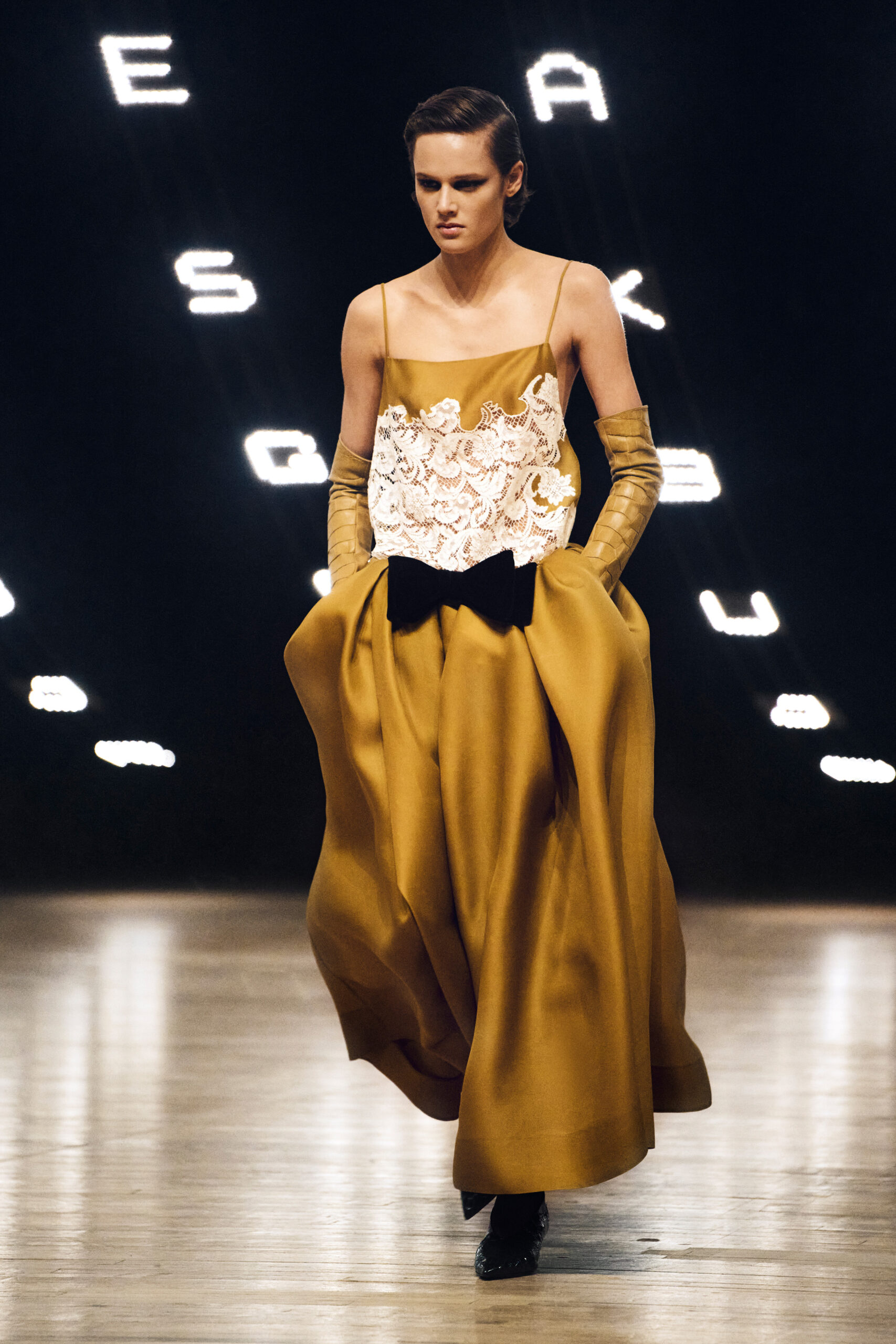 大秀空间与视觉呈现则由 Griffin Frazen 负责设计,借助 Park Avenue Armory 的建筑尺度与历史氛围,为系列营造出克制而富有张力的展示语境。整体秀场在安静与力量并存的节奏中推进,使服装本身成为叙事核心,也再次巩固了 KHAITE 在当代奢华女装领域中的独特位置。