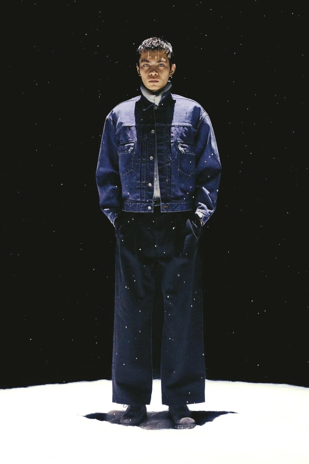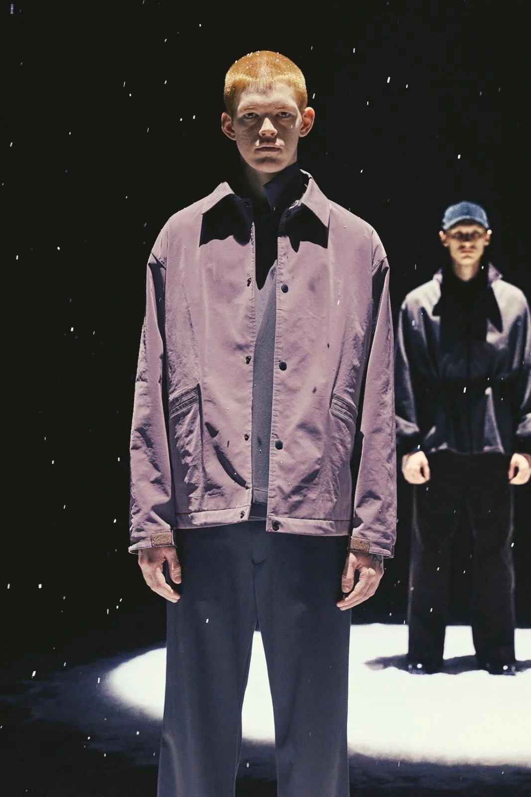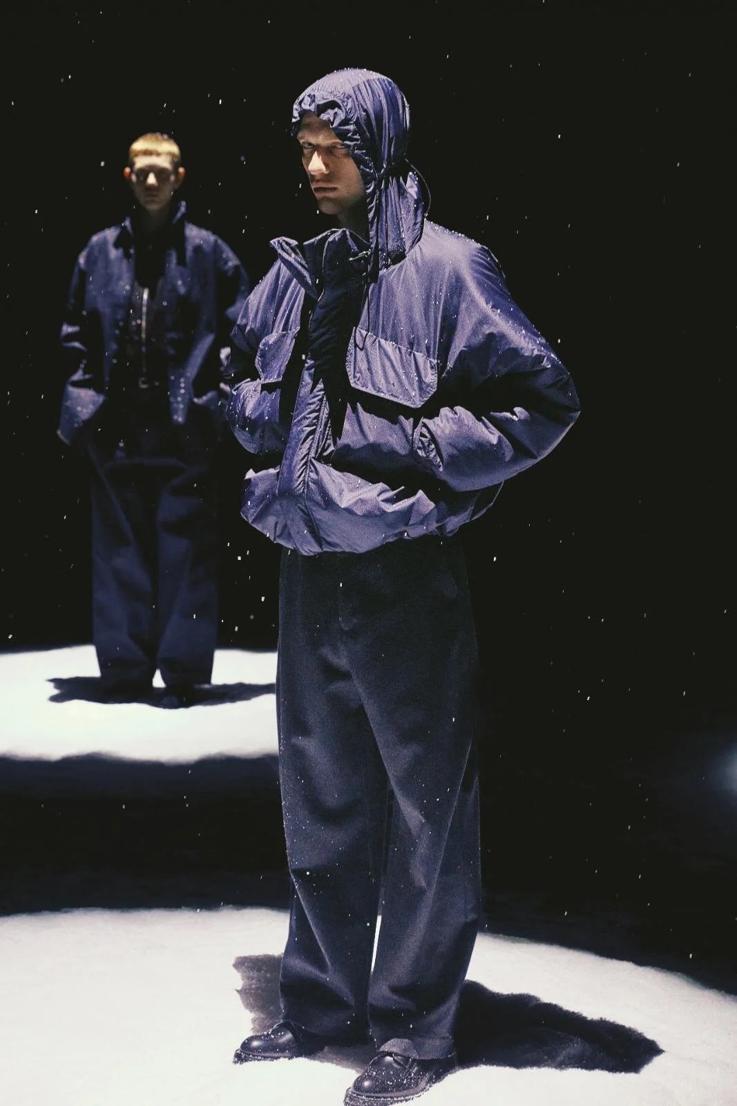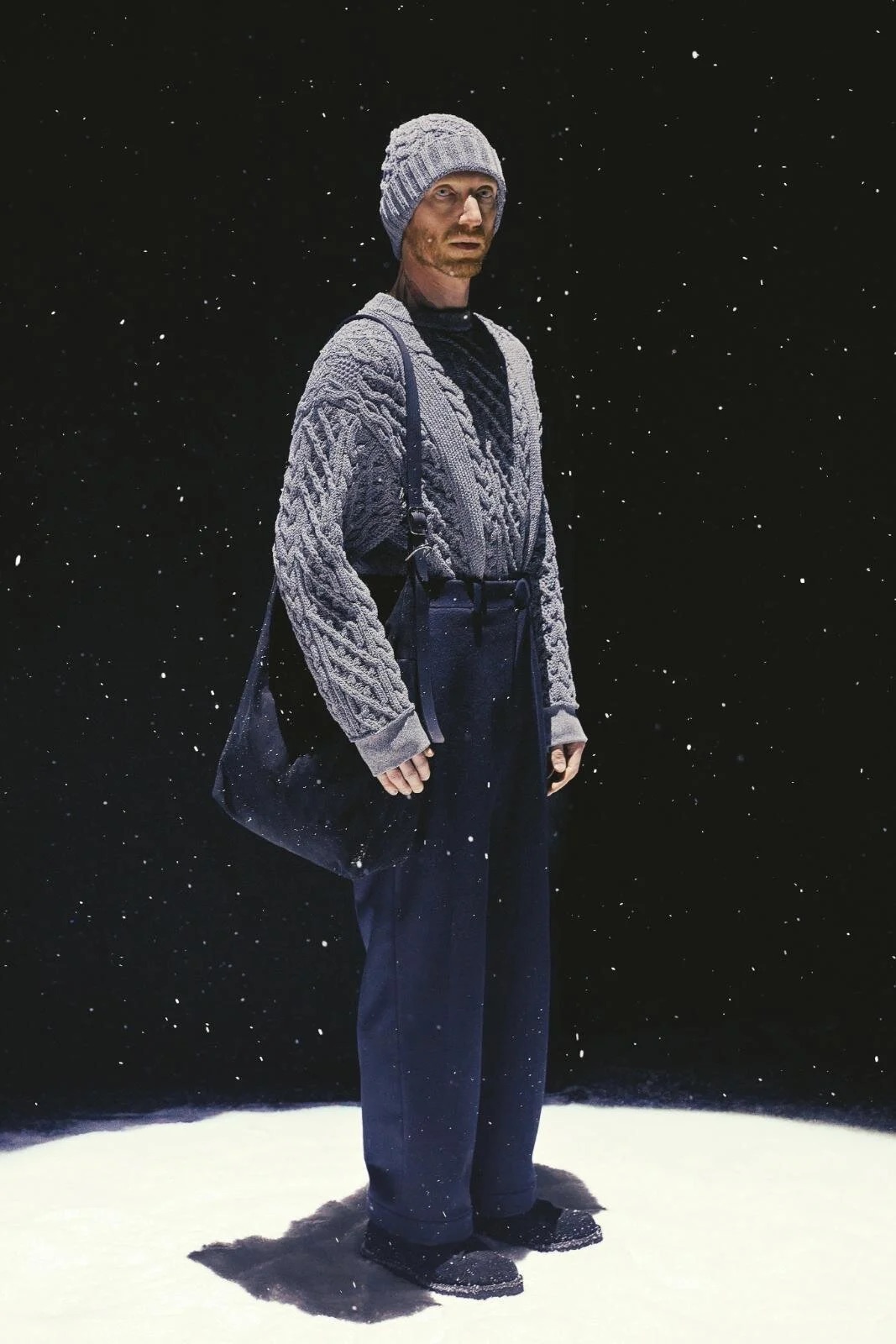 尾花大辅表示:「在这个系列中,我将羽绒背心和羽绒服作为内搭,贯穿所有造型,并将它们融入相对传统的穿搭风格中。我想展现格陵兰岛和冰岛等地原住民服饰中独特的叠穿理念,以及那些受严寒气候影响的文化。我认为这种非传统的叠穿方式贯穿了整个系列。」设计师还从英国传统服饰和 20 世纪 80 年代的后现代建筑风格中汲取灵感,再次展现了他能将传统服饰改造得既新颖又时尚的能力。