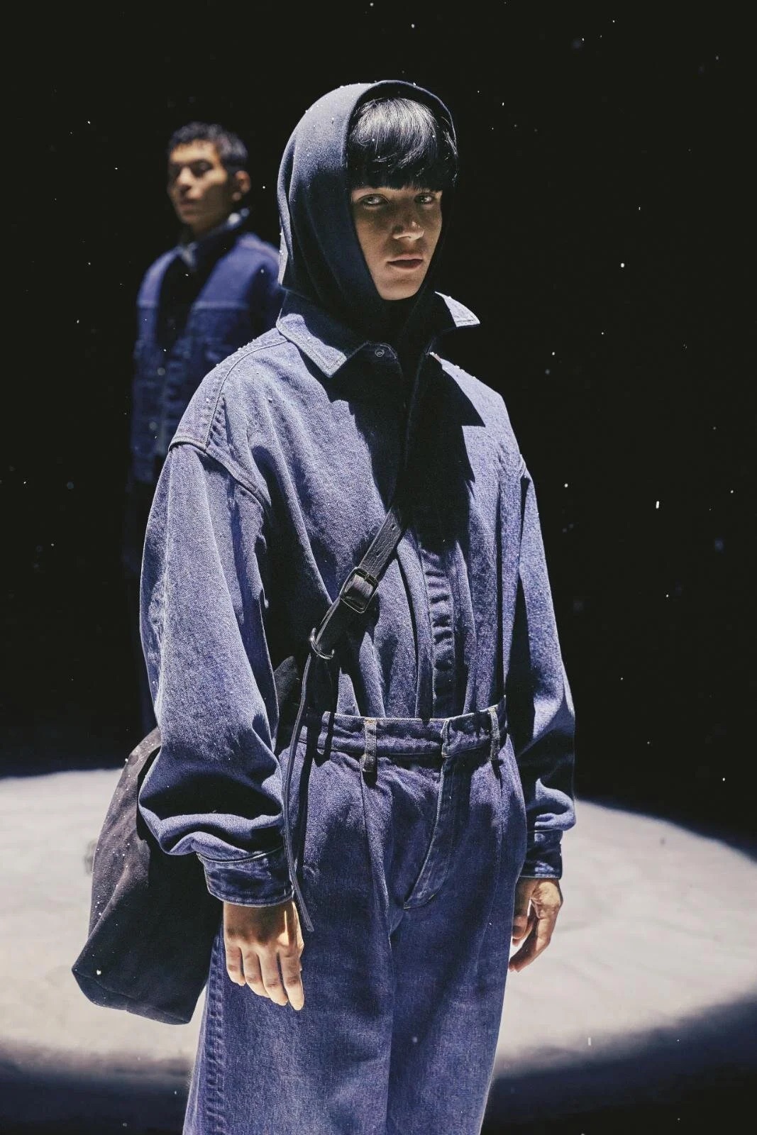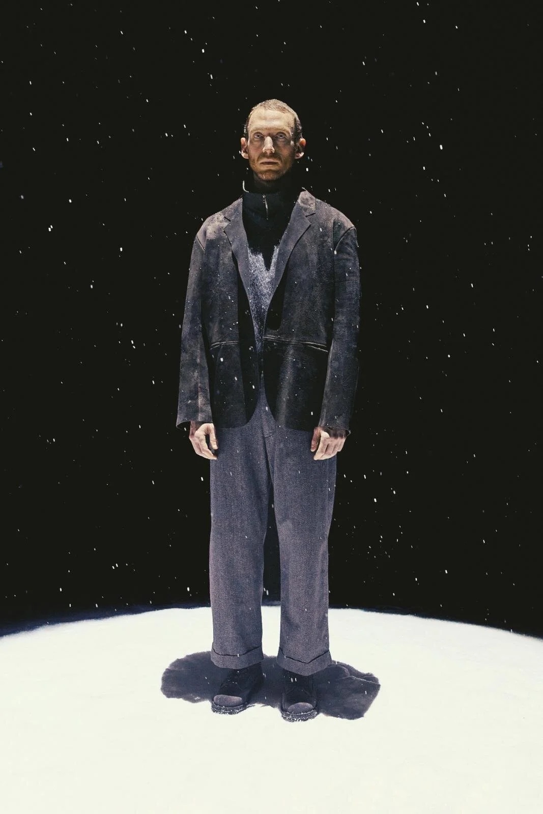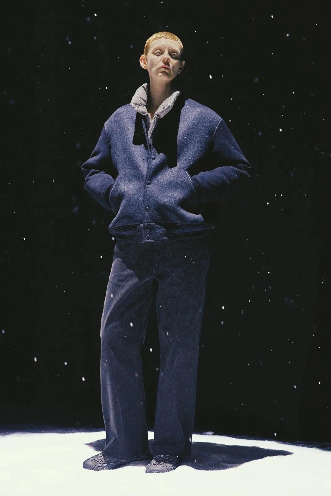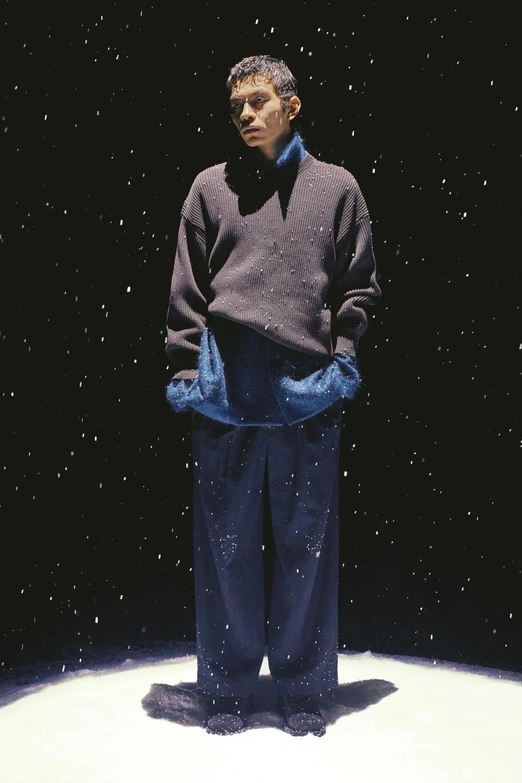 尾花大辅表示:「在这个系列中,我将羽绒背心和羽绒服作为内搭,贯穿所有造型,并将它们融入相对传统的穿搭风格中。我想展现格陵兰岛和冰岛等地原住民服饰中独特的叠穿理念,以及那些受严寒气候影响的文化。我认为这种非传统的叠穿方式贯穿了整个系列。」设计师还从英国传统服饰和 20 世纪 80 年代的后现代建筑风格中汲取灵感,再次展现了他能将传统服饰改造得既新颖又时尚的能力。