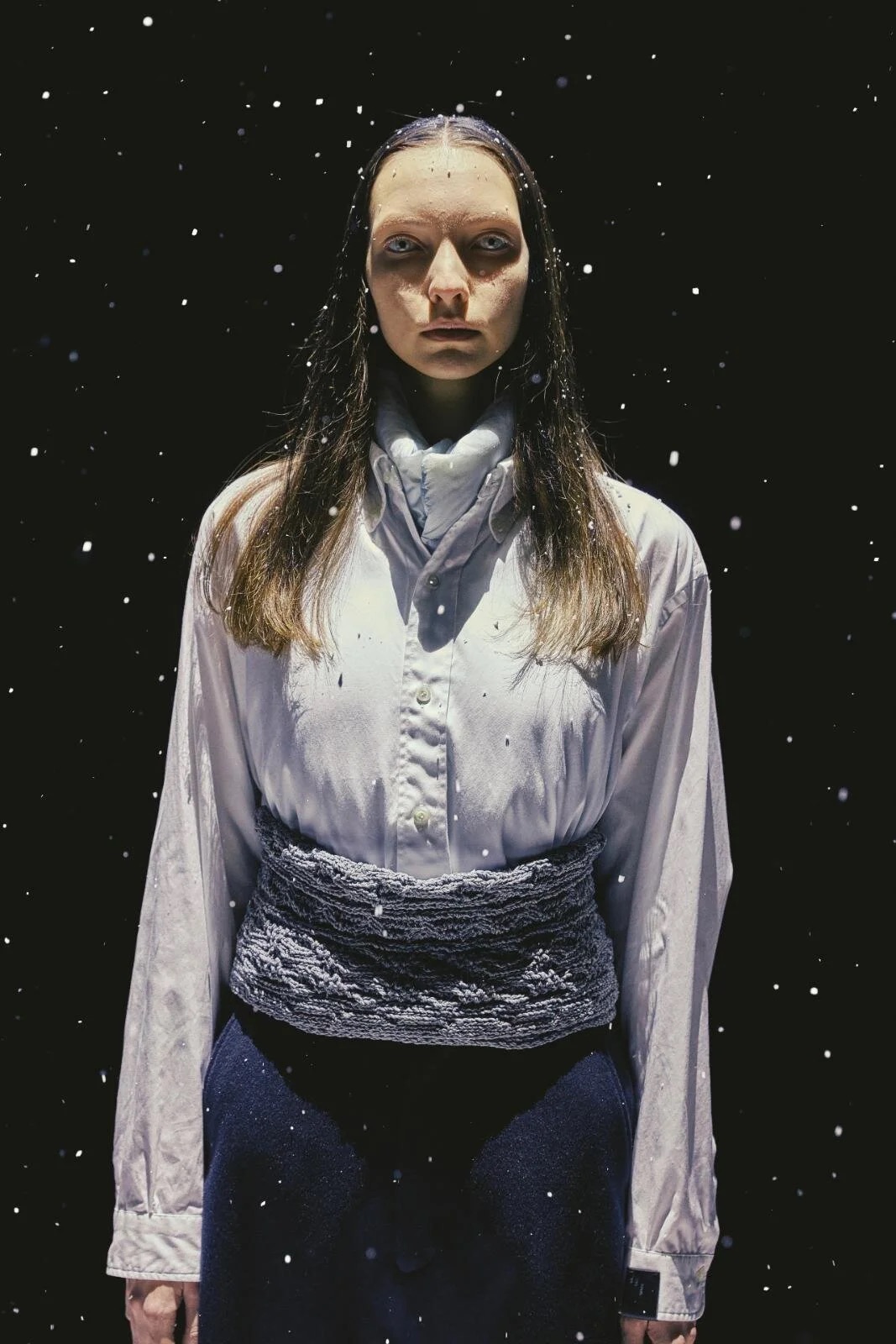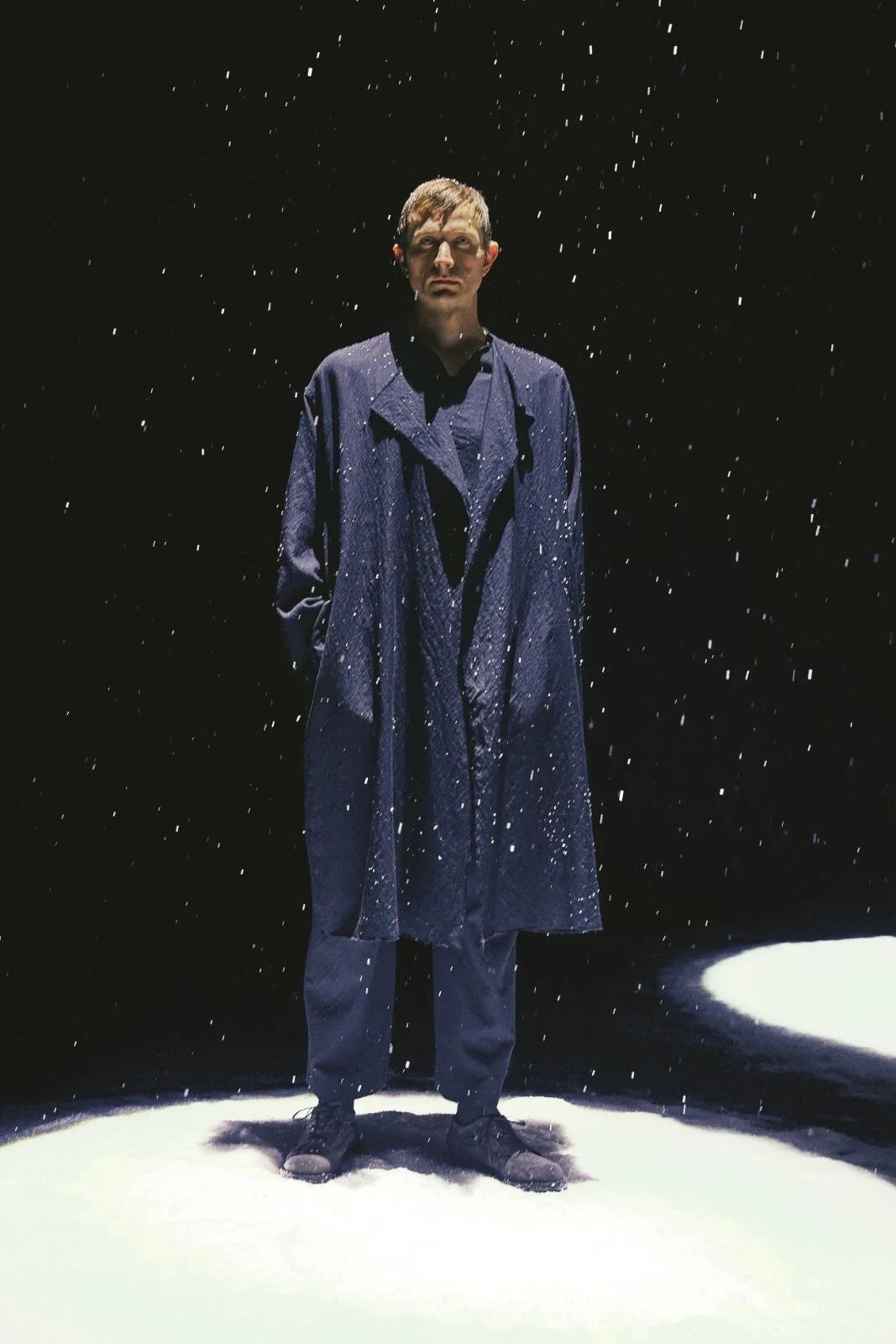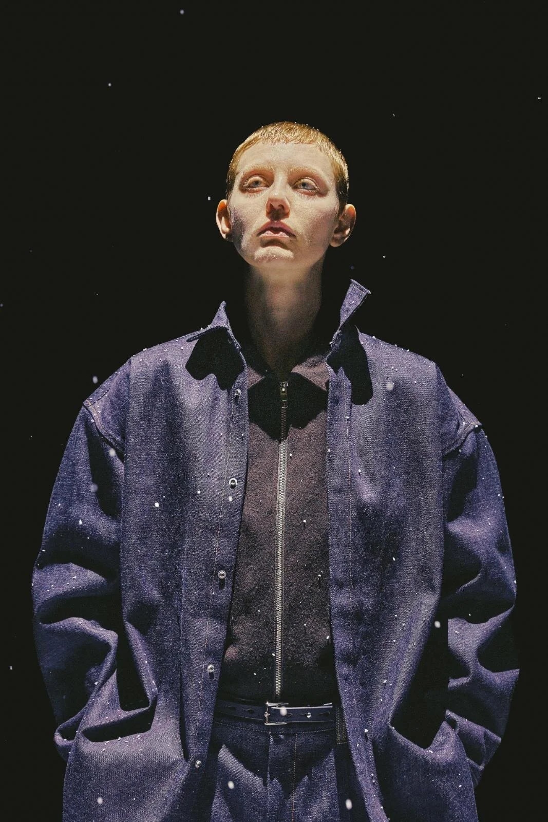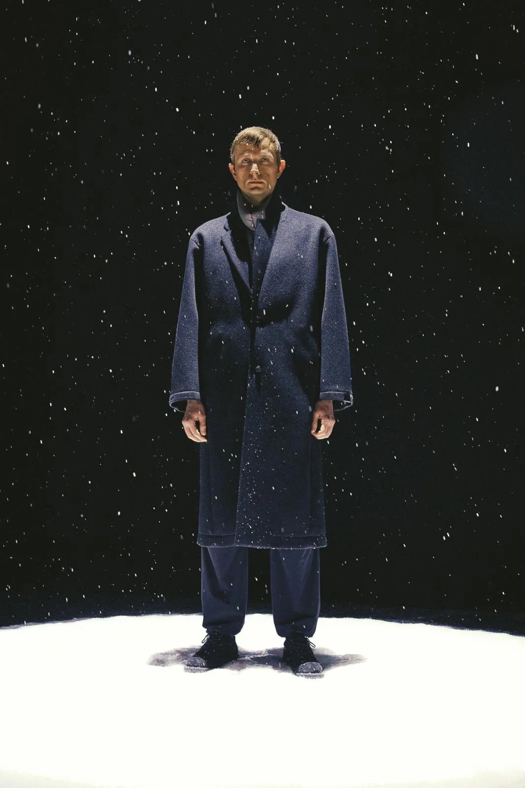 尾花大辅表示:「在这个系列中,我将羽绒背心和羽绒服作为内搭,贯穿所有造型,并将它们融入相对传统的穿搭风格中。我想展现格陵兰岛和冰岛等地原住民服饰中独特的叠穿理念,以及那些受严寒气候影响的文化。我认为这种非传统的叠穿方式贯穿了整个系列。」设计师还从英国传统服饰和 20 世纪 80 年代的后现代建筑风格中汲取灵感,再次展现了他能将传统服饰改造得既新颖又时尚的能力。