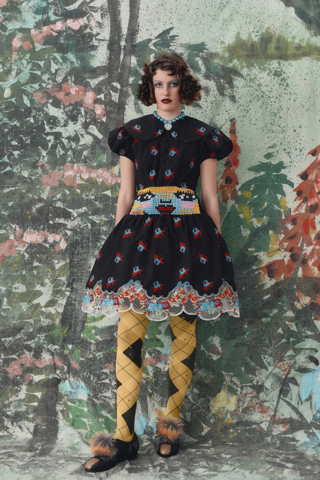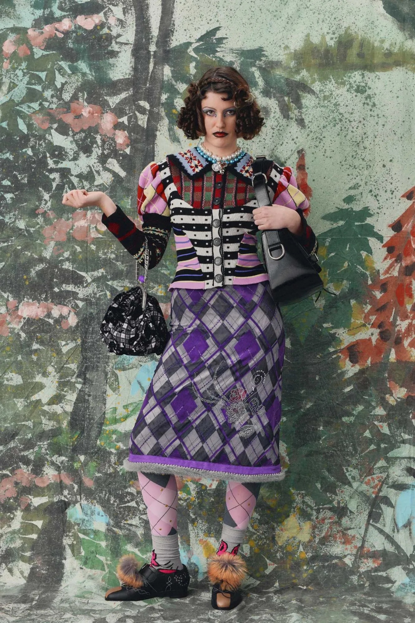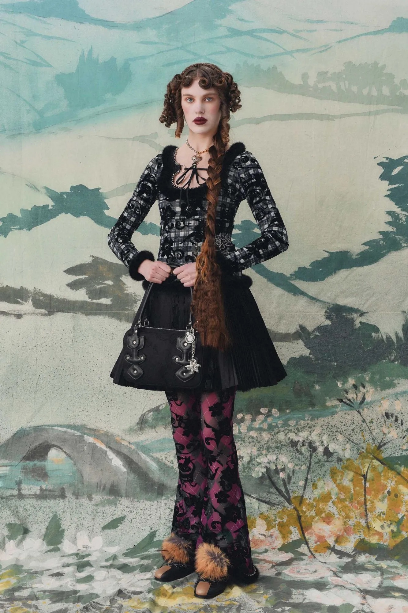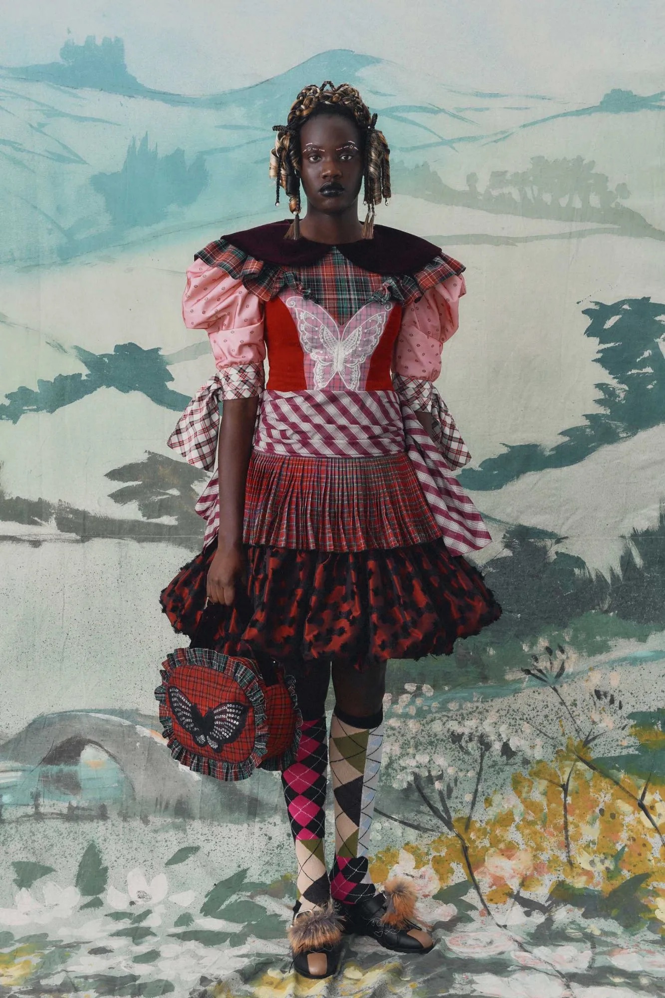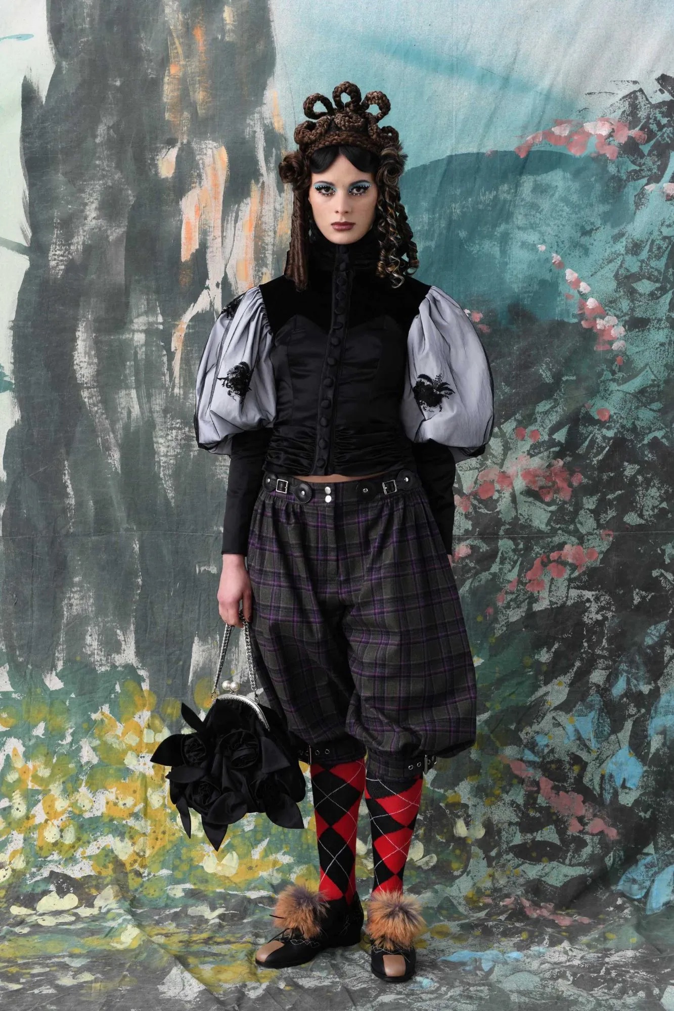 与此同时,饰有缎带和卷边的针织衫、宽大的方形领口、低腰丰满的束腰裙,以及大量使用的珠饰和玫瑰花,都直接取材于摄政时代的服装廓形和装饰。当时流行的玫瑰花袖出现在简洁的白色衬衫和浪漫的黑色丧服上,饰有珠饰的连衣裙和棉质小珠半裙是对当时广泛流传的珠饰工艺传统的致敬。从高地格子呢到伦敦女孩佩戴的颈链,一切都散发着浓郁的英伦气息。