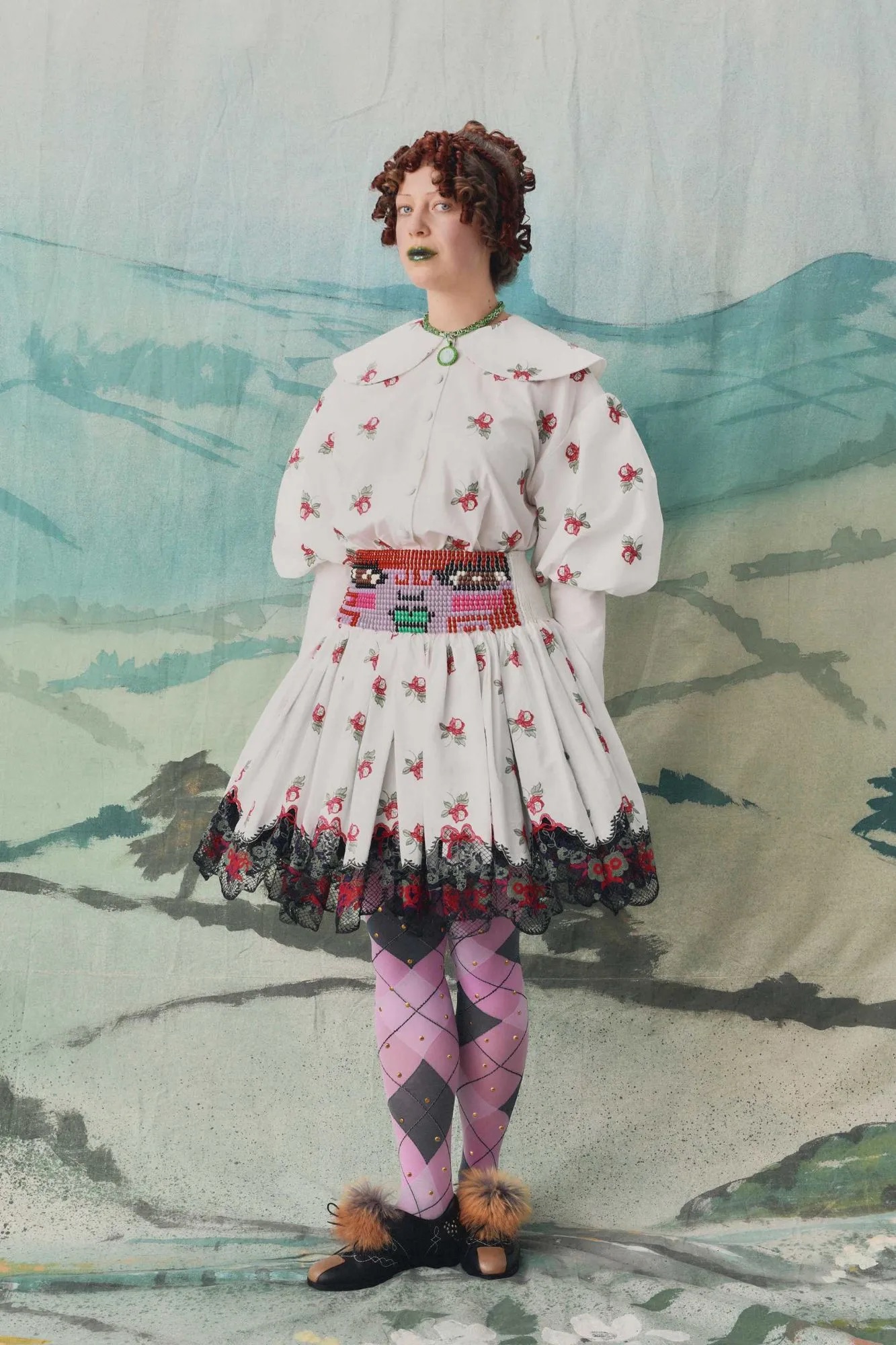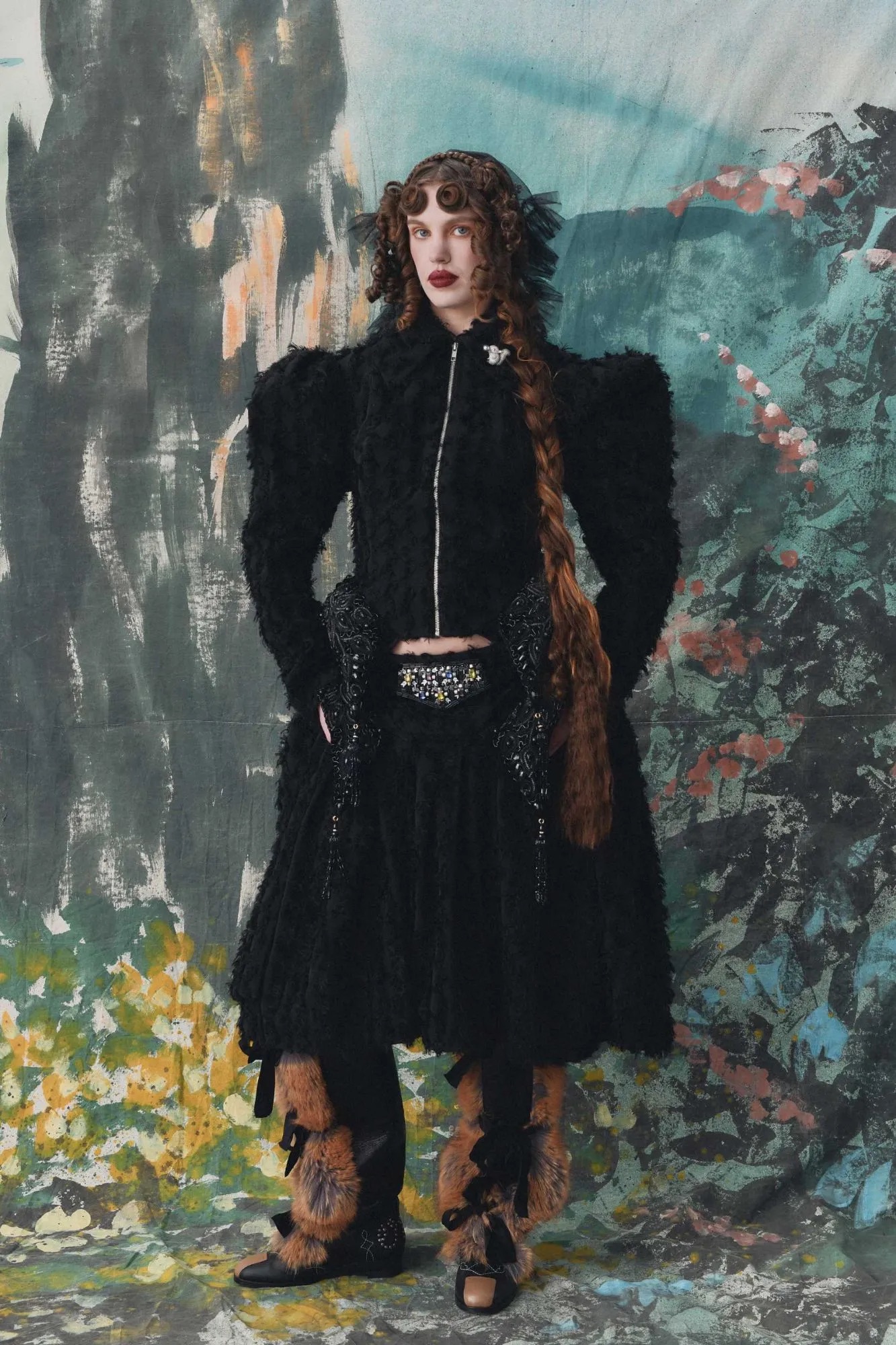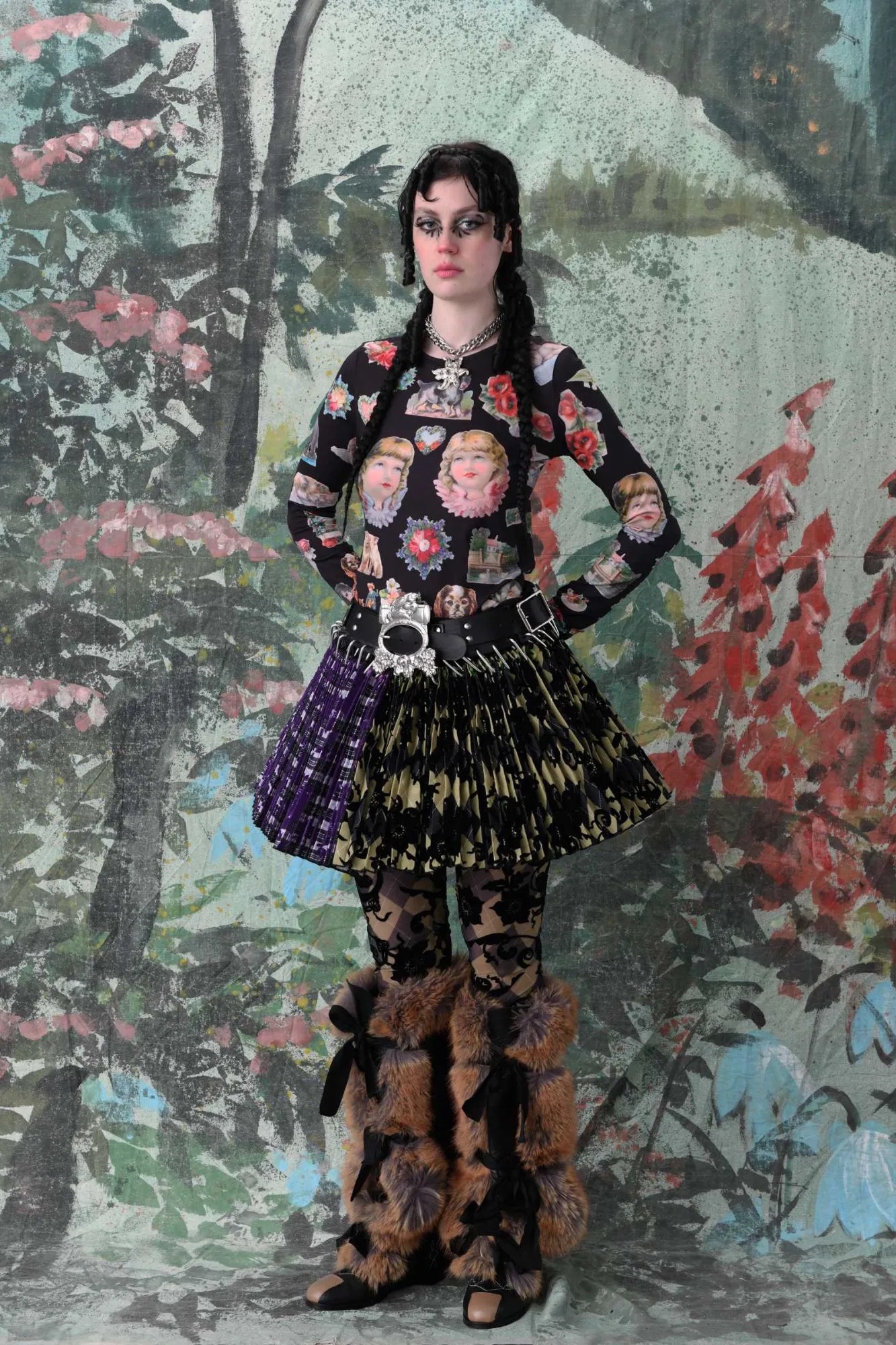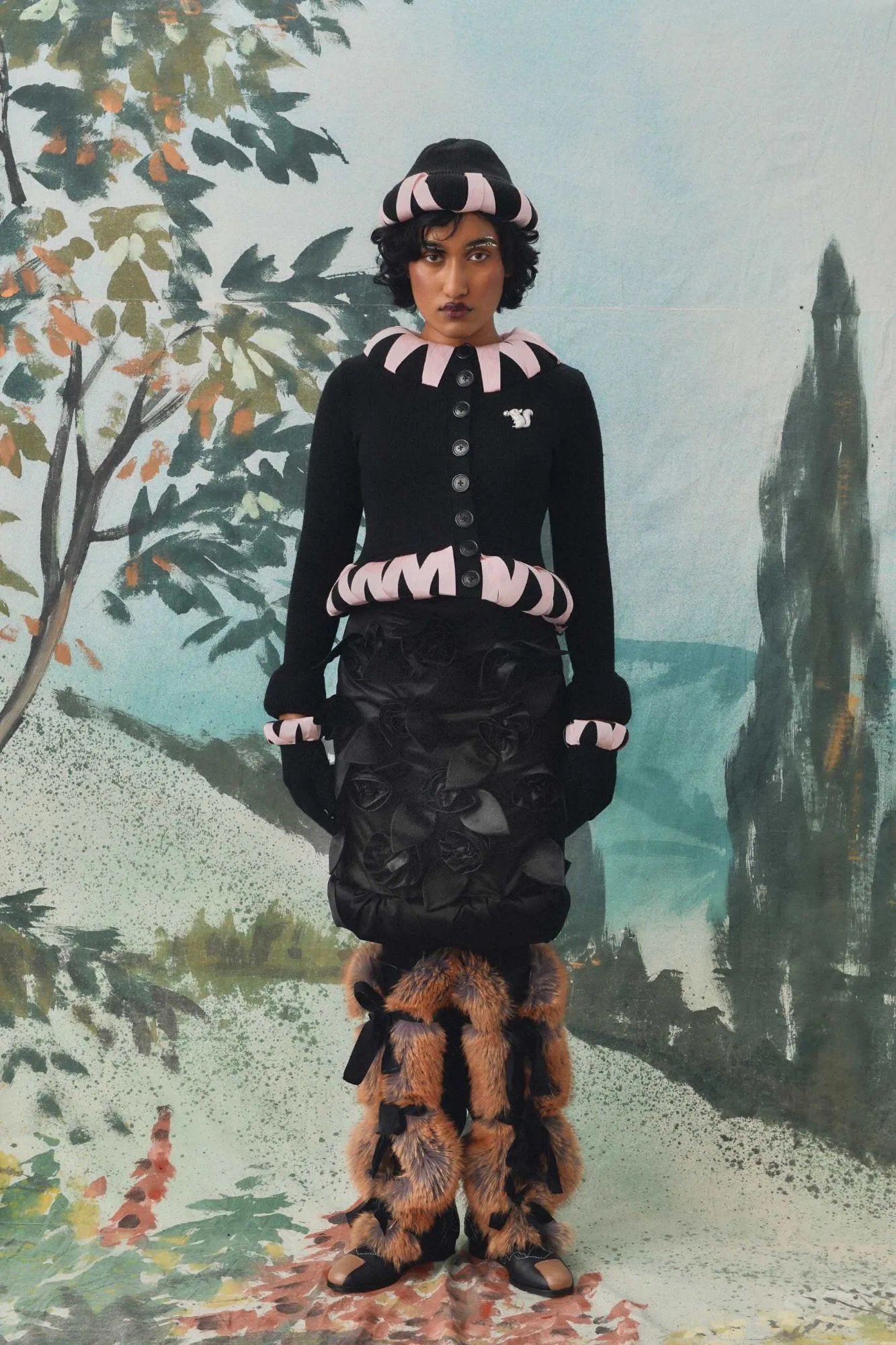 与此同时,饰有缎带和卷边的针织衫、宽大的方形领口、低腰丰满的束腰裙,以及大量使用的珠饰和玫瑰花,都直接取材于摄政时代的服装廓形和装饰。当时流行的玫瑰花袖出现在简洁的白色衬衫和浪漫的黑色丧服上,饰有珠饰的连衣裙和棉质小珠半裙是对当时广泛流传的珠饰工艺传统的致敬。从高地格子呢到伦敦女孩佩戴的颈链,一切都散发着浓郁的英伦气息。