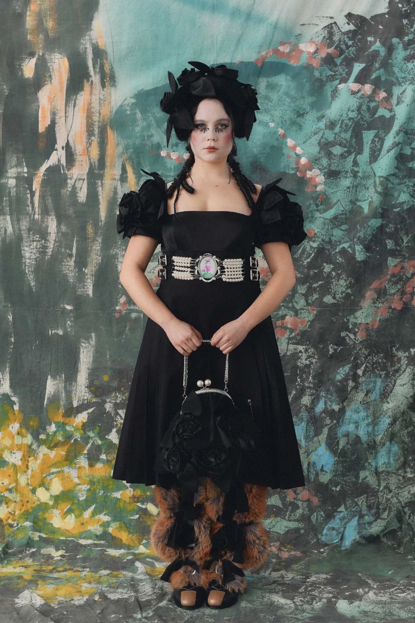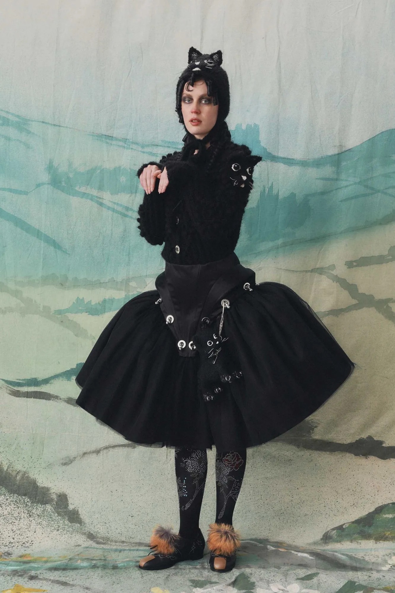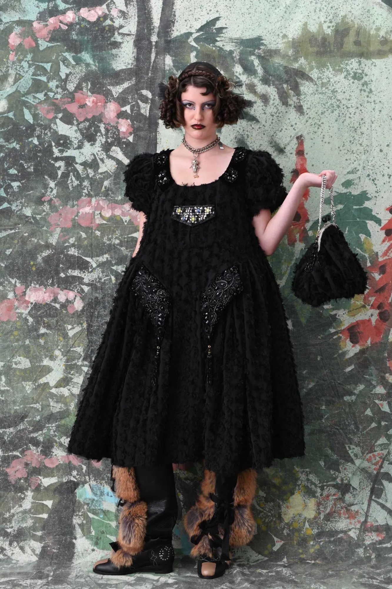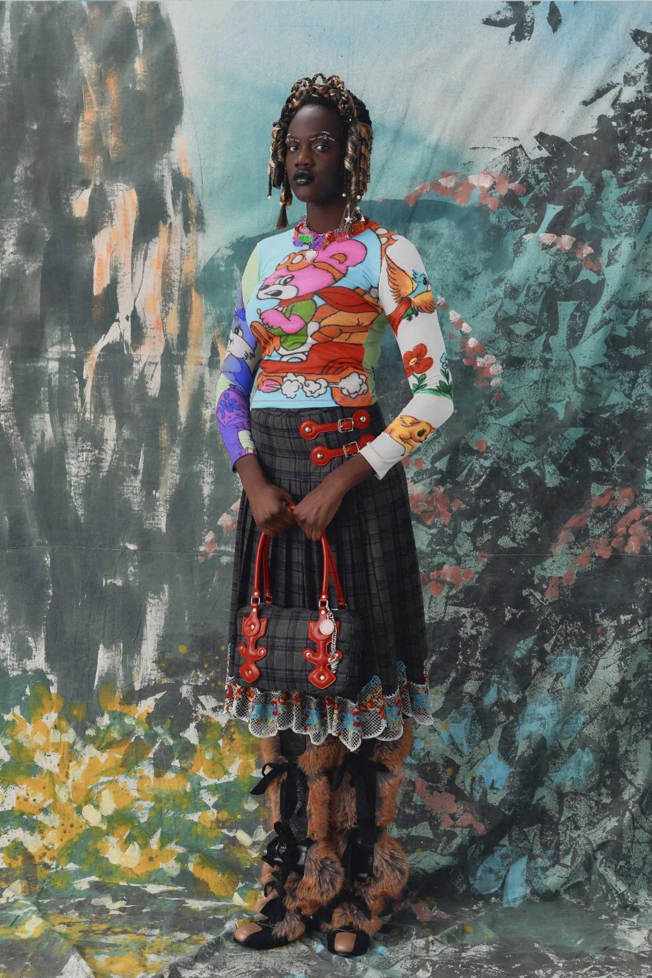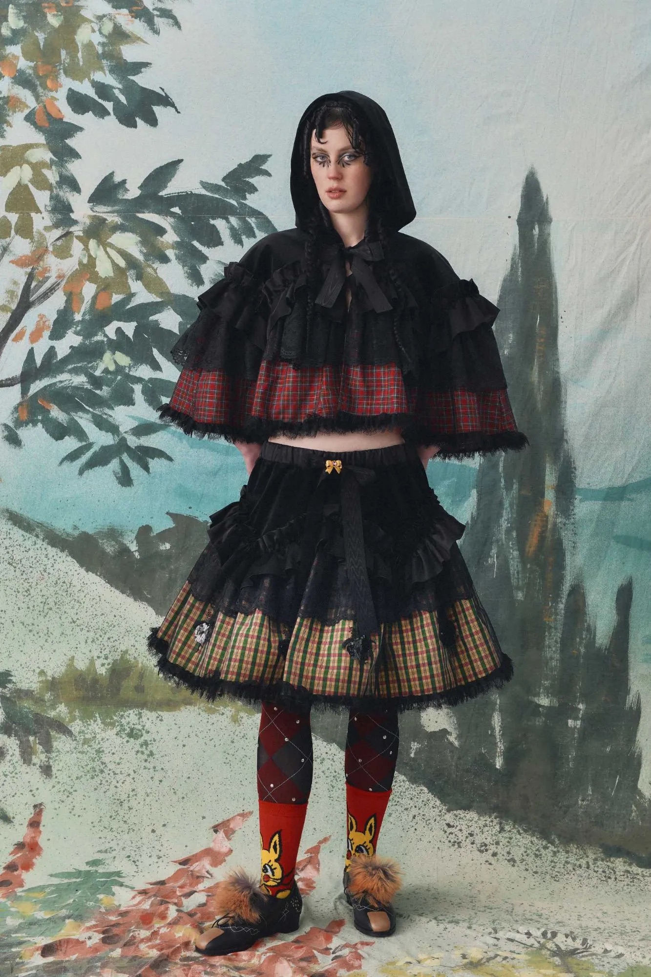 与此同时,饰有缎带和卷边的针织衫、宽大的方形领口、低腰丰满的束腰裙,以及大量使用的珠饰和玫瑰花,都直接取材于摄政时代的服装廓形和装饰。当时流行的玫瑰花袖出现在简洁的白色衬衫和浪漫的黑色丧服上,饰有珠饰的连衣裙和棉质小珠半裙是对当时广泛流传的珠饰工艺传统的致敬。从高地格子呢到伦敦女孩佩戴的颈链,一切都散发着浓郁的英伦气息。