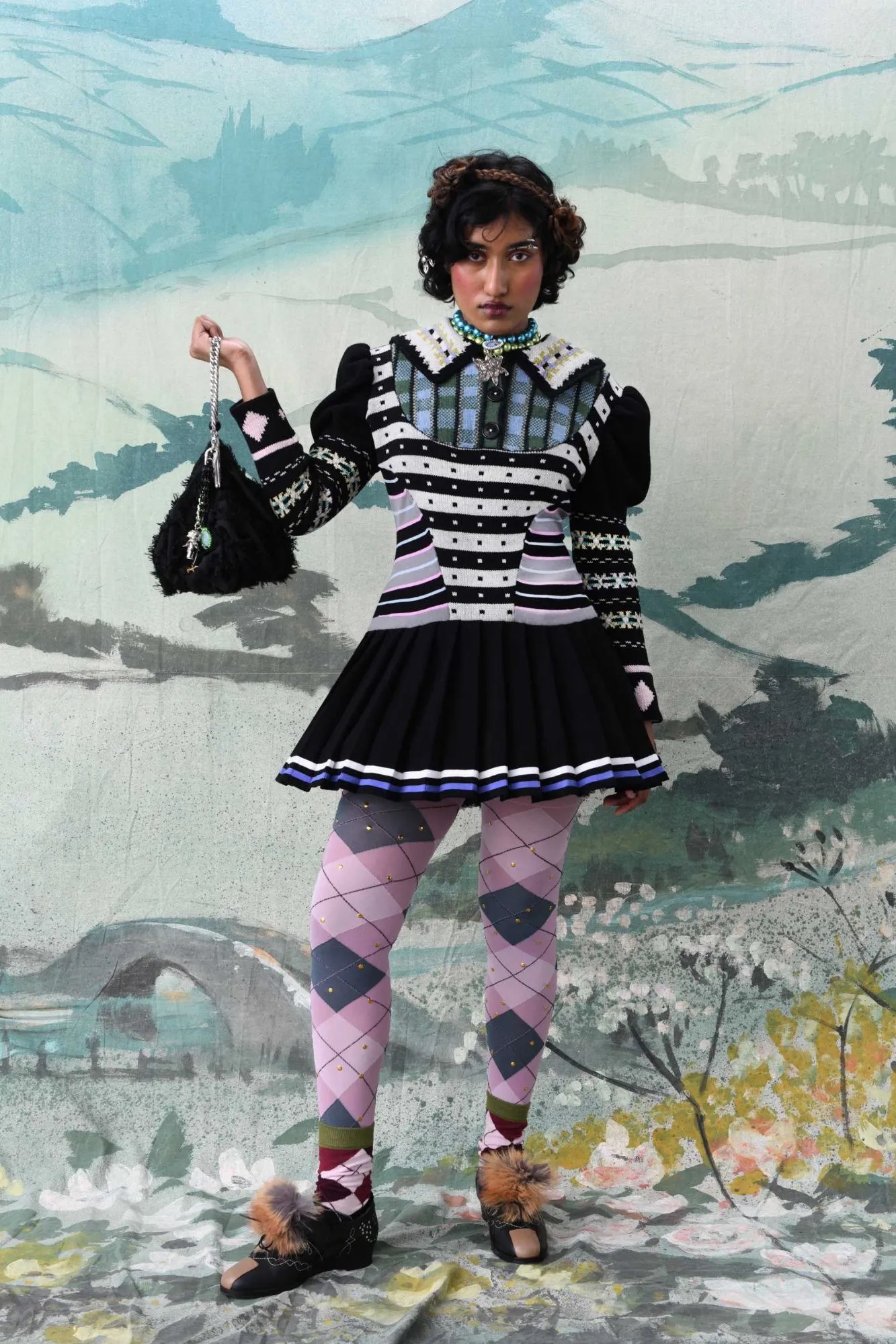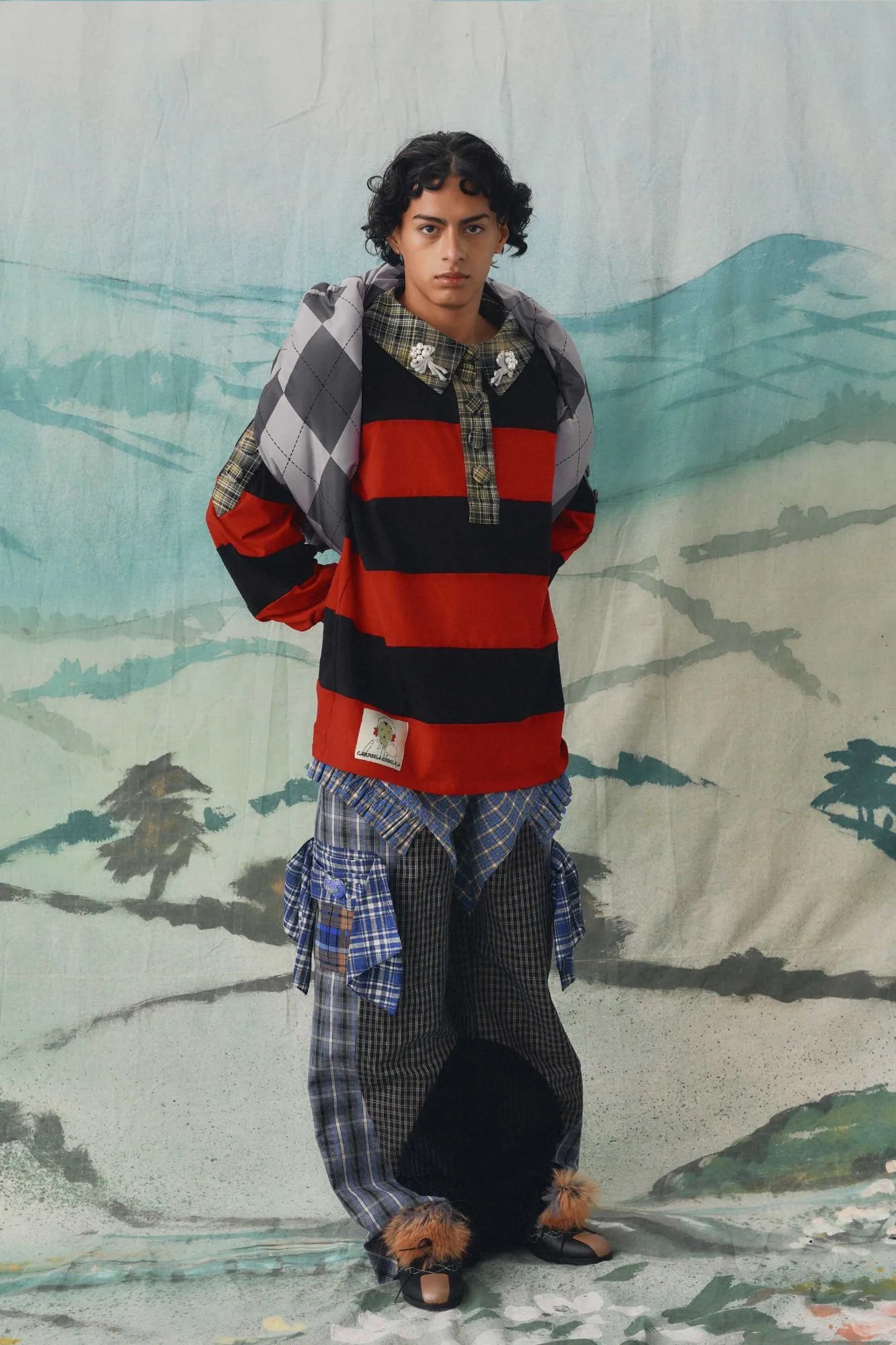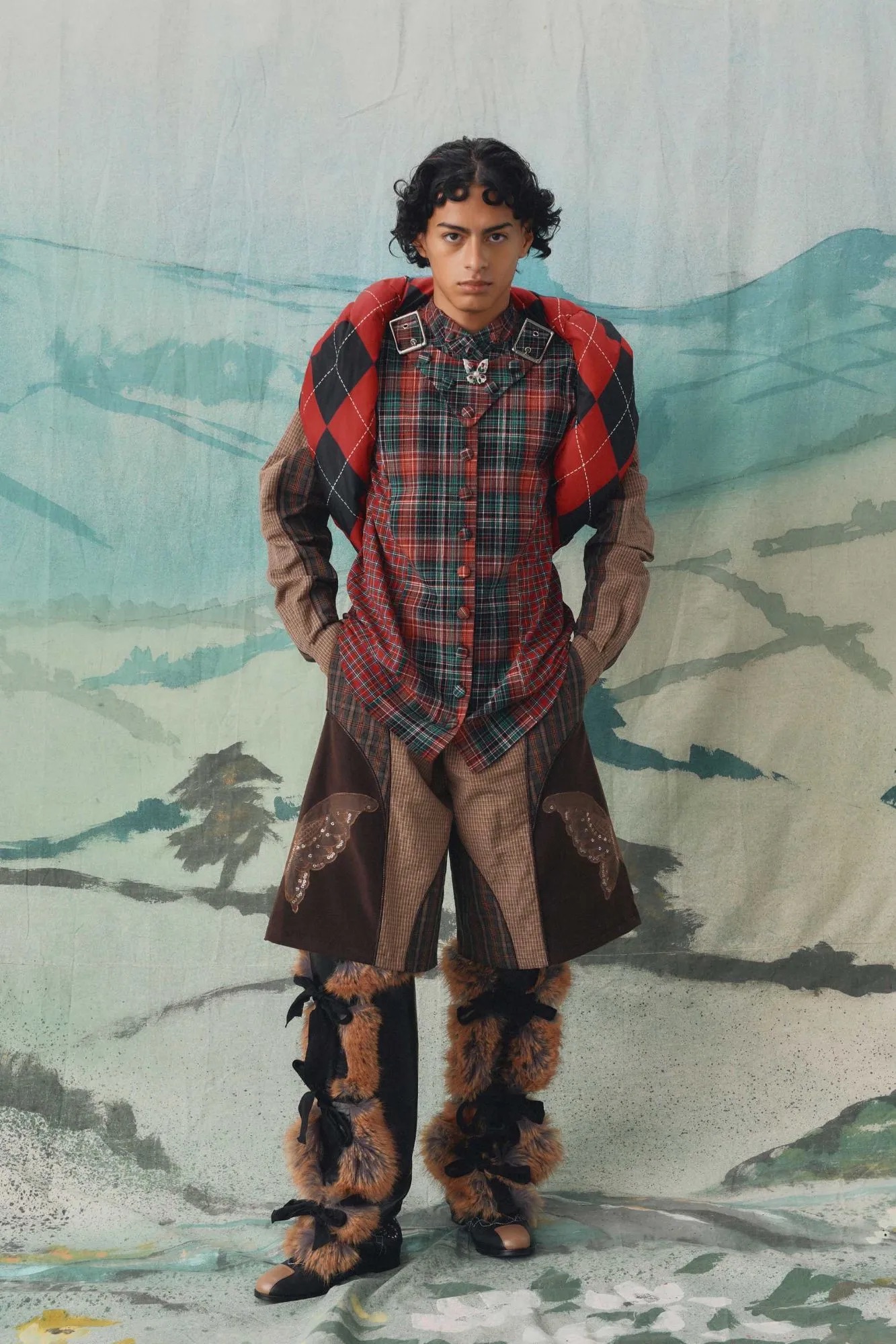 Chopova Lowena 的理念是将英国摄政时代着装与全球高尔夫文化融合,乍听之下似乎有些荒诞,但却展现出该品牌标志性的不拘一格。设计师们将其女主角描述为「正在学习摄政时期俚语并练习长杆击球」,服装也与之呼应:浮雕与菱格纹碰撞,珍珠与灯笼裤并肩而立,19 世纪初的复古风情与高尔夫球场奇妙邂逅。拼接针织上衣、传统苏格兰短裙、短裤以及高尔夫球包夹克无不体现着高尔夫元素。