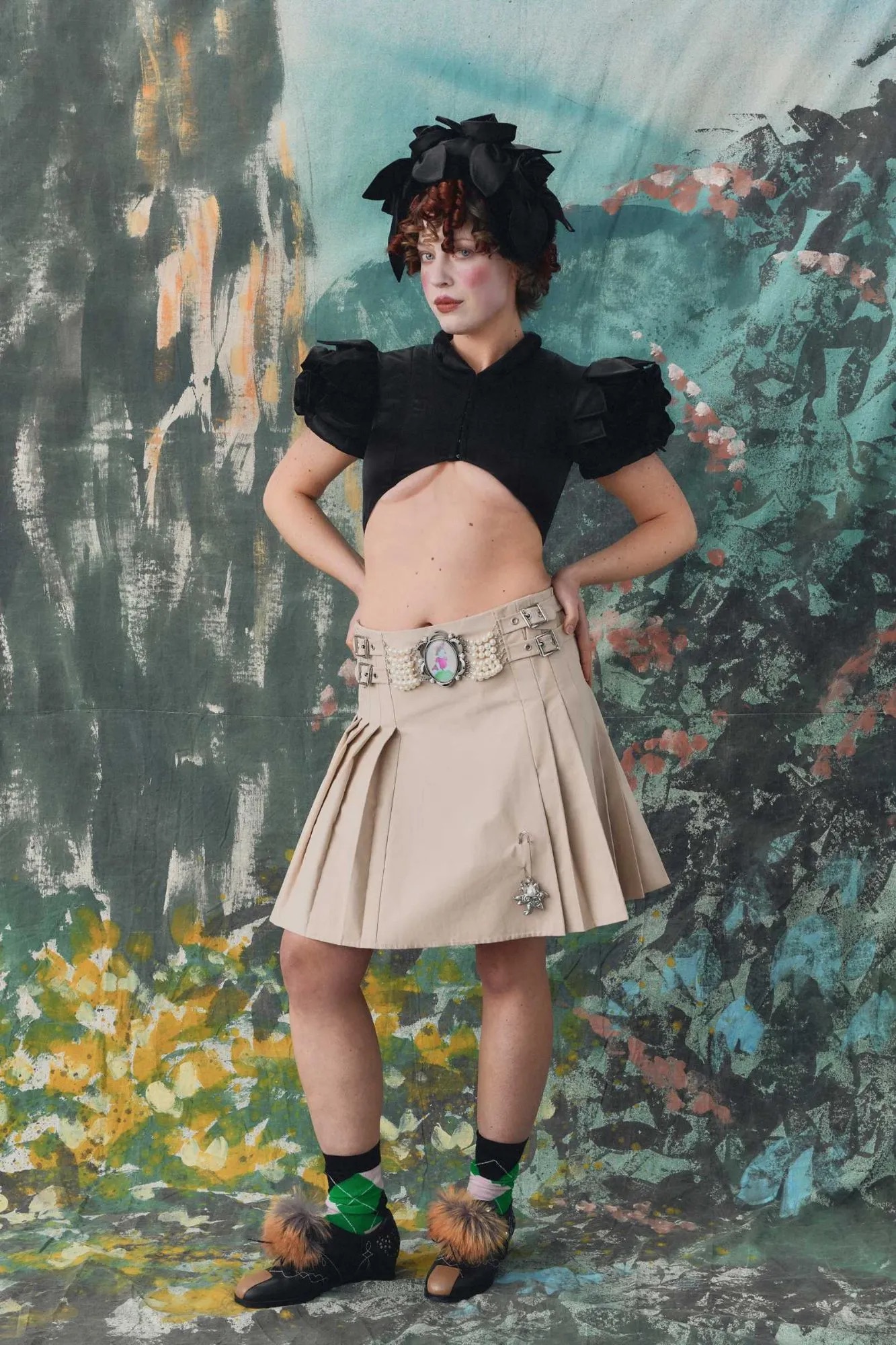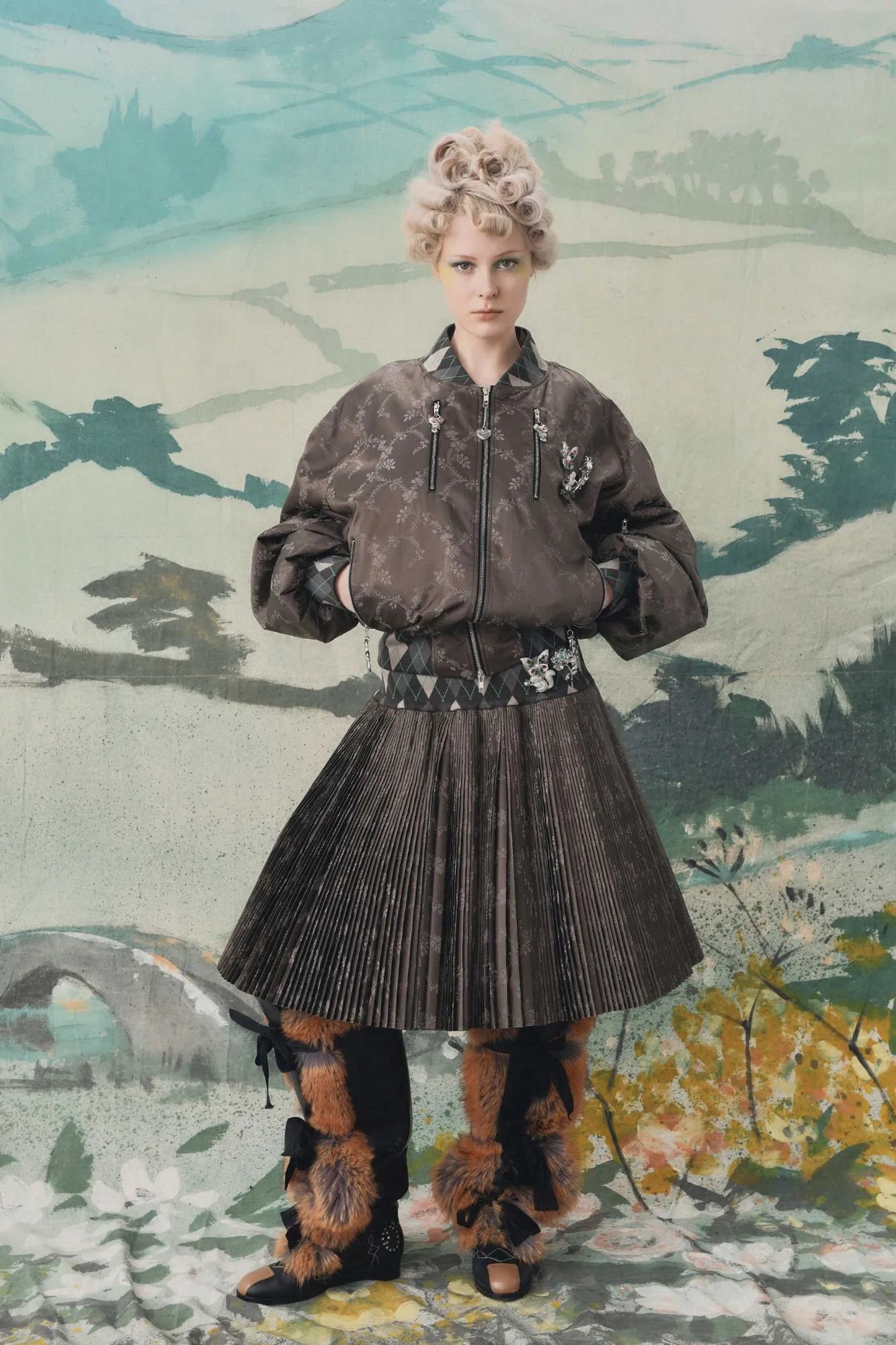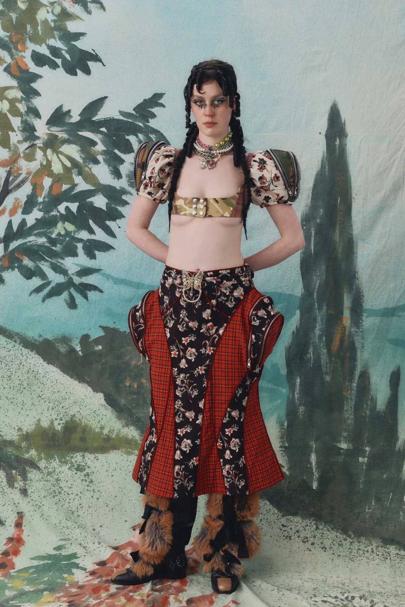 Chopova Lowena 的理念是将英国摄政时代着装与全球高尔夫文化融合,乍听之下似乎有些荒诞,但却展现出该品牌标志性的不拘一格。设计师们将其女主角描述为「正在学习摄政时期俚语并练习长杆击球」,服装也与之呼应:浮雕与菱格纹碰撞,珍珠与灯笼裤并肩而立,19 世纪初的复古风情与高尔夫球场奇妙邂逅。拼接针织上衣、传统苏格兰短裙、短裤以及高尔夫球包夹克无不体现着高尔夫元素。