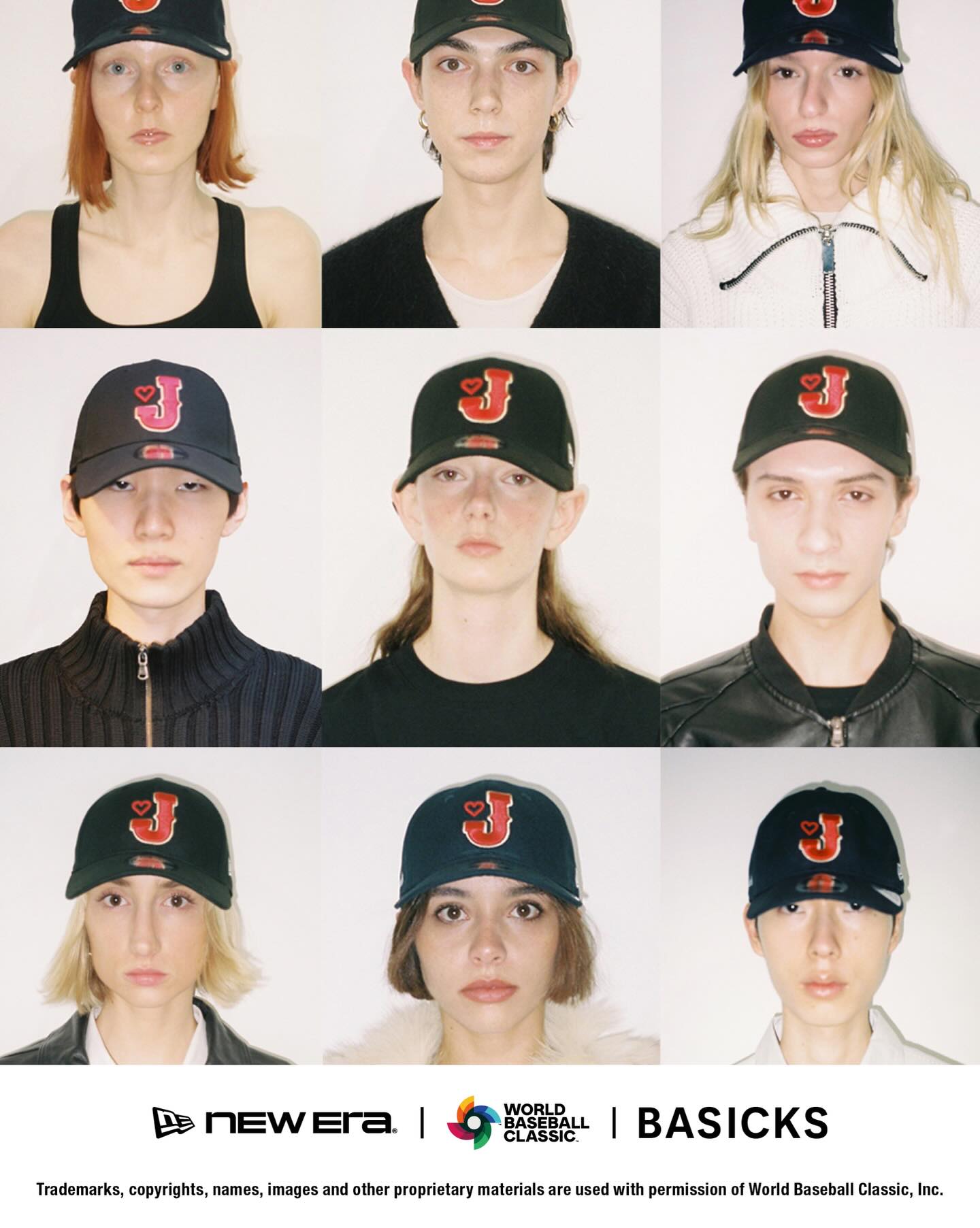 由森川正典设计,以日本国家棒球队「武士日本队(Samurai Japan)」为主题,New Era 与 BASICKS 的合作系列将于 2026 年 2 月 28 日正式发售,旨在纪念 2026 年世界棒球经经典赛。该系列包含三款单品:9 Forty™ 和 Retro Crown 9 Fifty™ 两款帽子,以及一件短袖棉质 T 恤,这也是两个品牌首次在服装领域展开合作。每件单品都饰有球队标志,并点缀以 BASICKS 标志性的心形图案。