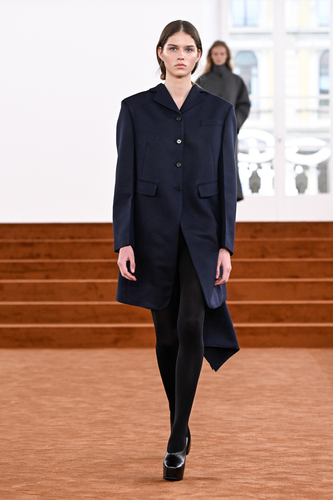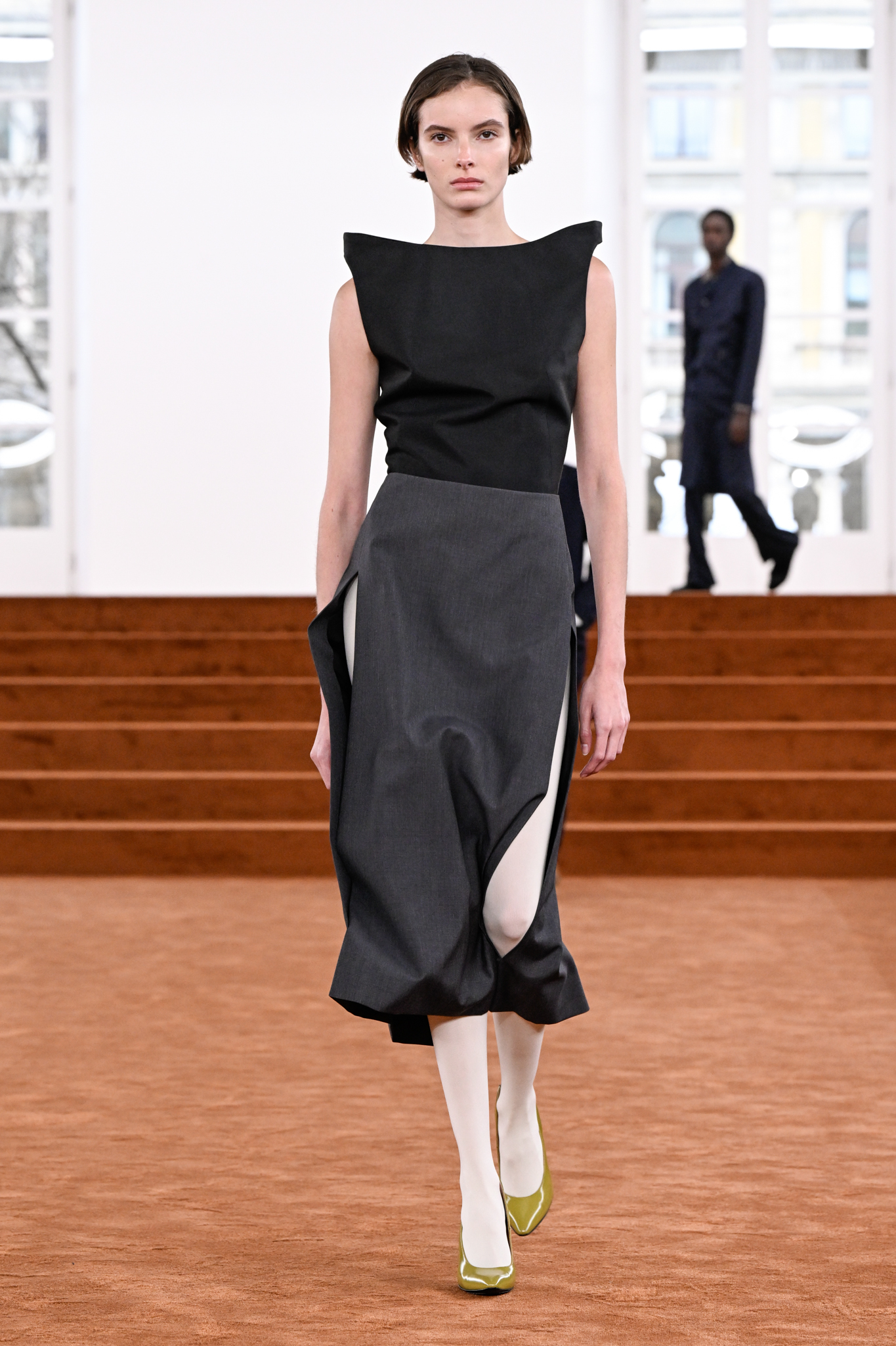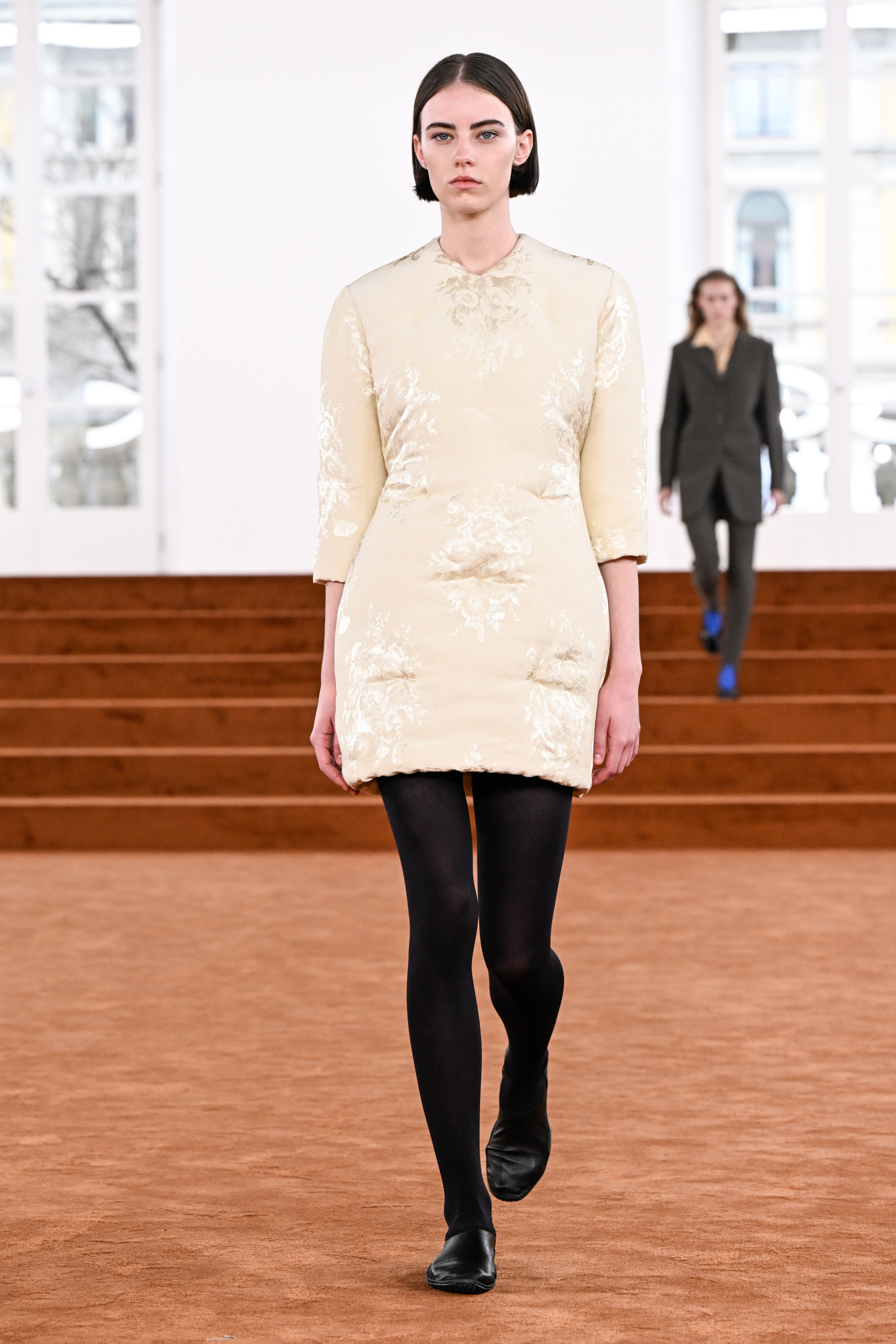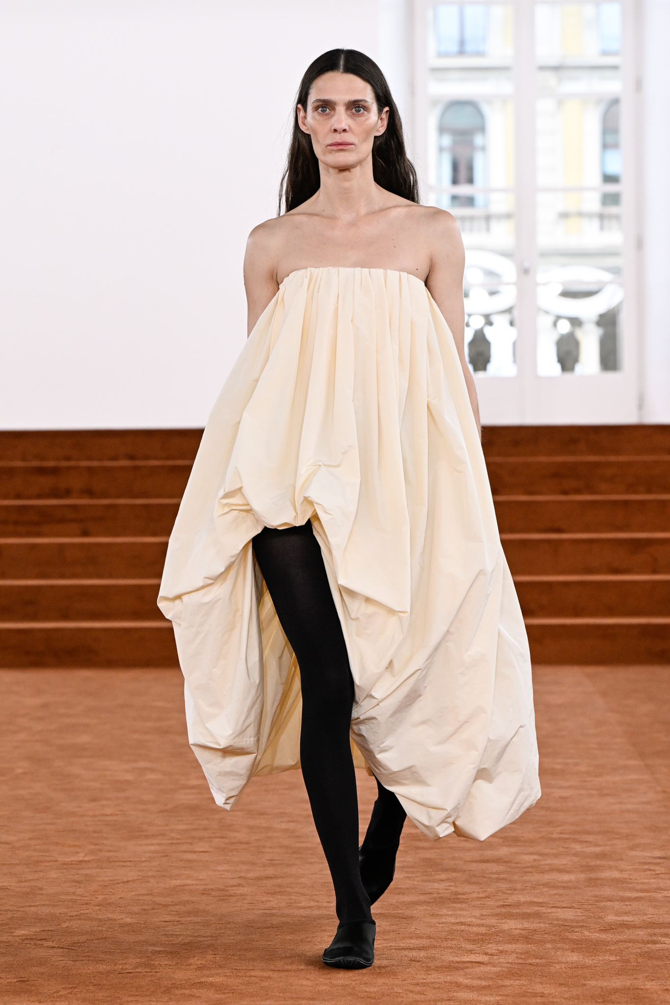 秀前播放的诗歌中青少年逃离家园,成为离家出走者,经历了大城市的危险与疏离,最终回到家。而这种「逃离」也在本季裙装和连衣裙的面料流动与设计中得到了体现,腰部折叠、开衩设计、S 型接缝和泡泡裙下摆等元素,均营造了「逃离」与「回归」的氛围。在这两者之间的家族传统中,Bellotti 正在构建一个包含矛盾的新 JIL SANDER,并让其在这些矛盾中逐渐成为品牌更具本质的表现。
