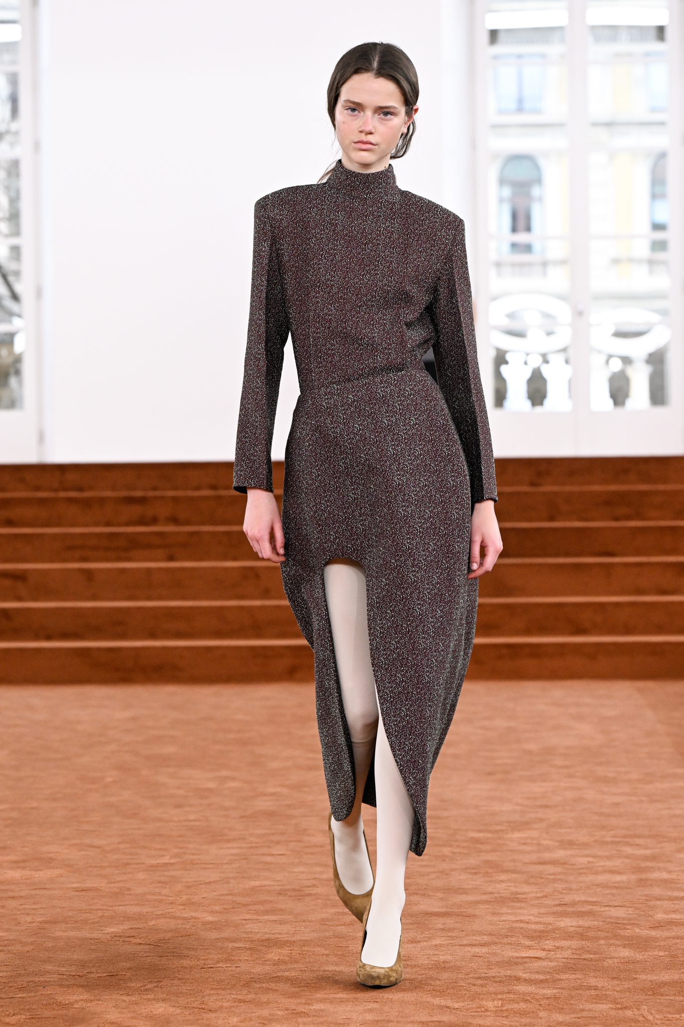 「家」这一概念贯穿了本季的设计思路。作为一名自小受父亲家具制作影响的设计师,Bellotti 理解家庭中家具的功能性与象征性,就像时尚之家通过品牌代码来传达同样的理念。这个秋冬系列,他探索了这些元素的可能性,利用对比性手法,例如高领连衣裙配长侧开衩、绗缝迷你裙等,探索了「过剩」与「本质」之间的平衡。