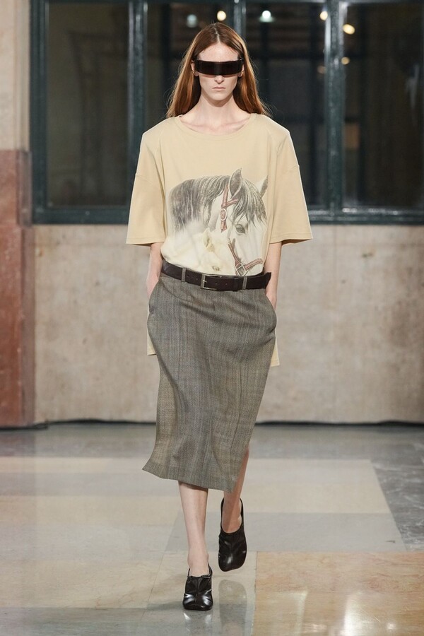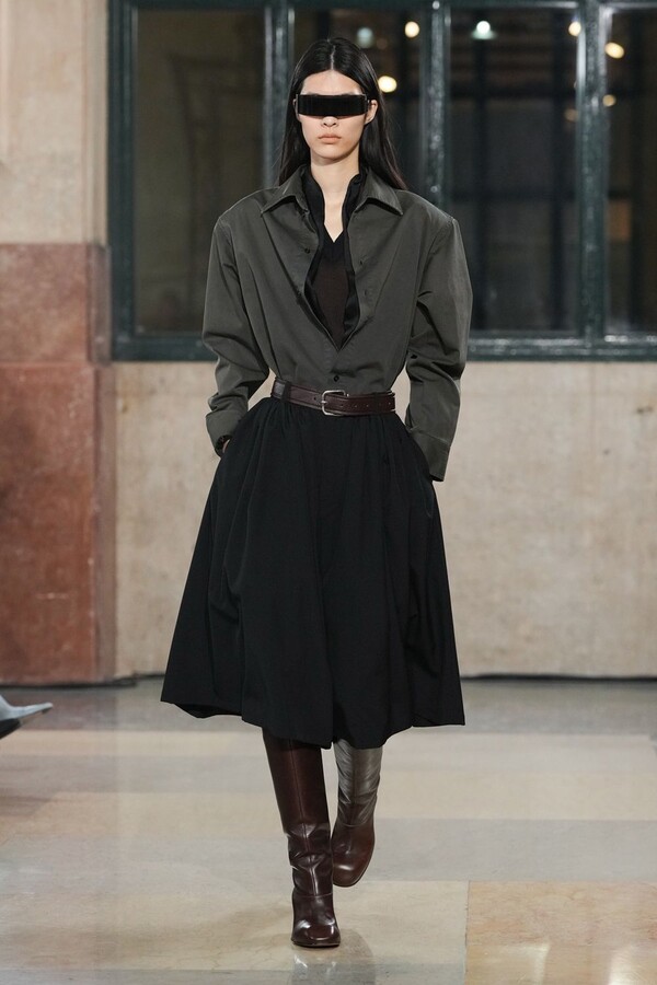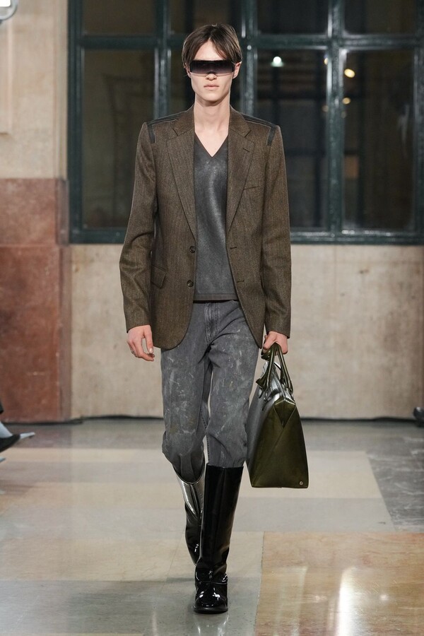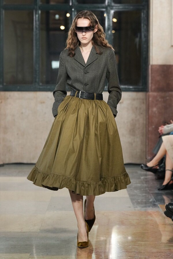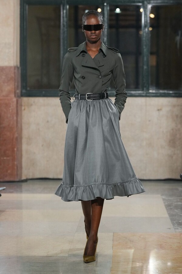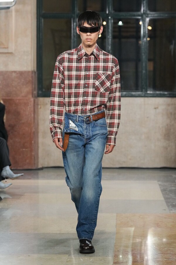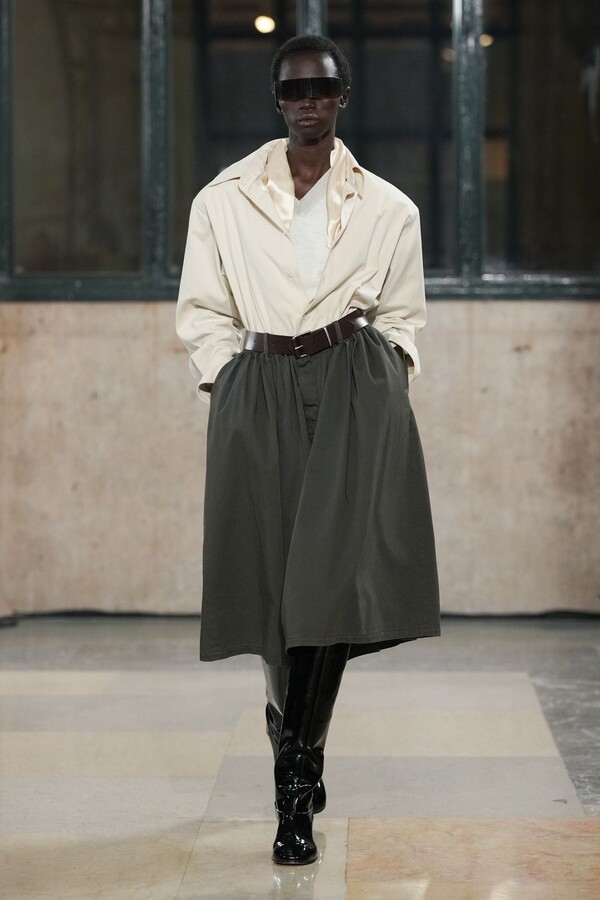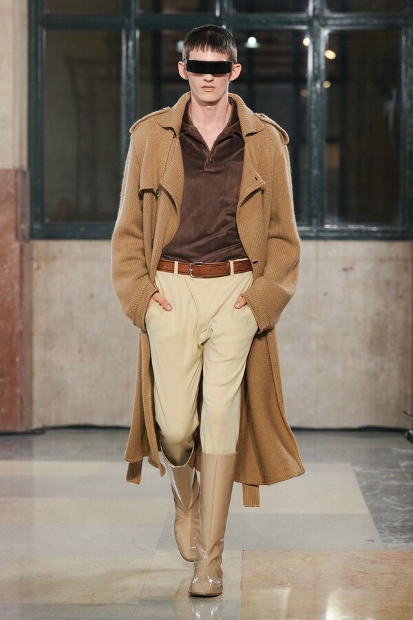 Mm6 Maison Margiela 2026 秋冬系列秀在米兰中央车站的候车室举行。这一季依旧贯彻 Martin Margiela 将寻常变为非凡的设计风格。可以看到外套下摆向上卷起并用按扣固定,以防止被自行车溅到水等日常意外弄脏;铅笔裙实际上是露背围裙,为了遮掩身材而穿在长款 T 恤外面;衬衫的缝线隐约可见原本的轭形领口。牛仔裤作为最常见的日常服装也得到了充分演绎:男款牛仔裤采用双层腰带设计,外层腰带若隐若现;女款的高腰锥形裤则重现了 20 世纪 80 年代的风格。