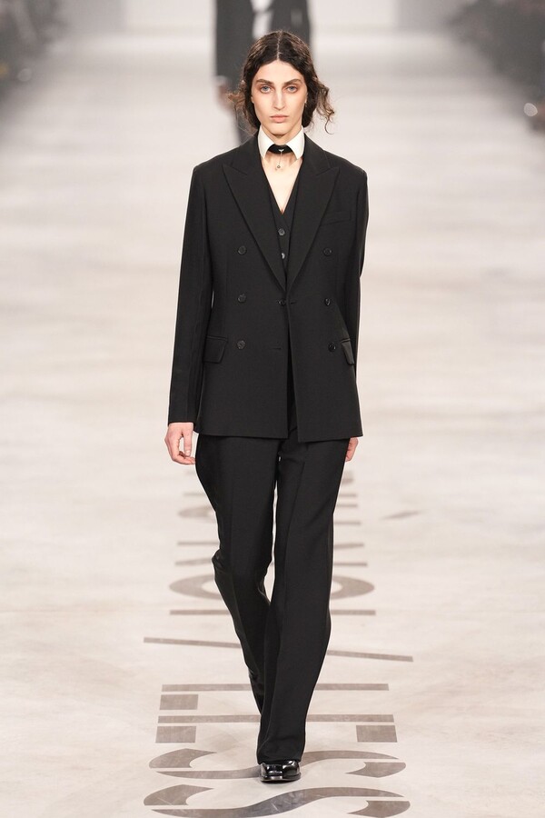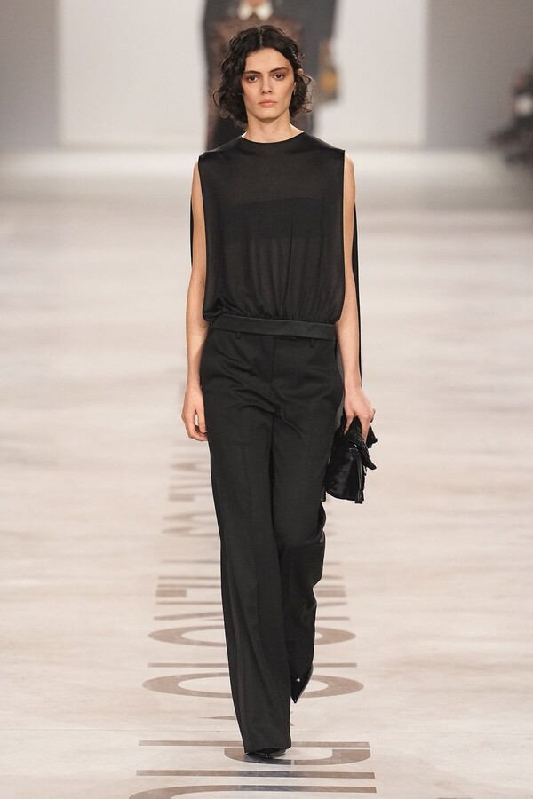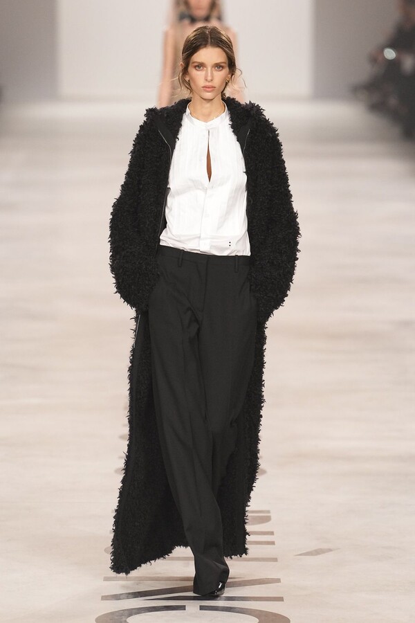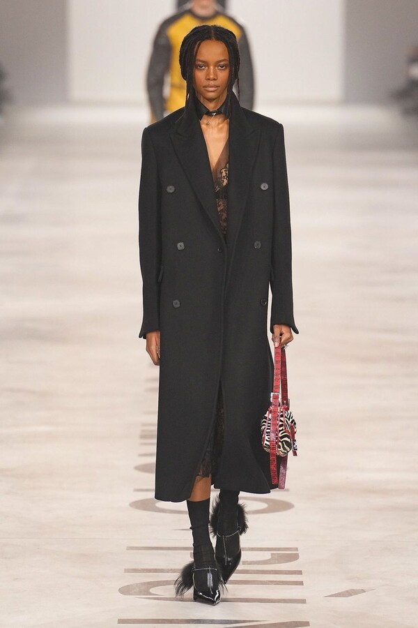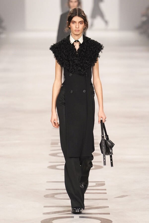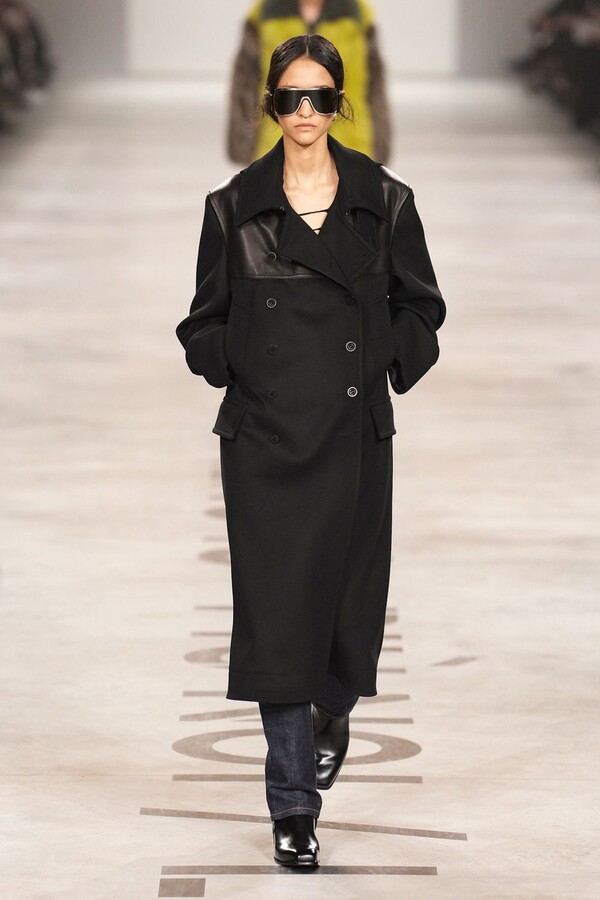 Maria Grazia Chiuri 称她将重点放在轮廓上。最终呈现的 2026 秋冬系列以鲜明的几何造型为核心,通过深 V 领口和腰部以下收窄的裙摆或外套,勾勒出 X 形轮廓。这种结构曾在 Maria Grazia Chiuri 执掌 Valentino 和 Dior 时出现过,在此被重新诠释并融入 FENDI 的经典面料之中。男女装的风格遵循着相同手法:双排扣裙装、单排扣西装、双层牛仔面料以及驴皮大衣都为男女皆宜款,凸显了男女装统一的风格。