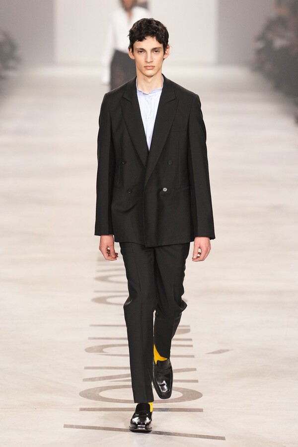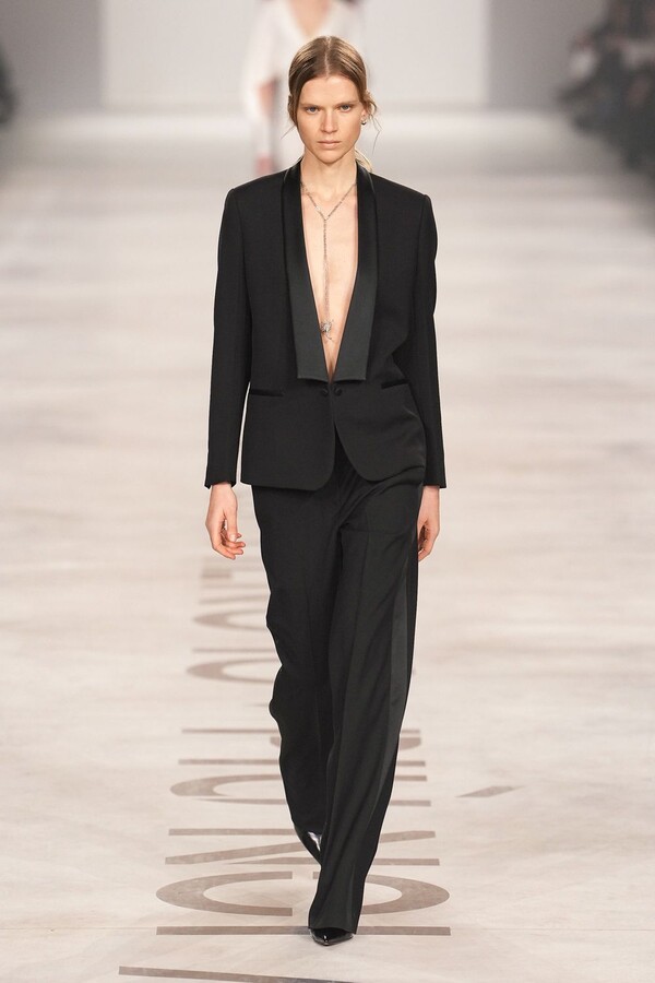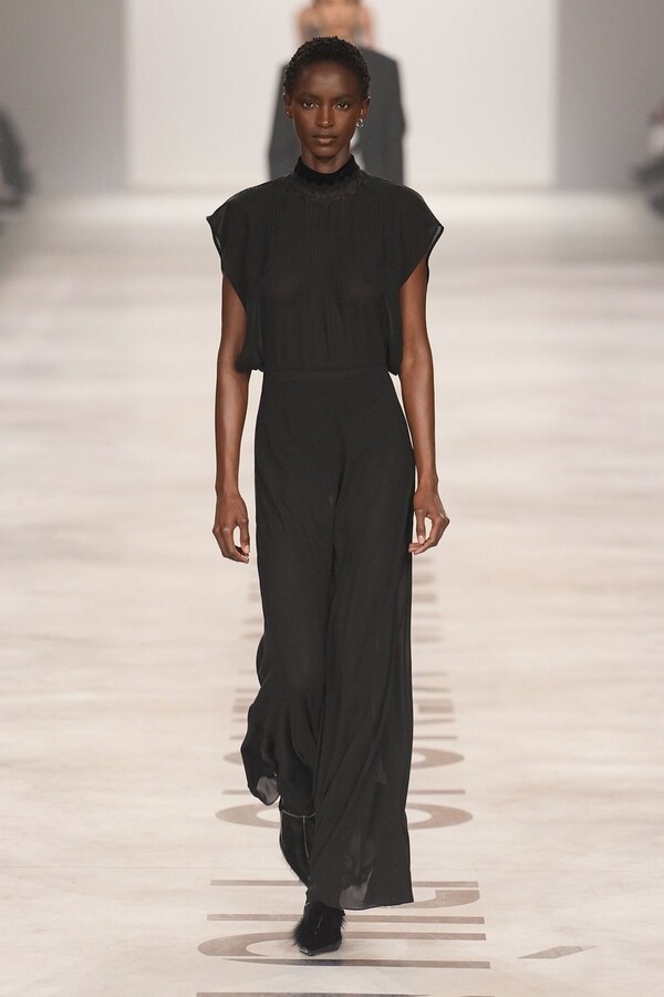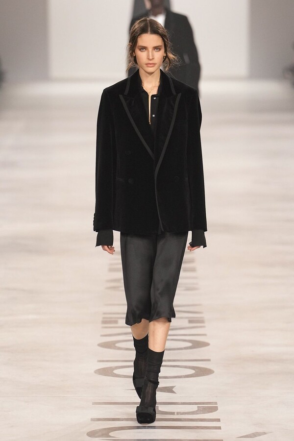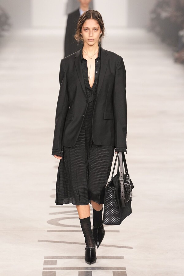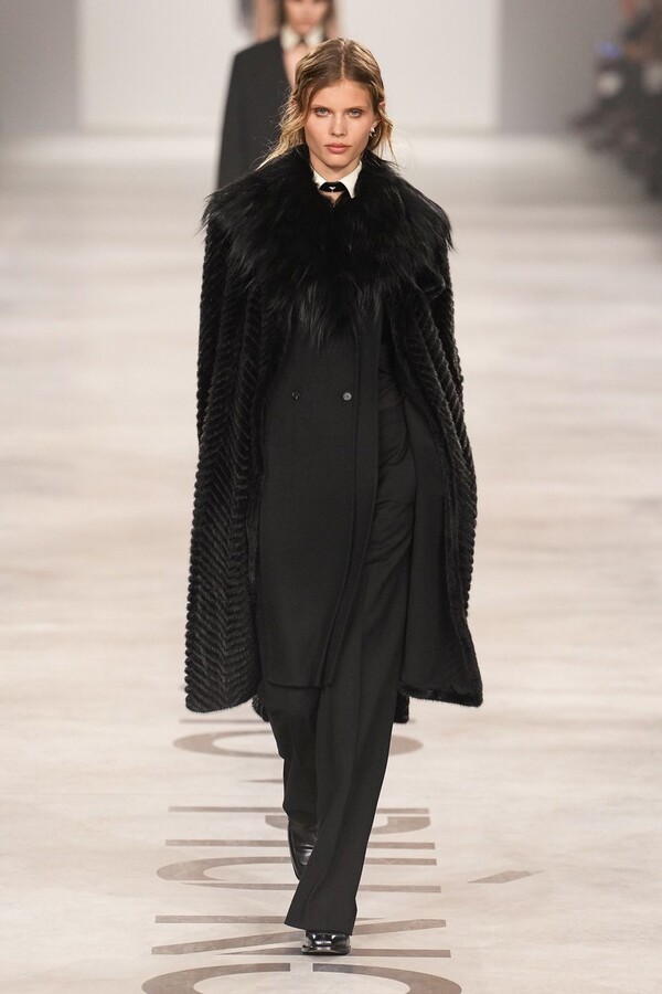 Maria Grazia Chiuri 称她将重点放在轮廓上。最终呈现的 2026 秋冬系列以鲜明的几何造型为核心,通过深 V 领口和腰部以下收窄的裙摆或外套,勾勒出 X 形轮廓。这种结构曾在 Maria Grazia Chiuri 执掌 Valentino 和 Dior 时出现过,在此被重新诠释并融入 FENDI 的经典面料之中。男女装的风格遵循着相同手法:双排扣裙装、单排扣西装、双层牛仔面料以及驴皮大衣都为男女皆宜款,凸显了男女装统一的风格。