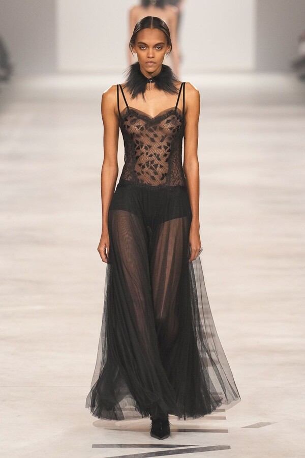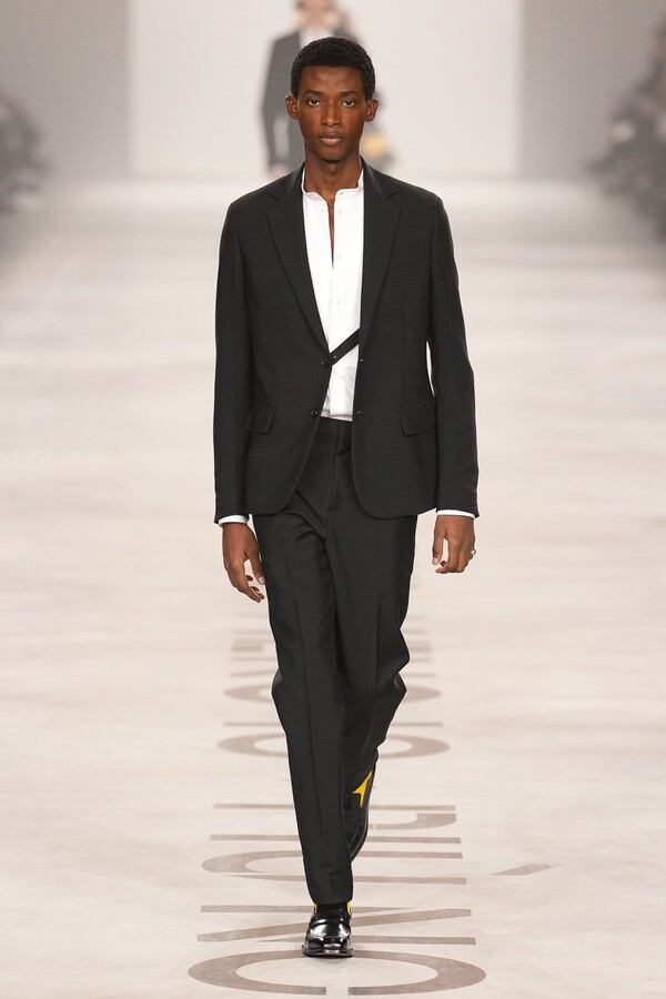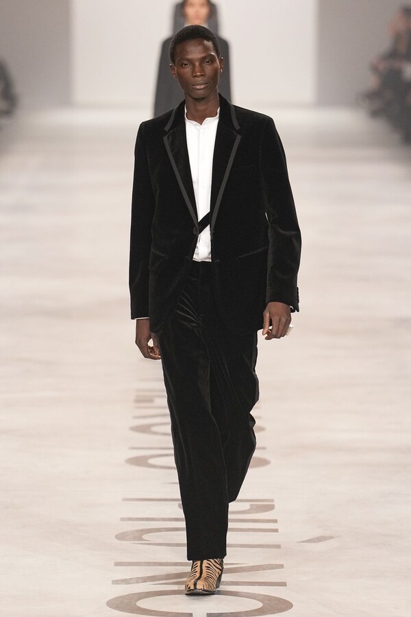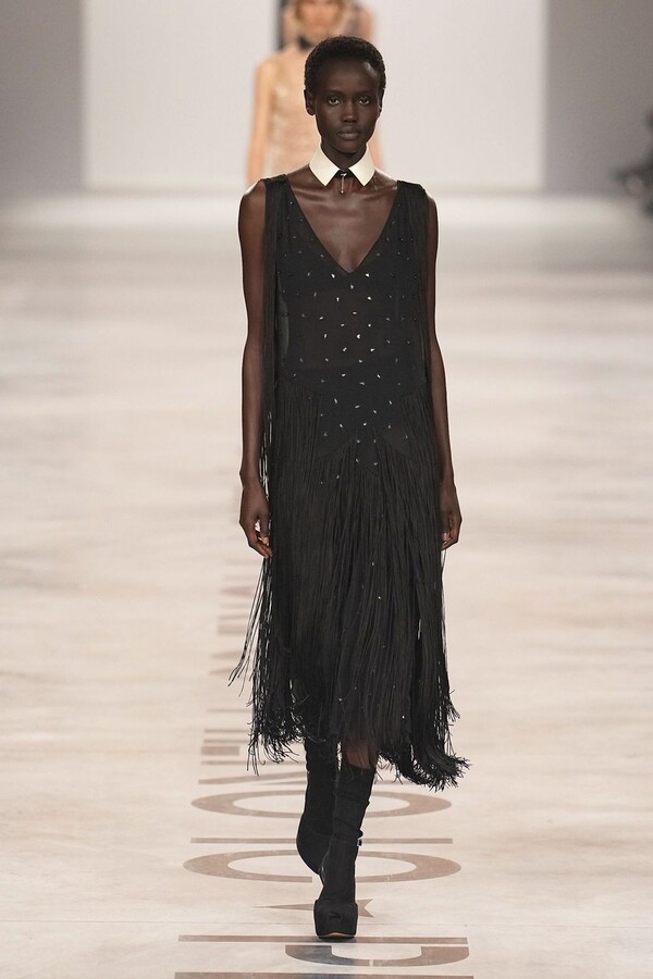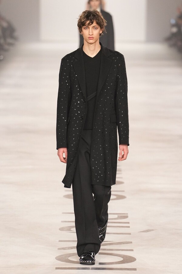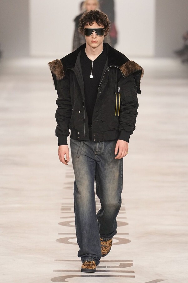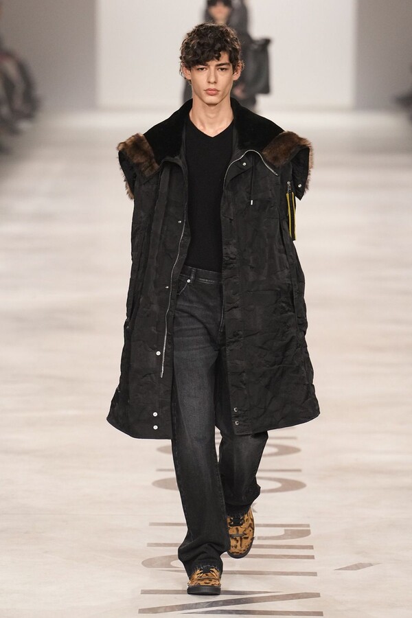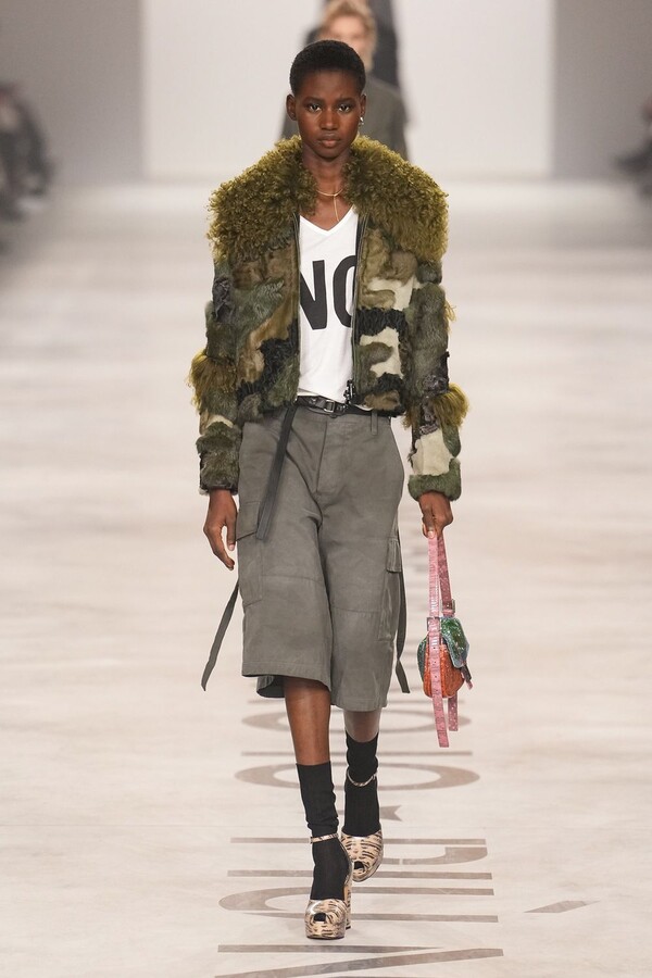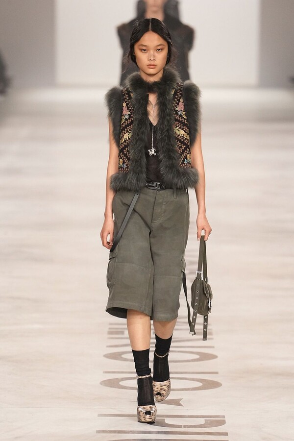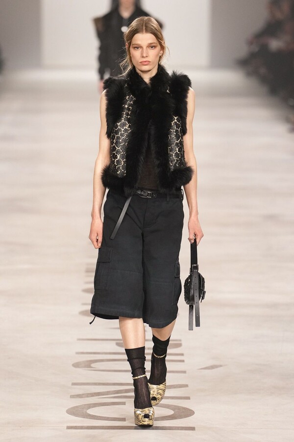 最具争议的复兴体现在皮草上。该元素一直是 FENDI 的拿手好戏,但近年来在市场上颇为谨慎。Maria Grazia Chiuri 毫不掩饰地将其重新启用。饰边、领子和流苏点缀着风衣和马甲;黑色长皮大衣由手工裁剪的花卉皮草拼接而成,效果宛如蕾丝;女式夹克将皮草碎屑嵌入森林迷彩面料中,展现出精湛的工艺。男装则推出了极为奢华的皮草造型——狐狸毛披肩、绿色染色的长毛西装外套、毛茸茸的拼接服饰,巧妙颠覆了炫耀式的着装风格。