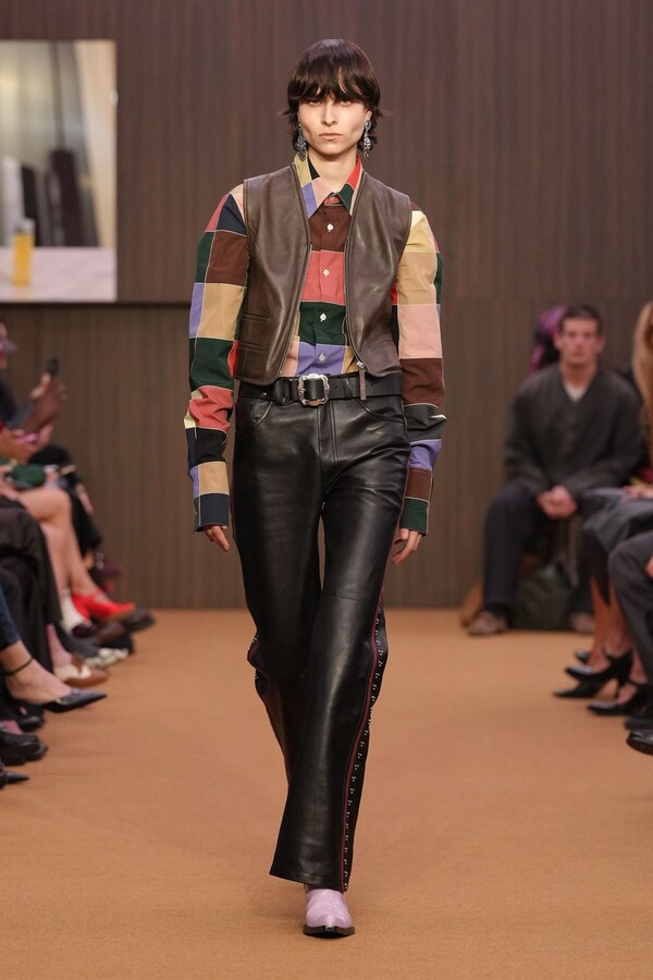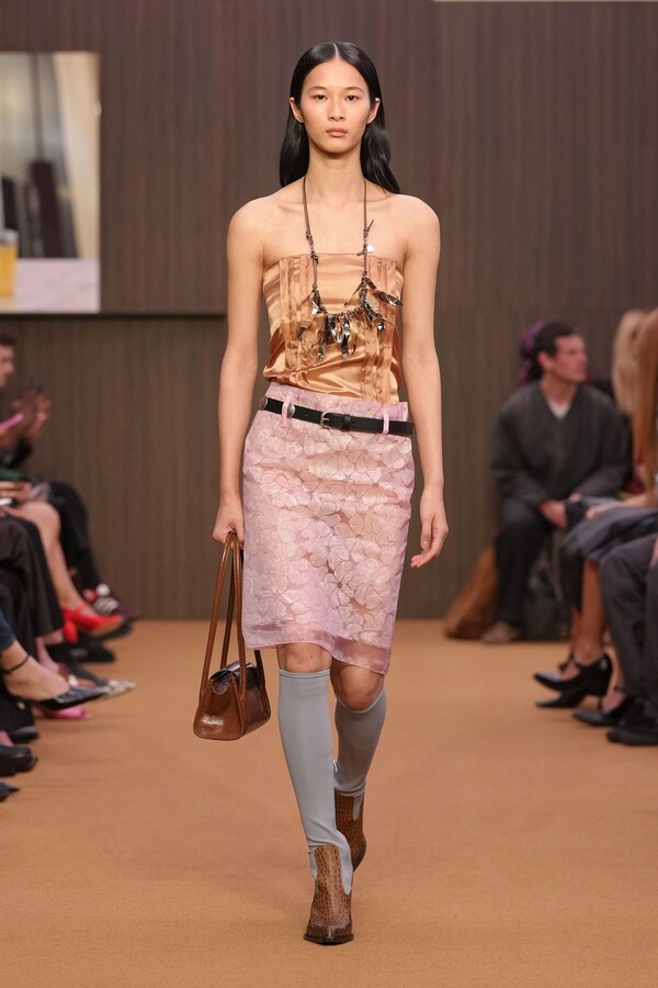 品牌档案的研究延伸至上世纪 90 年代末和本世纪初,这些时期的服装轮廓至今仍具有现代感。Meryll Rogge 从中提炼的并非情怀而是比例:小巧利落的剪裁外套、贴合的肩部线条、柔和勾勒的腰线、及膝的裙摆——一切都展现出既严谨又低调自信的轮廓。同时,她的设计略带朋克风格,铆钉、扣件等兼具功能性和装饰性的五金配件被刻意用作视觉点缀,给整体注入了新的硬朗气质。