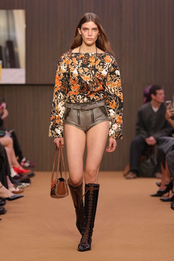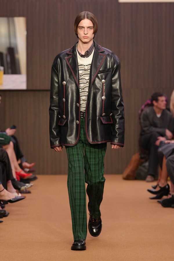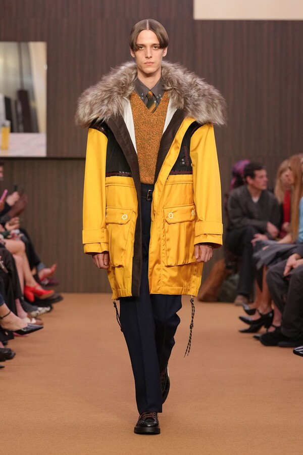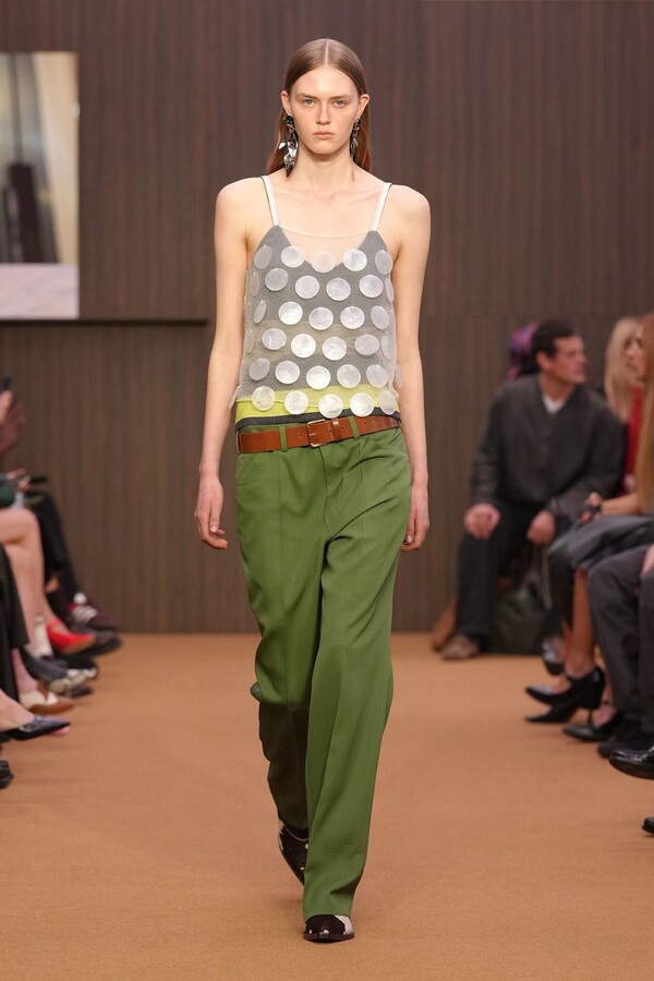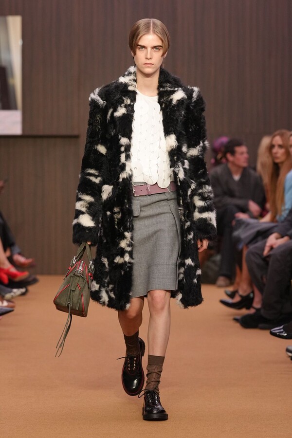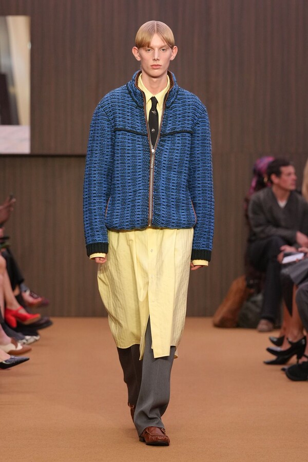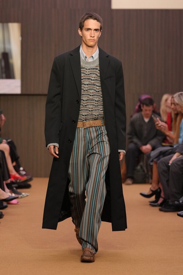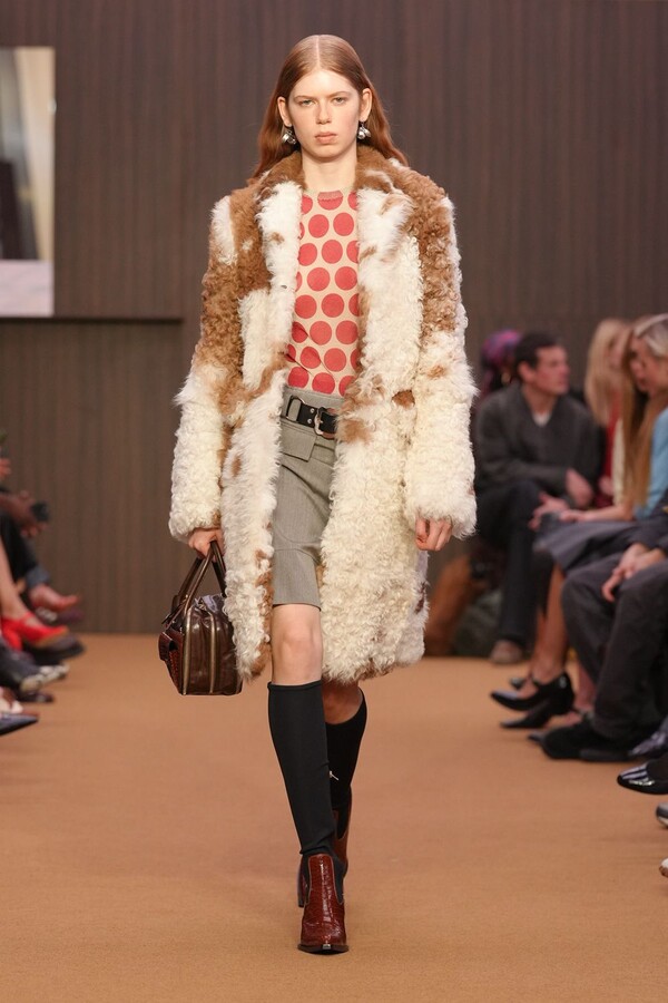 纹理,作为 Marni 的标志性元素以触感十足的方式再次呈现,羊毛和山羊短外套充满温暖,毛茸茸的表面则呼应了品牌经典设计。印花则被更加精准的构图重新演绎:条纹图案更加清晰,圆点以超大圆盘的形式重新出现,花卉图案则保持了鲜明的现代主义风格。