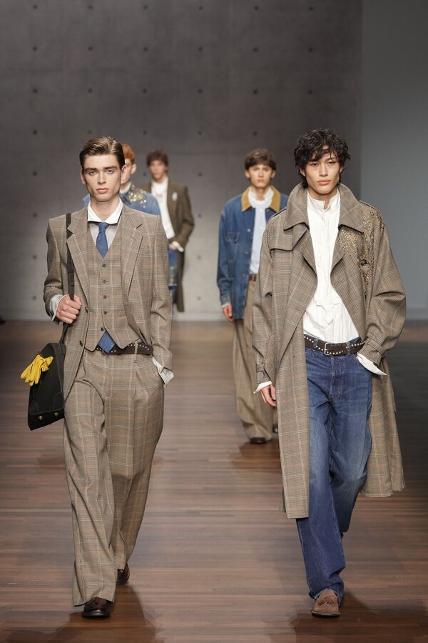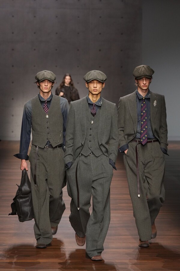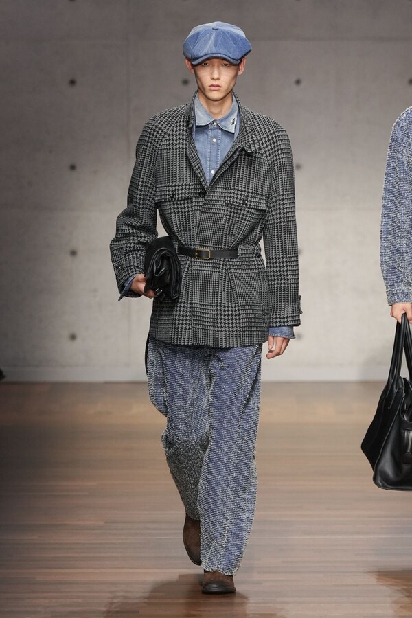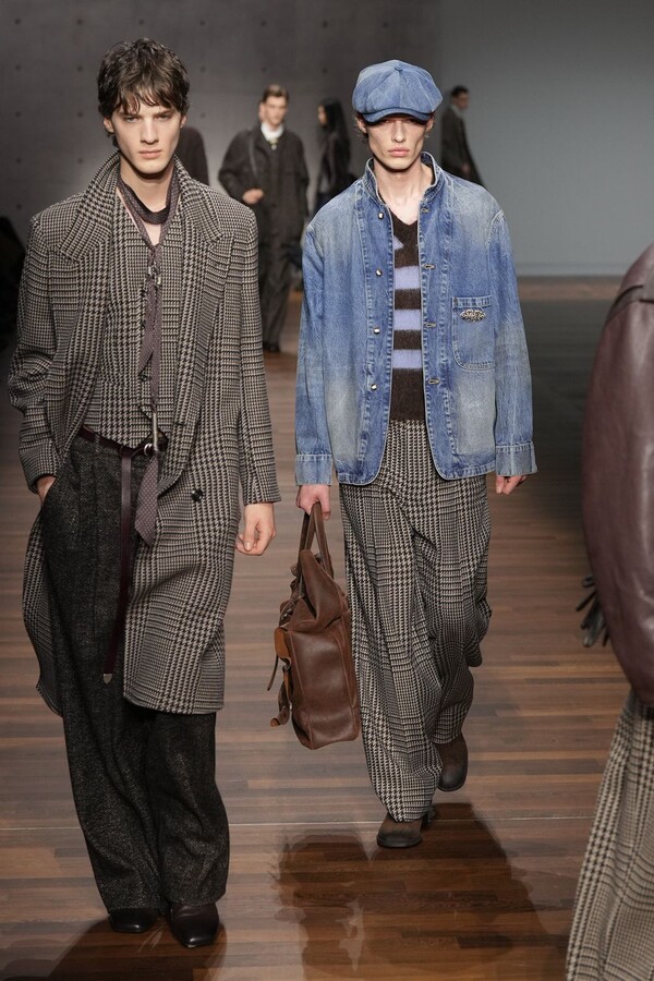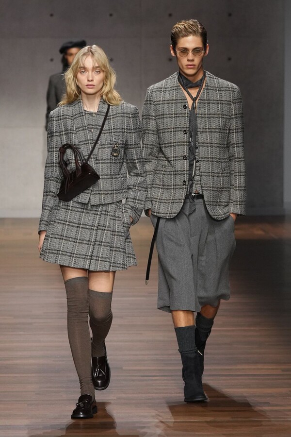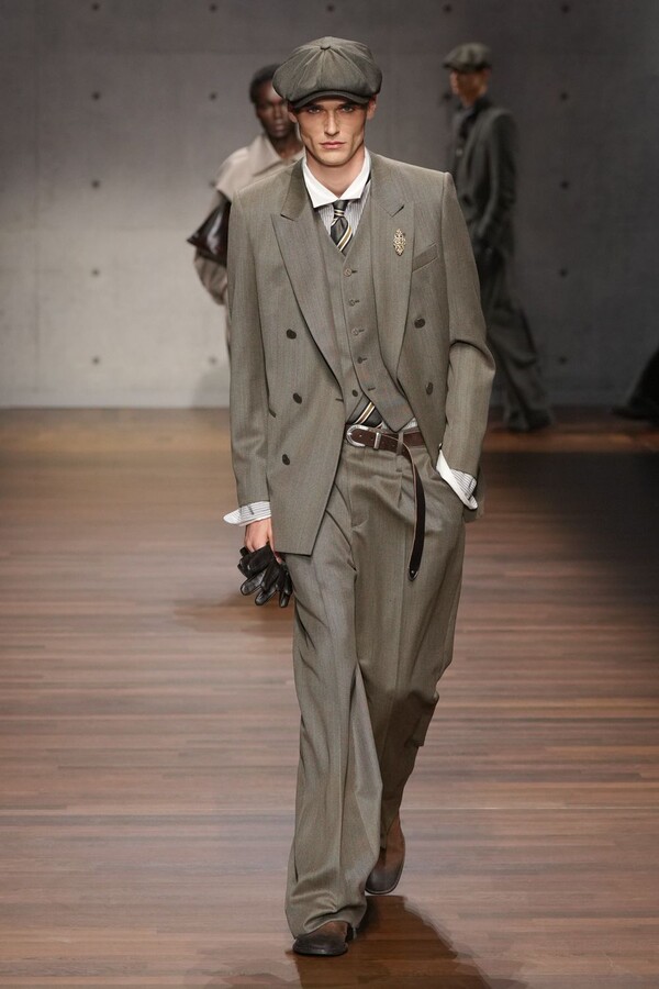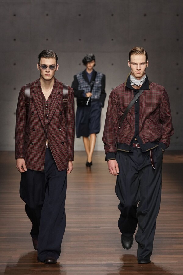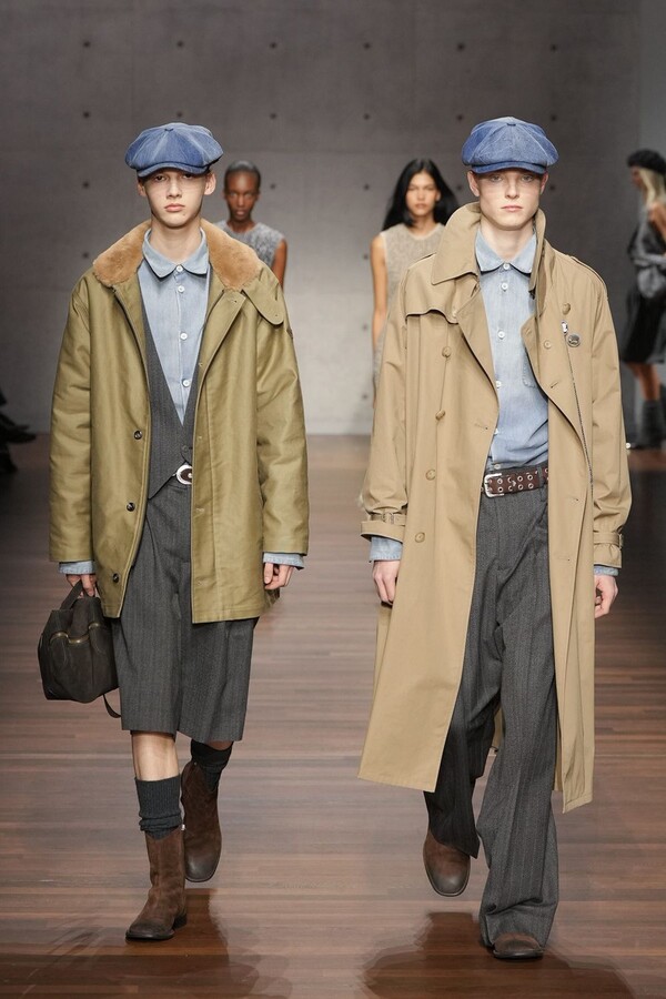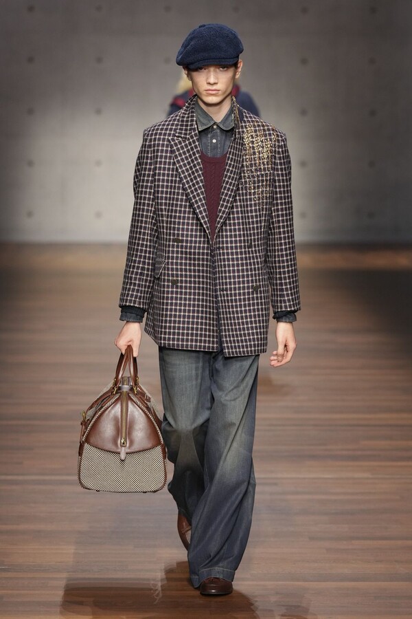 男装大量借鉴了英伦元素。粗花呢、人字纹、格纹和千鸟格纹勾勒出流畅的西装线条和挺括的大衣廓形。宽松的牛仔工装夹克搭配撞色领子和饰有口袋链的格纹三件套西装,颇具嬉皮士风格。学院风造型则以海军蓝大衣搭配 V 领毛衣,展现出学院派的严谨风格。廓形大衣与百慕大短裤的搭配让人想到乡村绅士;格纹夹克搭配平顶帽,则让人联想到反映 20 世纪 20 年代的《浴血黑帮》。