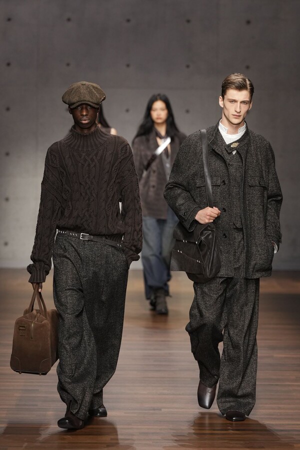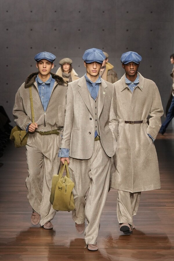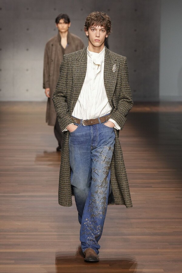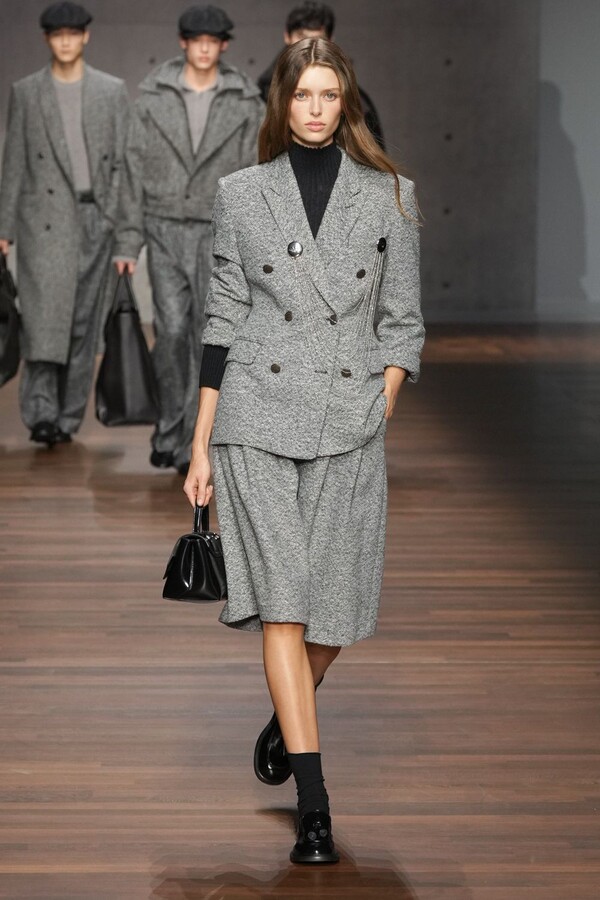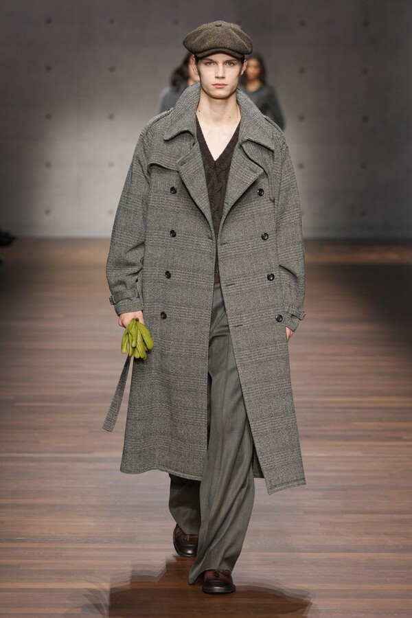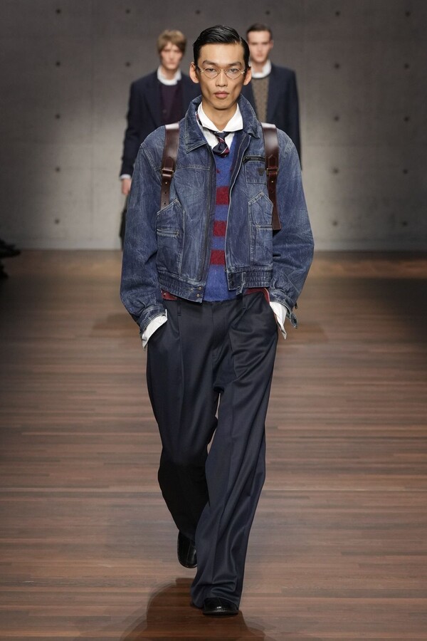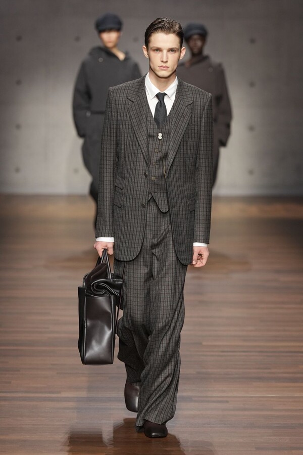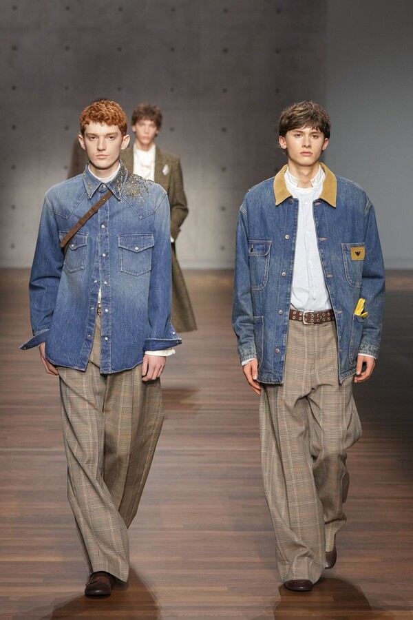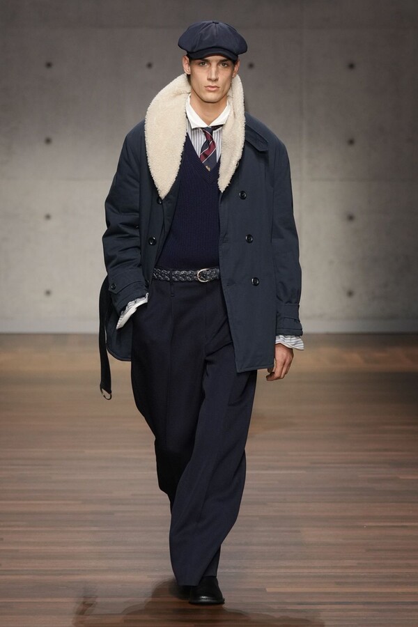 男装大量借鉴了英伦元素。粗花呢、人字纹、格纹和千鸟格纹勾勒出流畅的西装线条和挺括的大衣廓形。宽松的牛仔工装夹克搭配撞色领子和饰有口袋链的格纹三件套西装,颇具嬉皮士风格。学院风造型则以海军蓝大衣搭配 V 领毛衣,展现出学院派的严谨风格。廓形大衣与百慕大短裤的搭配让人想到乡村绅士;格纹夹克搭配平顶帽,则让人联想到反映 20 世纪 20 年代的《浴血黑帮》。