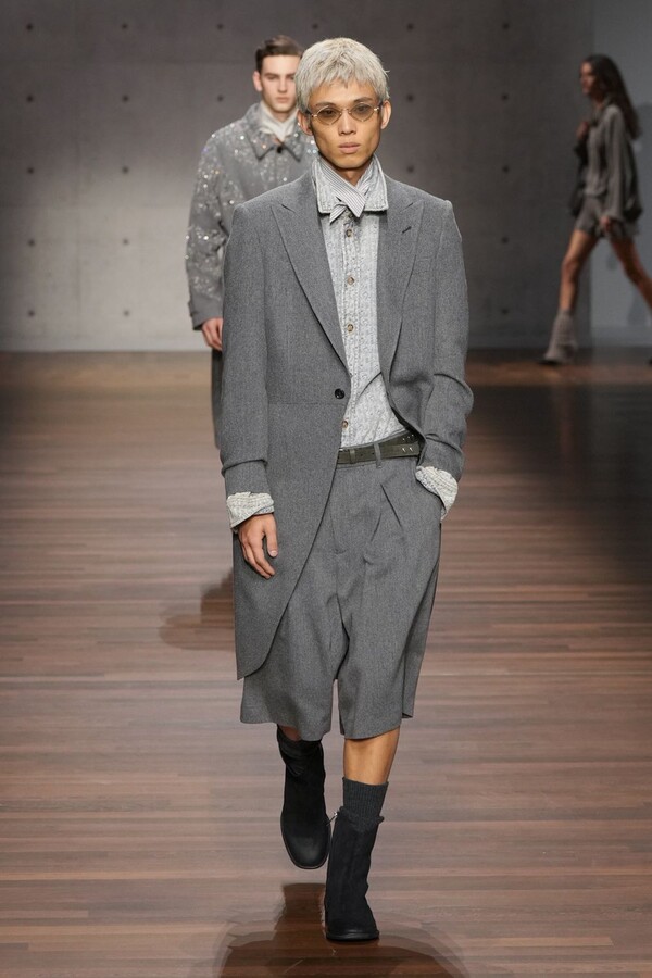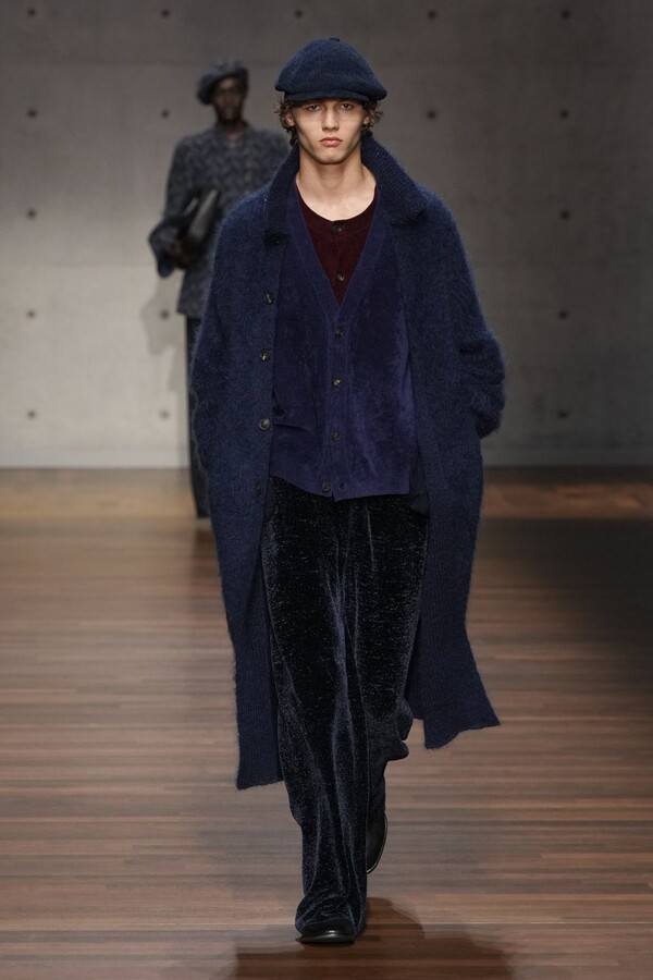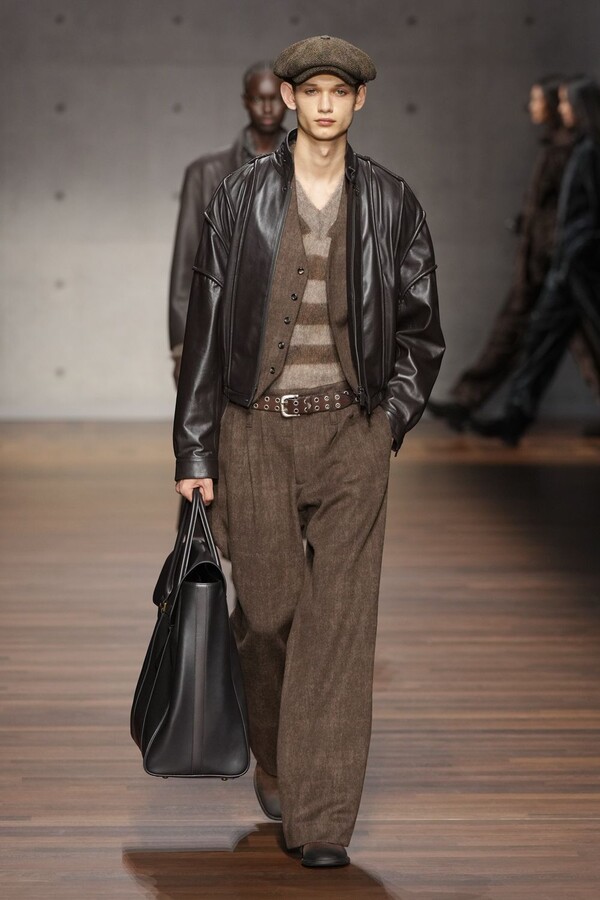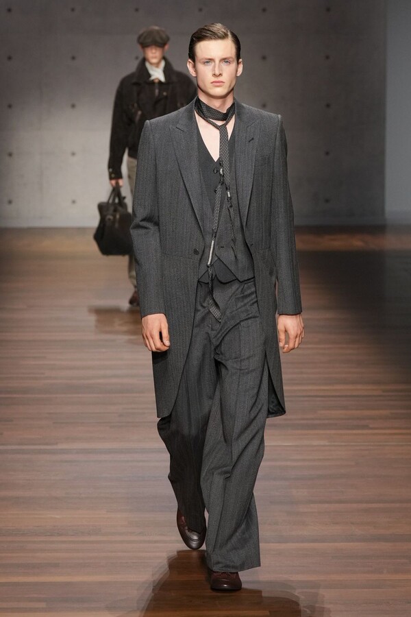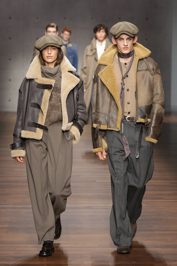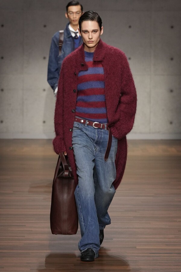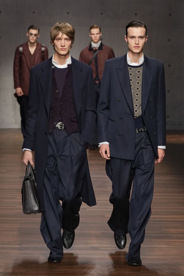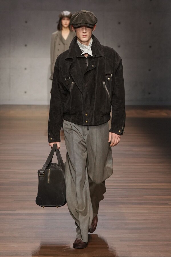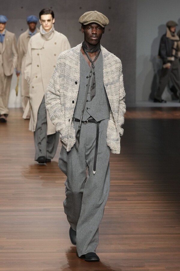 男装大量借鉴了英伦元素。粗花呢、人字纹、格纹和千鸟格纹勾勒出流畅的西装线条和挺括的大衣廓形。宽松的牛仔工装夹克搭配撞色领子和饰有口袋链的格纹三件套西装,颇具嬉皮士风格。学院风造型则以海军蓝大衣搭配 V 领毛衣,展现出学院派的严谨风格。廓形大衣与百慕大短裤的搭配让人想到乡村绅士;格纹夹克搭配平顶帽,则让人联想到反映 20 世纪 20 年代的《浴血黑帮》。