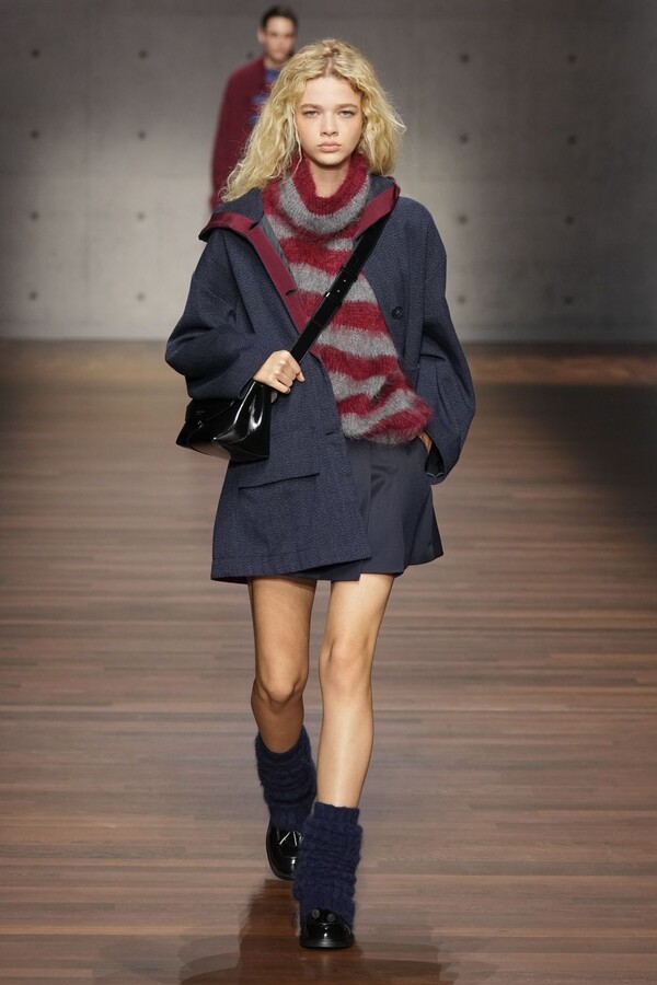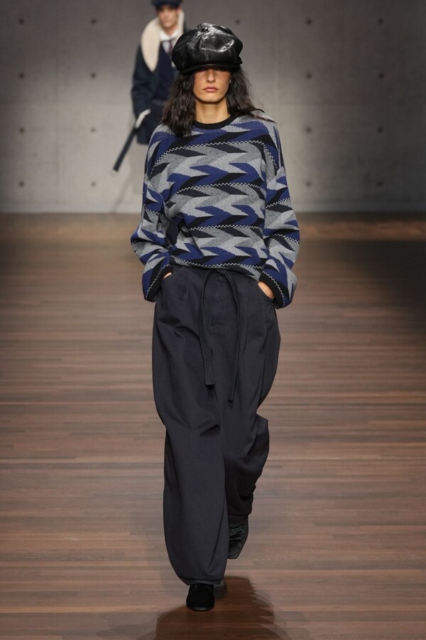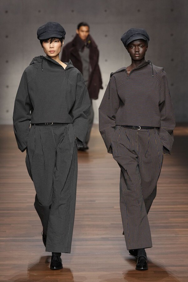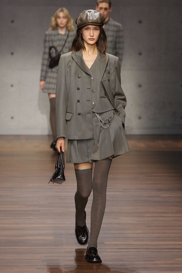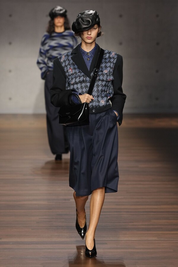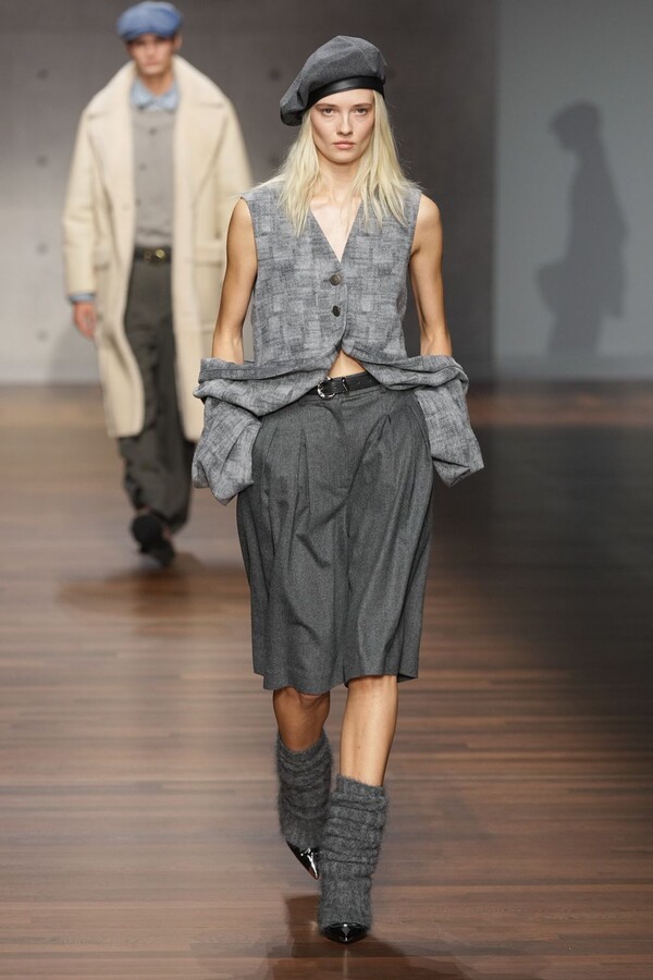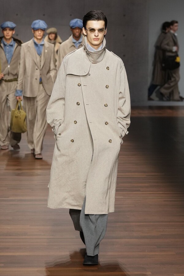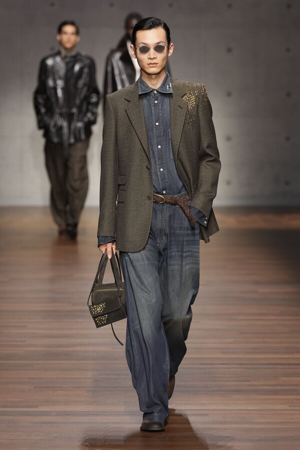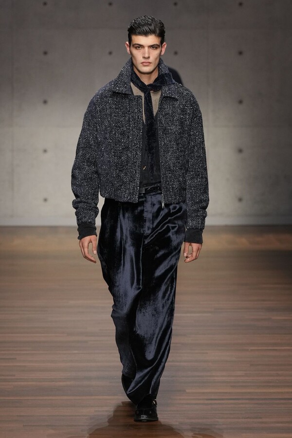 男装大量借鉴了英伦元素。粗花呢、人字纹、格纹和千鸟格纹勾勒出流畅的西装线条和挺括的大衣廓形。宽松的牛仔工装夹克搭配撞色领子和饰有口袋链的格纹三件套西装,颇具嬉皮士风格。学院风造型则以海军蓝大衣搭配 V 领毛衣,展现出学院派的严谨风格。廓形大衣与百慕大短裤的搭配让人想到乡村绅士;格纹夹克搭配平顶帽,则让人联想到反映 20 世纪 20 年代的《浴血黑帮》。